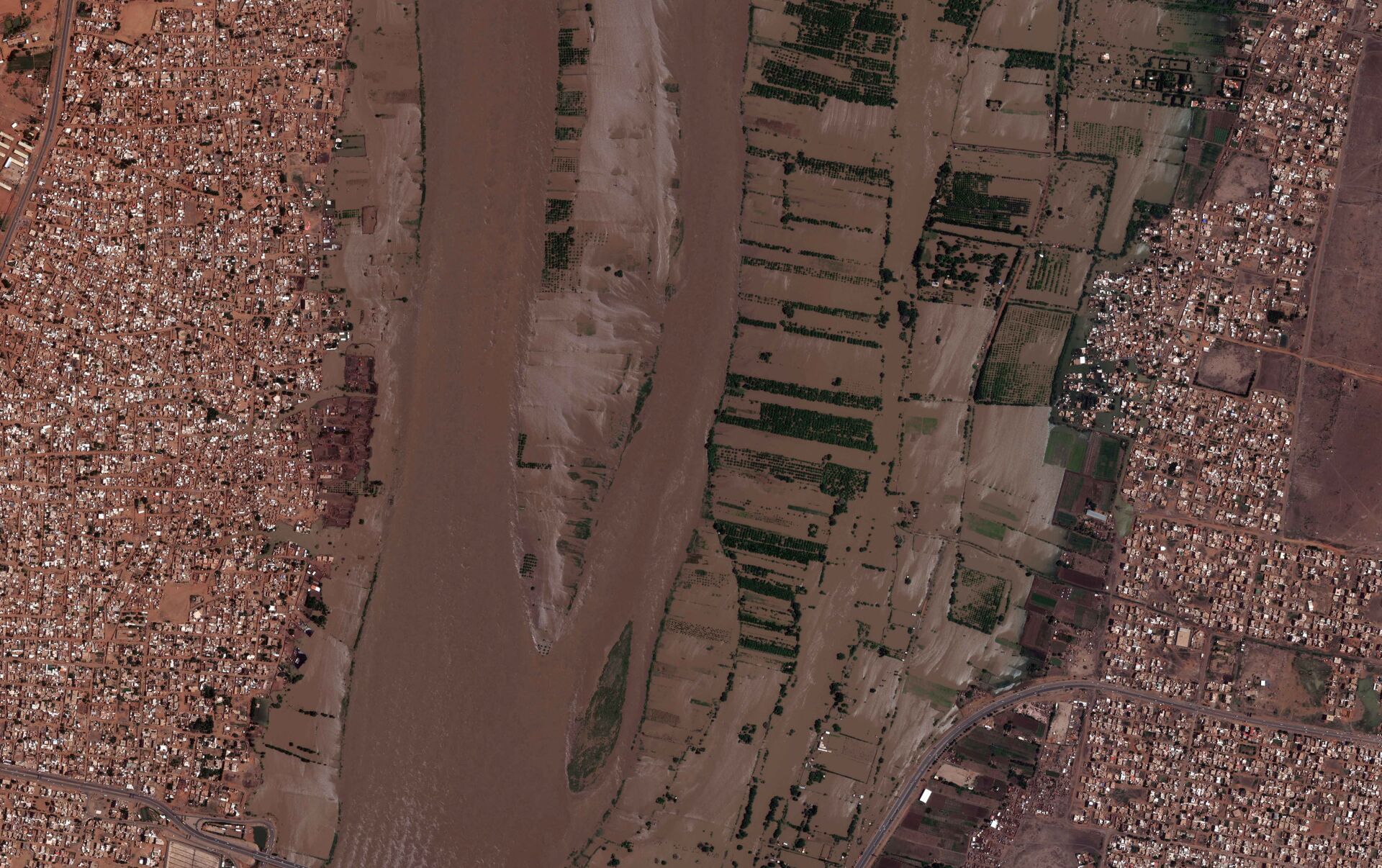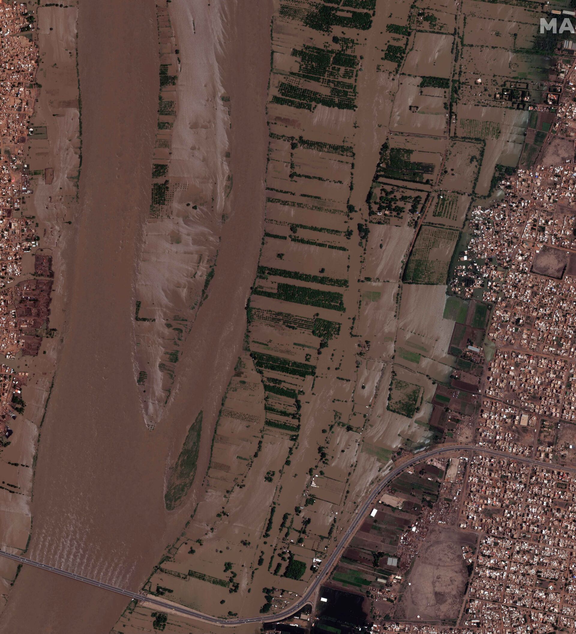 © REUTERS / MAXAR TECHNOLOGIESصورة من الأقمار الصناعية وفرتها شركة "ماكسار" تُظهر جسر الحلفاية والكدرو أثناء فيضانات ضخمة في الخرطوم، السودان 5 سبتمبر 2020