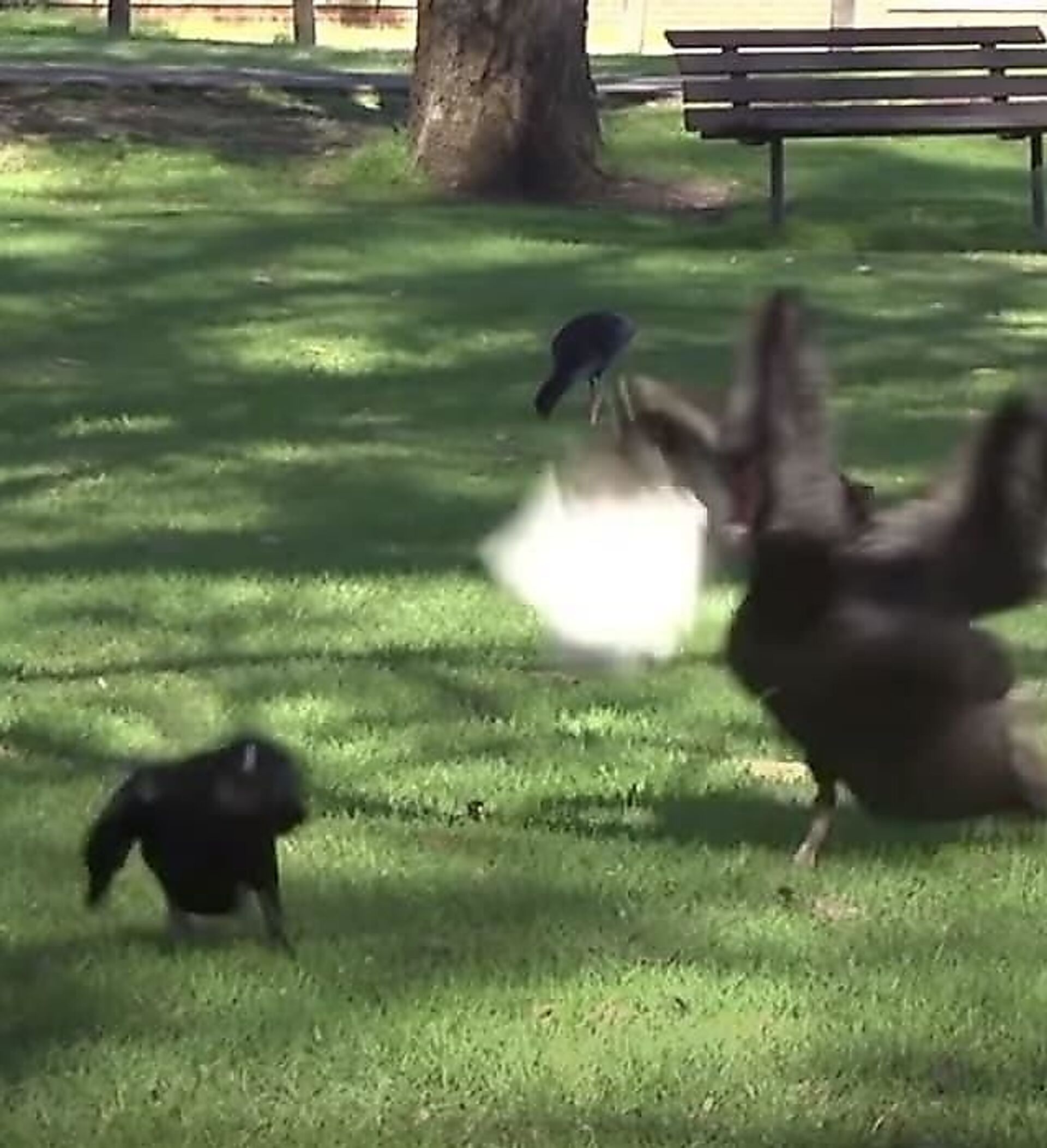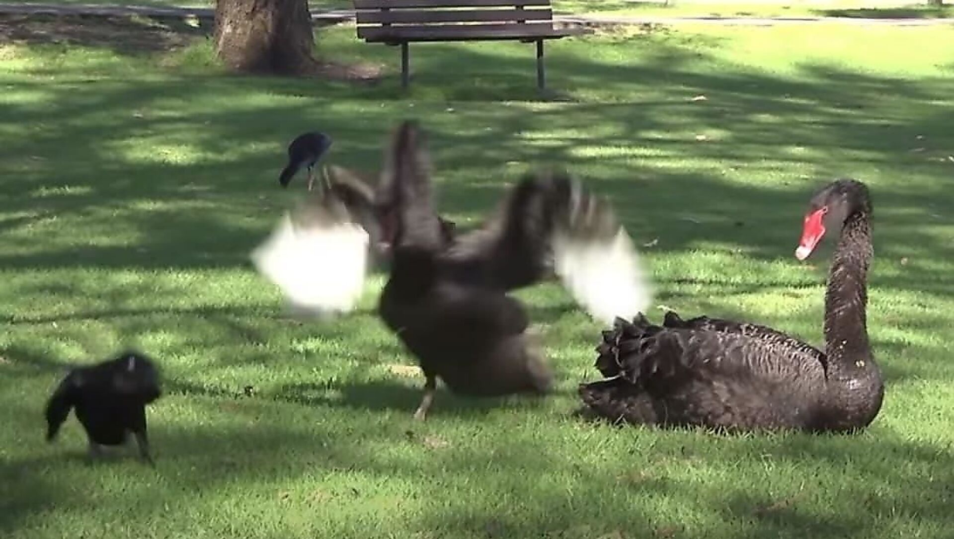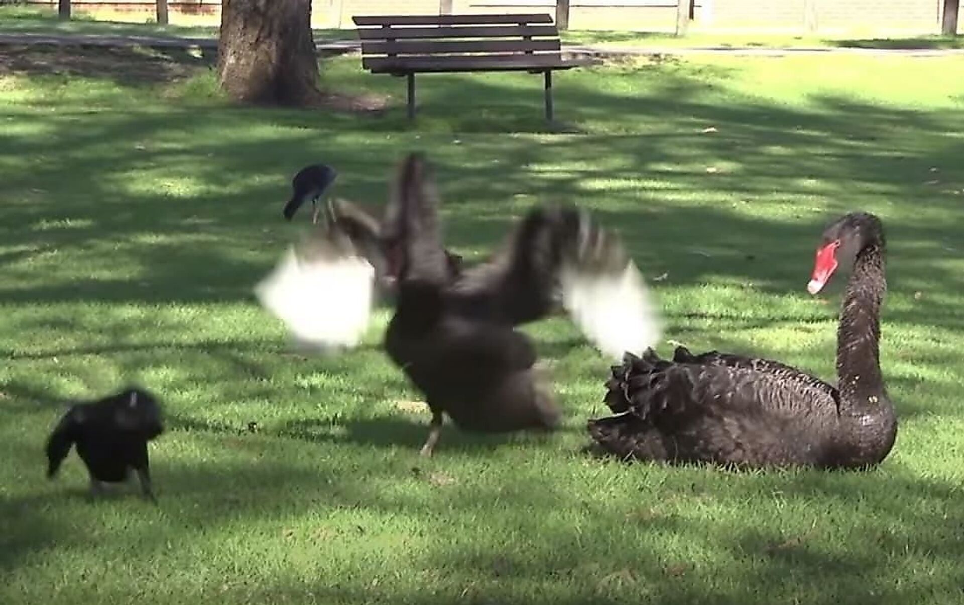 وأضاف أن الصغار كانوا في البركة ومن ثم تبعوا أمهم إلى اليابسة القريبة، وفجأة ظهر غراب وحاول أن ينقض عليهم، وعندها بدأت معركة طويلة، حيث كان الأب يحاول صد الهجمات، بينما الأم كانت تحميهم بالبقاء بالقرب منهم.
