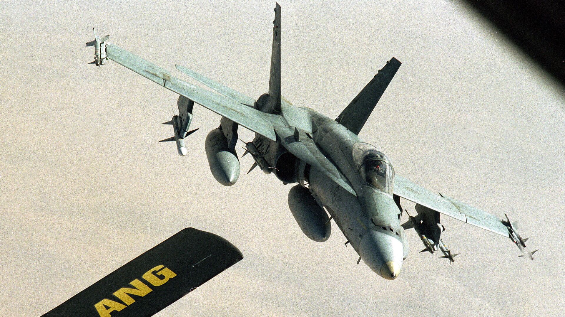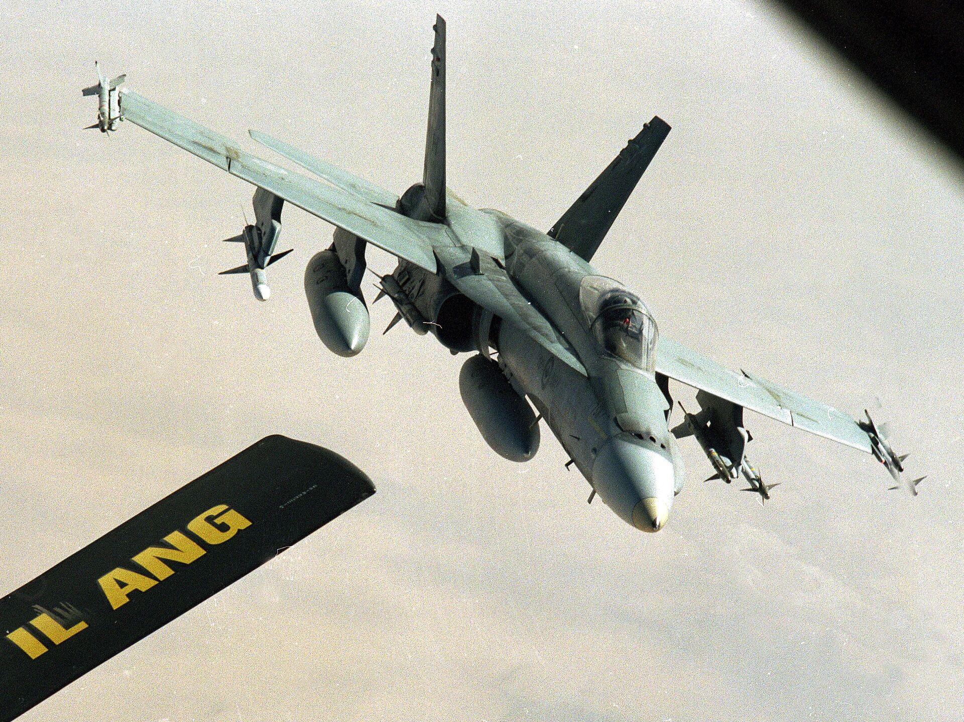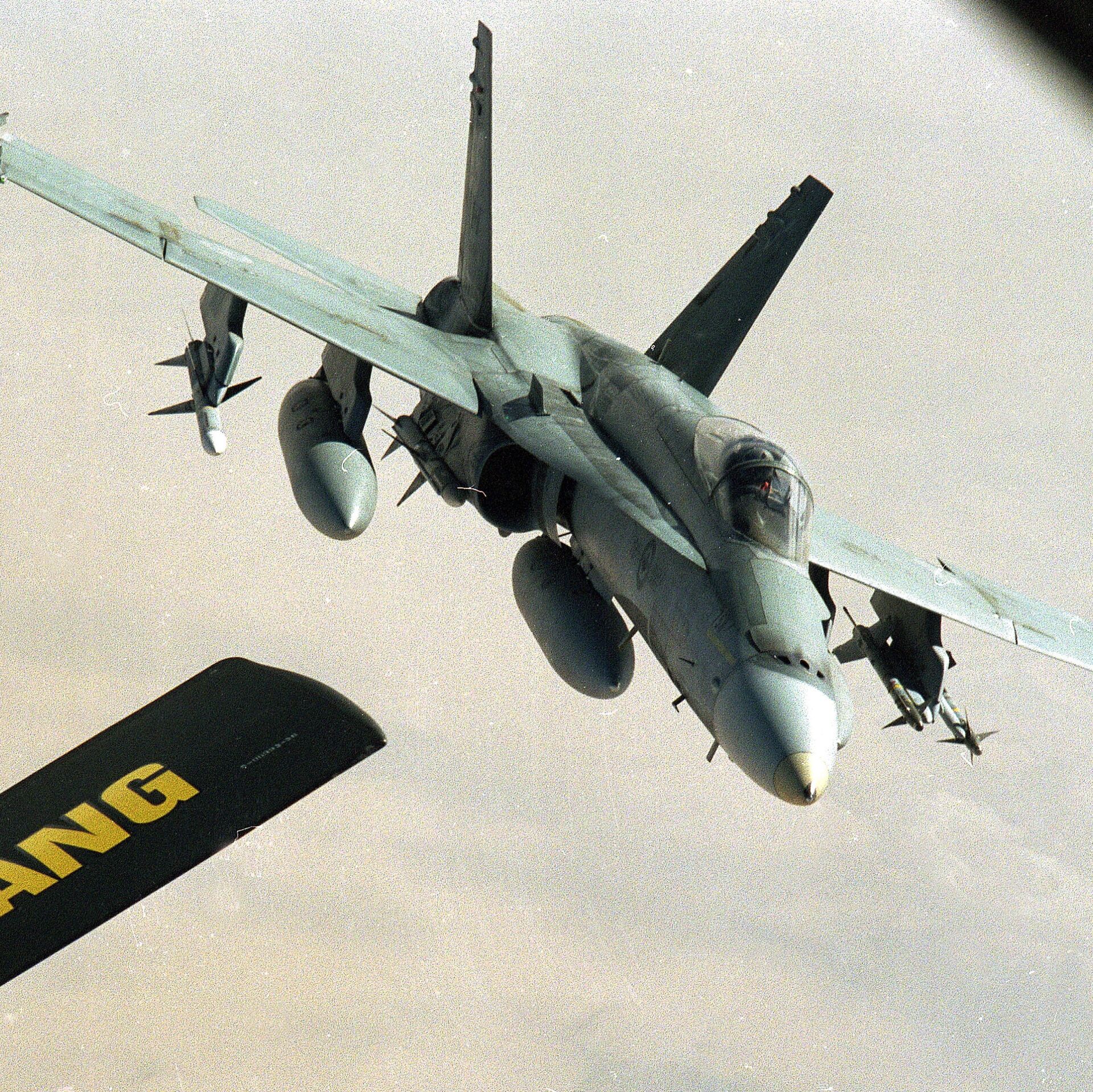 © AP Photo / GILL ALLENطائرة كندية من طراز CF-18 تحمل صواريخ من نوع ويندر تنحدر باتجاه ناقلة من طراز KC-135 لنقل وقود من الجو أثناء مهمتها لمساعدة قاذفات الحلفاء في غاراتها على العراق جنوب حدود الكويت