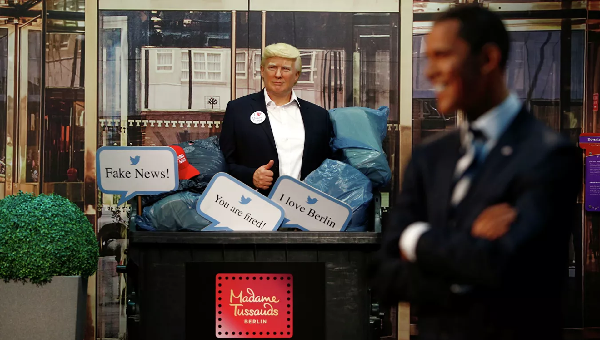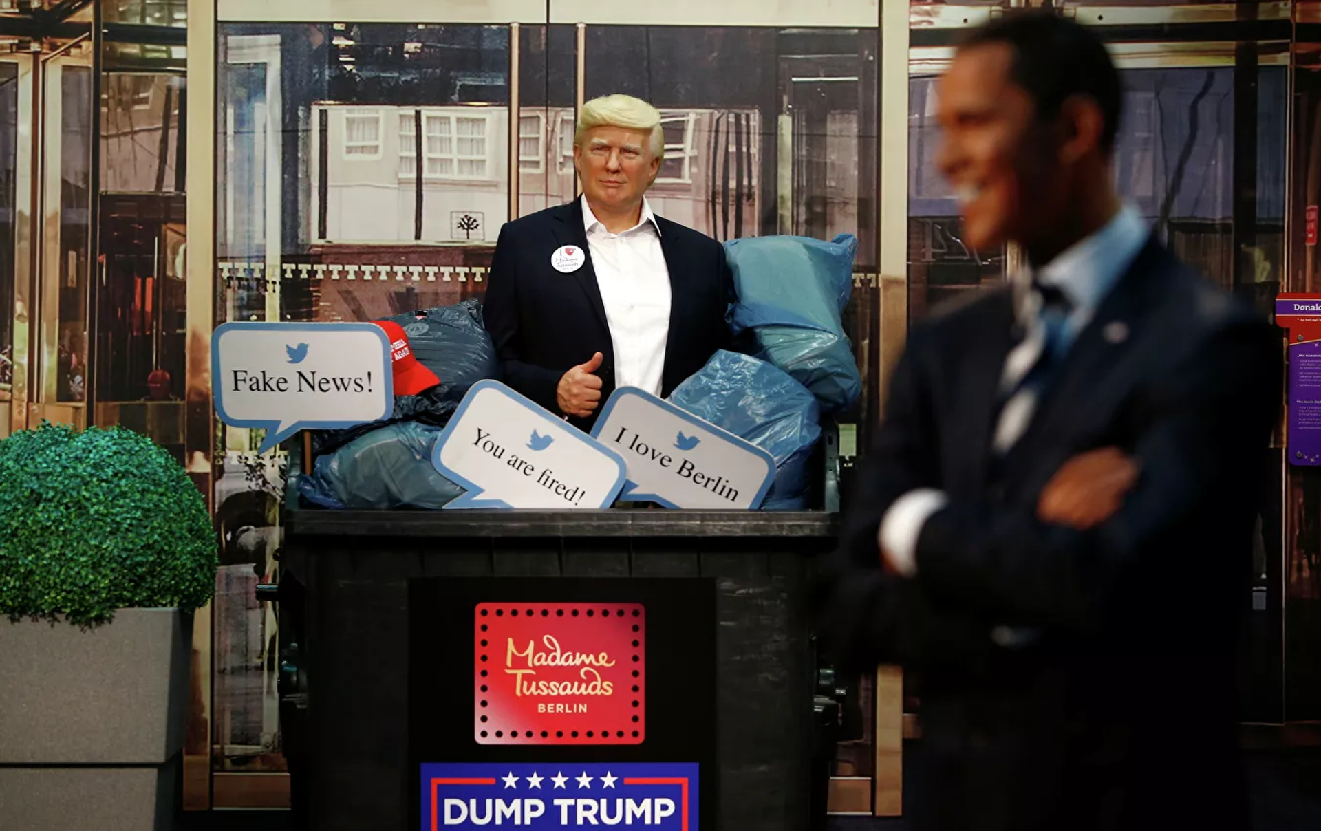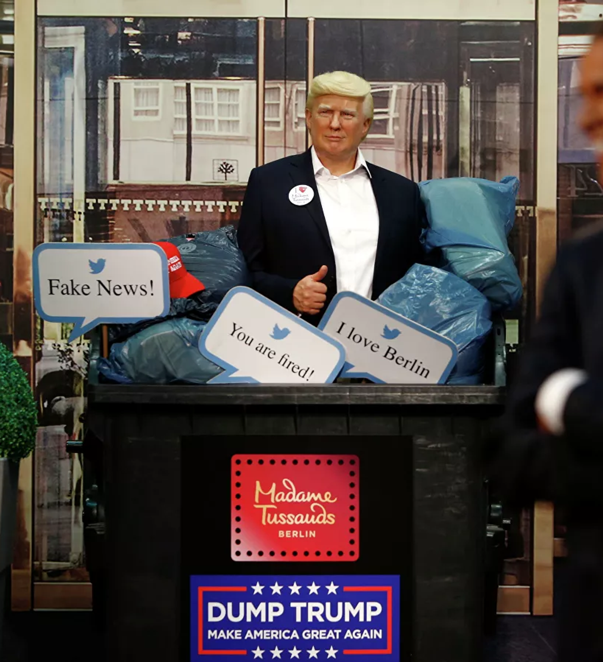 ووفقا لموقع "Stern"، فإن التعديل جرى، اليوم الجمعة، حيث كان المجسم بجوار تماثيل رؤساء الولايات المتحدة الآخرين - رونالد ريغان وباراك أوباما. بينما يظهر الآن في حاوية القمامة مكتوب عليها "Dump Trump, make America great again"، بالإضافة إلى عبارات أخرى مثل "أنت مطرود".
