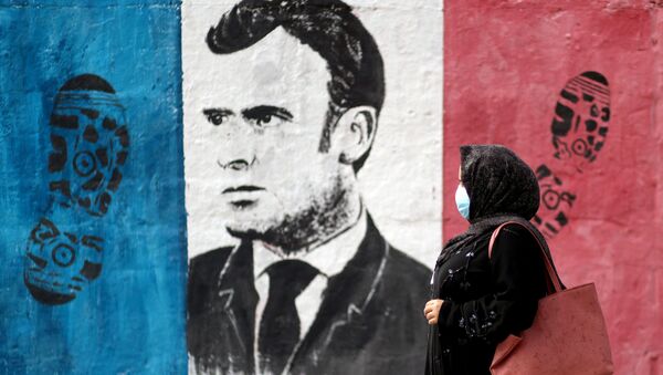 حملة جماهرية احتجاجية ضد تصريحات الرئيس الفرنسي إيمانويل ماكرون حول رسومات الكاريكاتير المسيئة للرسول محمد (ص) في غزة، قطاع غزة 28 أكتوبر 2020 - سبوتنيك عربي
