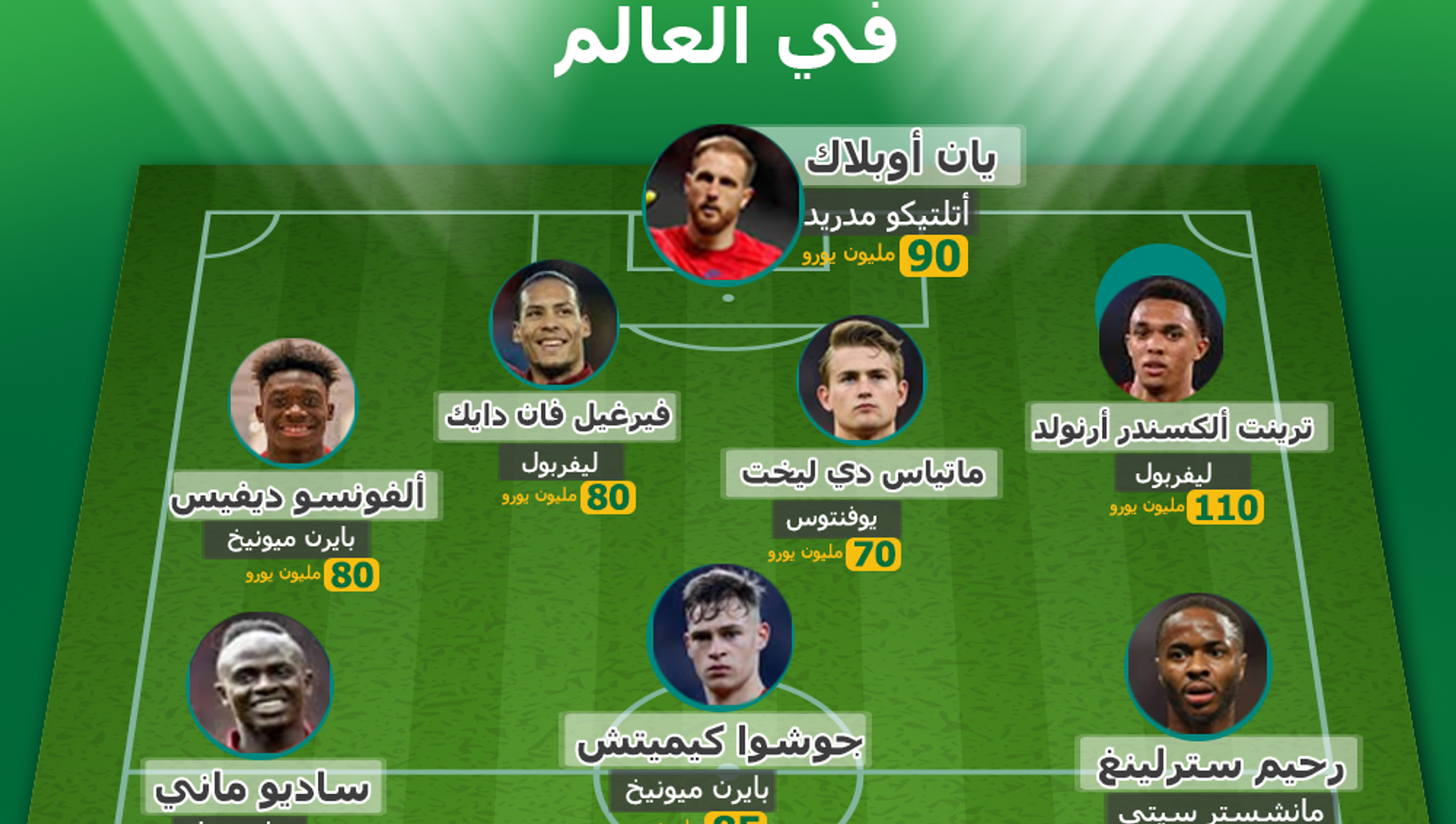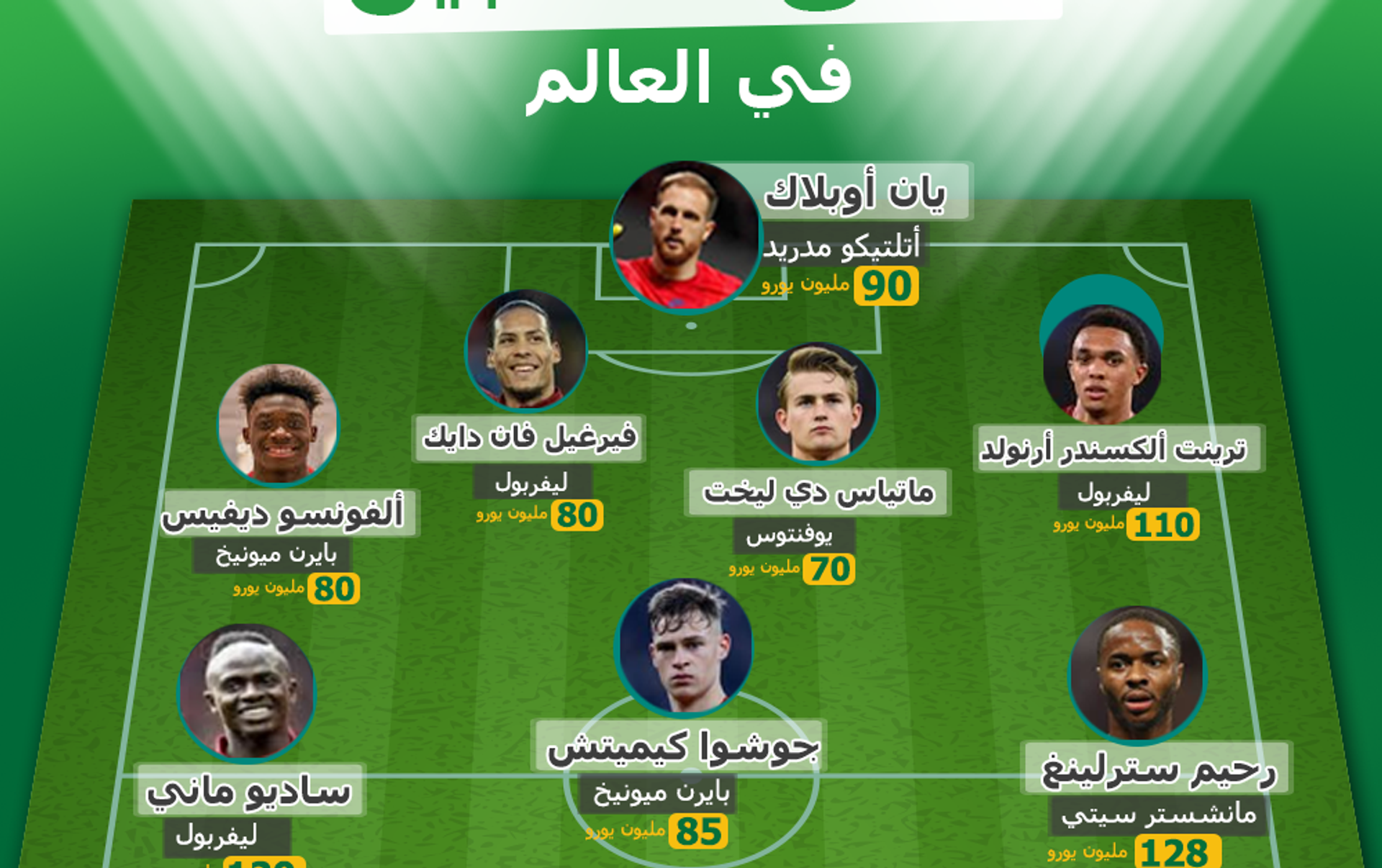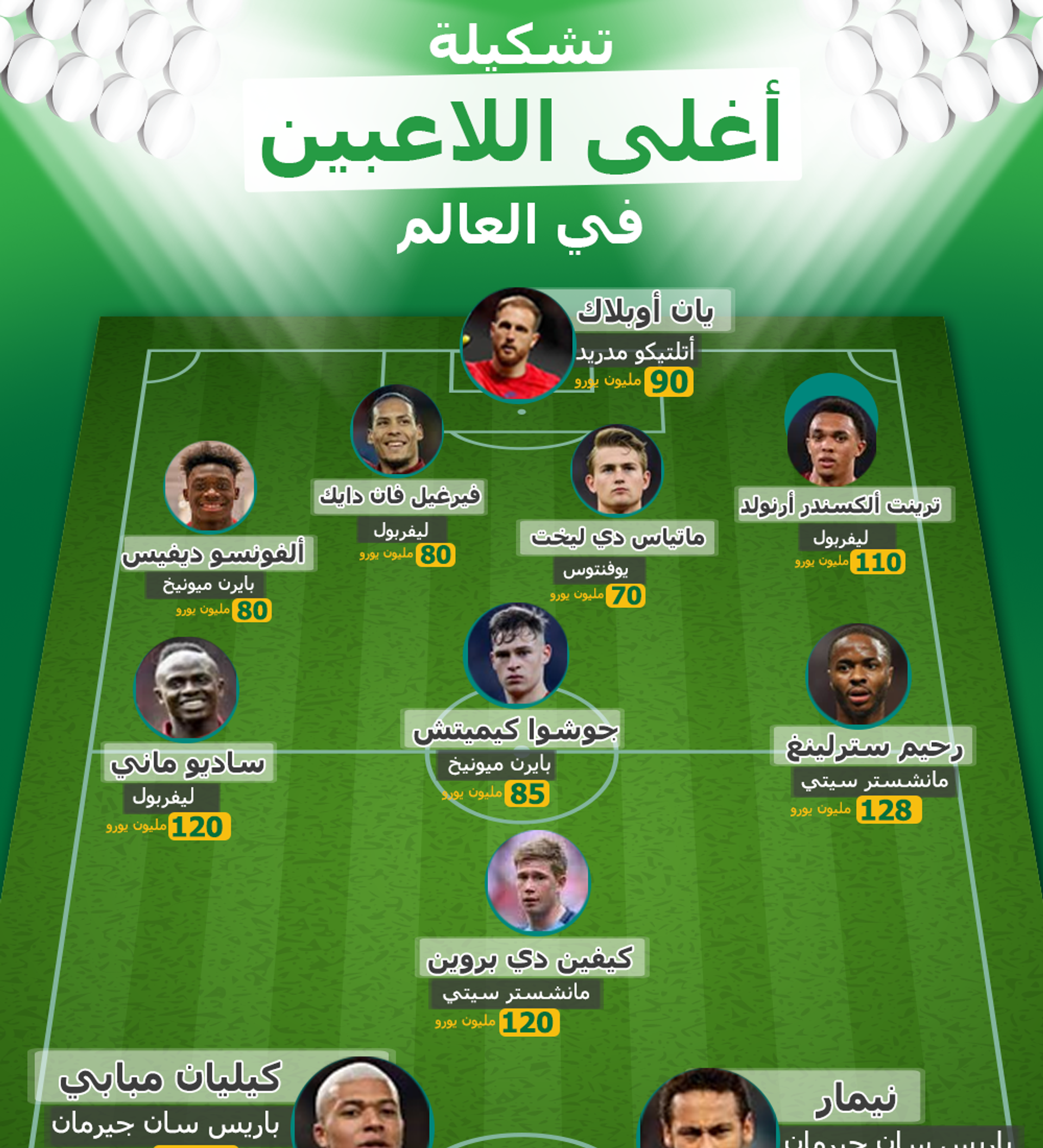 نشر موقع "Transfermarkt" المتخصص في القيمة السوقية للاعبين وسوق الانتقالات، تشكيلة أغلى لاعبي كرة القدم في العالم، وشهدت التشكيلة مفاجأة تمثلت في غياب الثنائي، البرتغالي كريستيانو رونالدو لاعب يوفنتوس، والأرجنتيني ليونيل ميسي قائد نادي برشلونة.
