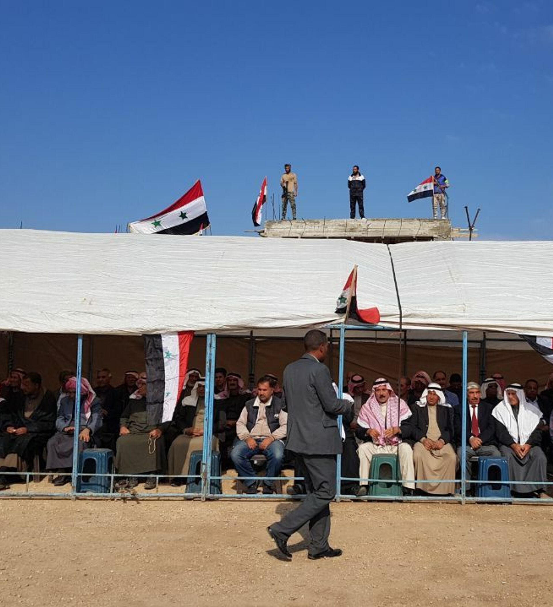 ورفع المشاركون الأعلام السورية وصور الرئيس السوري الدكتور بشار الأسد، مؤكدين وقوفهم إلى جانب الجيش العربي السوري والقوات الصديقة الحليفة من روسيا الاتحادية في حربهم ضد الإرهاب.