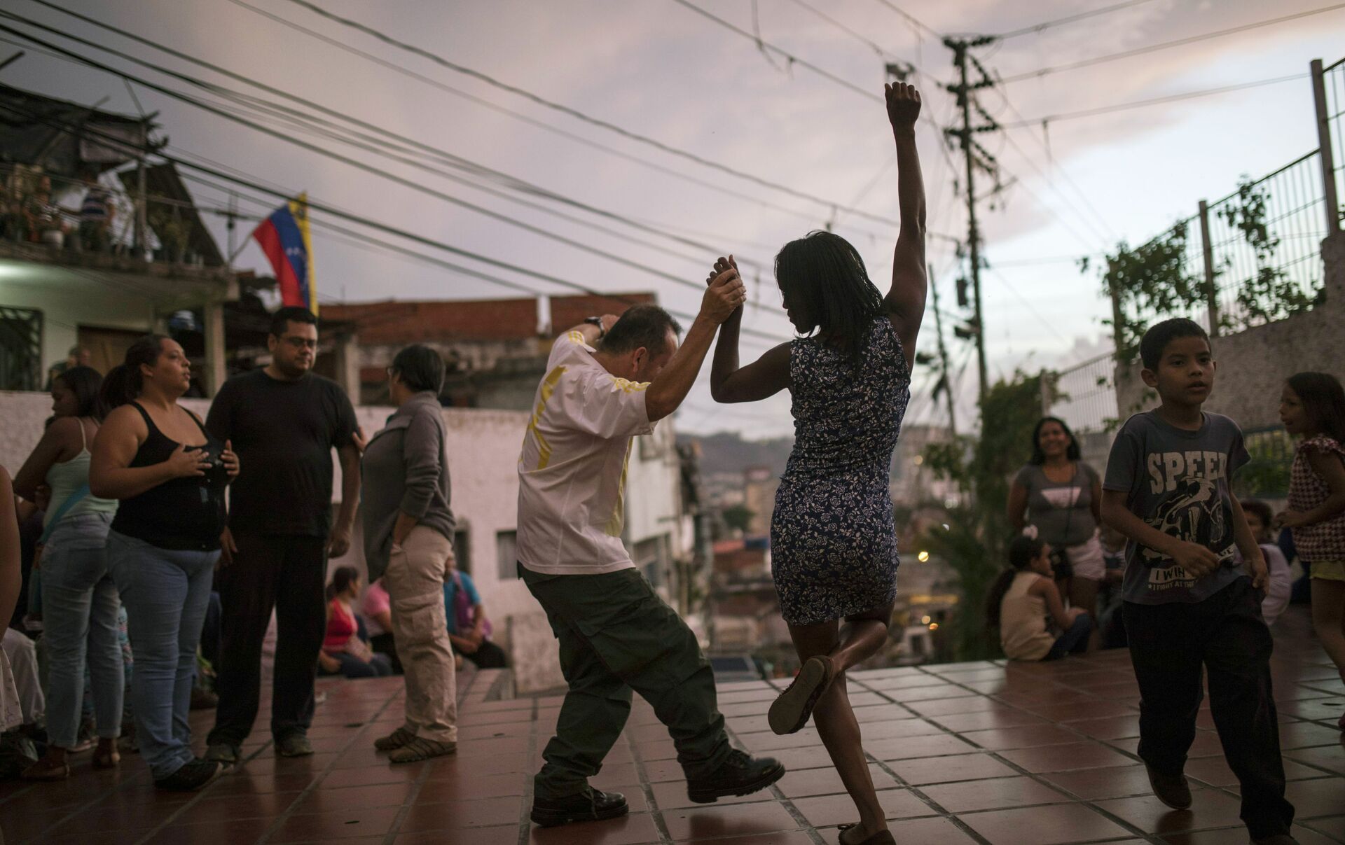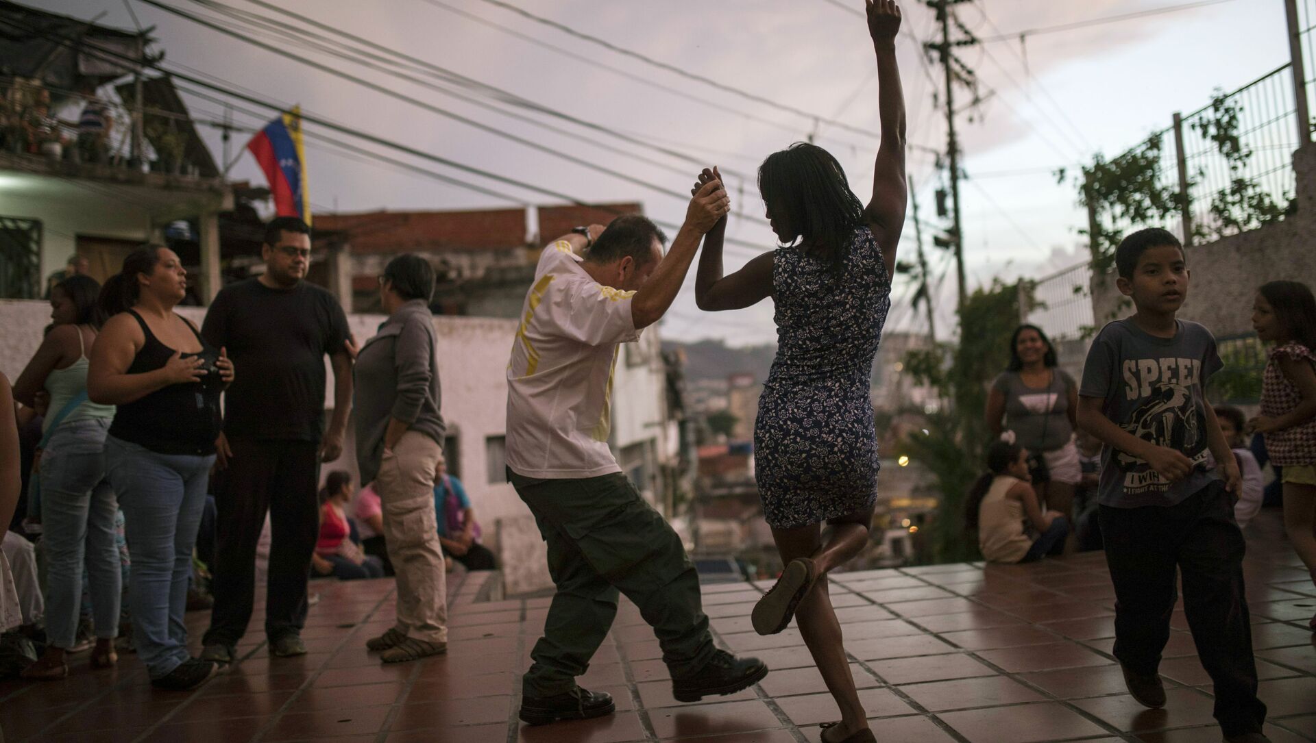 شخصان يرقصان على عزف موسيقيين في ساحة عامة حيث يجتمع الجيران في كاراكاس، فنزويلا، عند غروب الشمس السبت 11 مايو/ أيار 2019 - سبوتنيك عربي