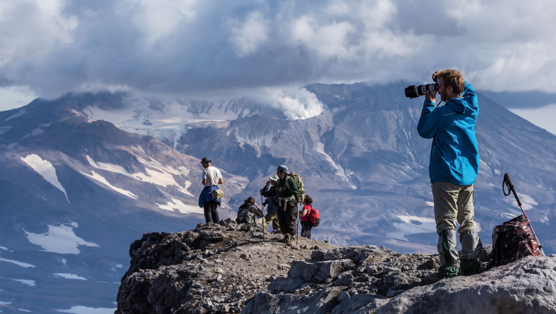 © Sputnik . Alexandr Piragis / الانتقال إلى بنك الصورسياح ينظرون على بركان موتنوفسكي من أعلى قمة بركان غوريلوفو في كامتشاتكا الروسية