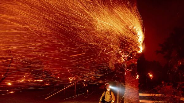 © AP Photo / Noah Bergerرجل إطفاء يمر بشجرة محترقة أثناء "حريق بوند" في مجتمع سيلفرادو في مقاطعة أورانج، كاليفورنيا، الولايات المتحدة 3 ديسمبر 2020