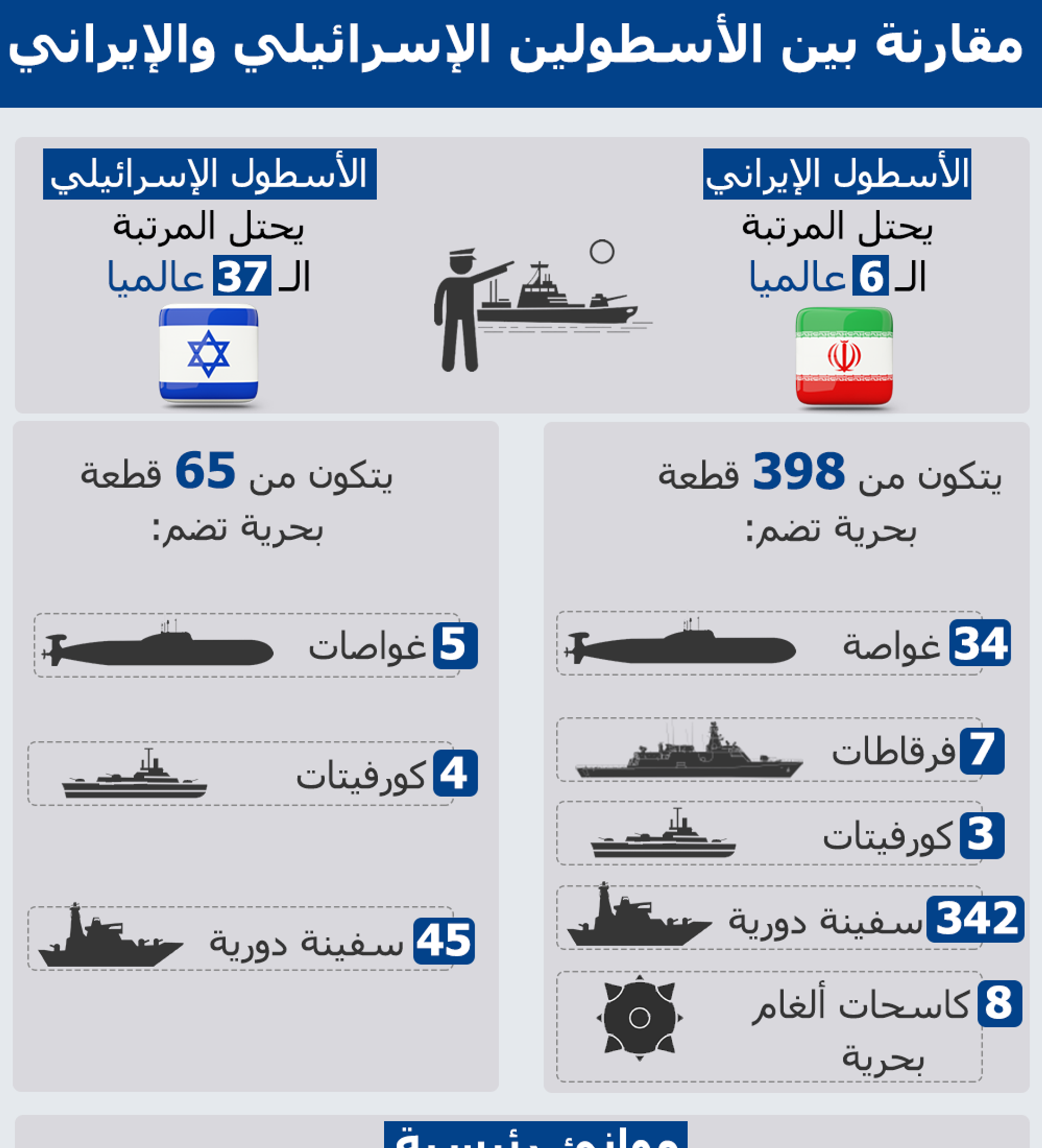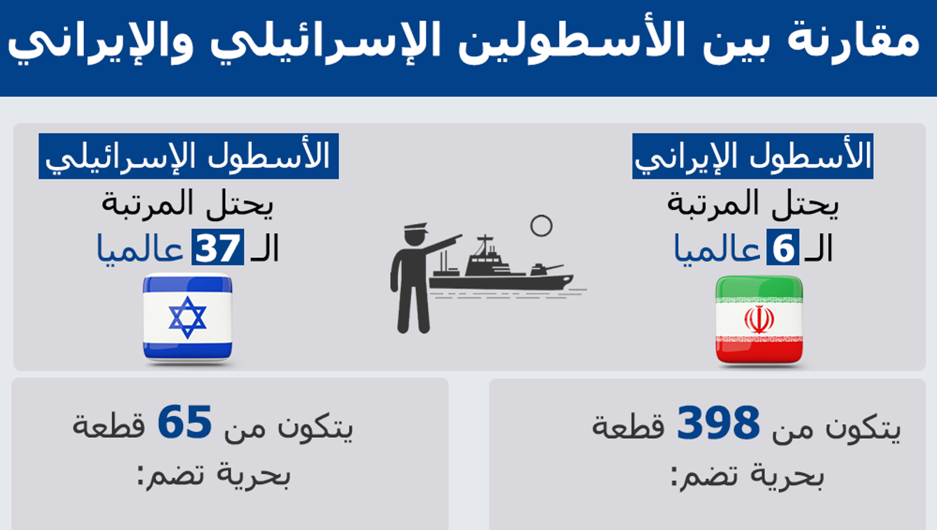 وأورد موقع "غلوبال فير بور" الأمريكي مقارنة بين قدرات الأسطول الحربي الإيراني وقدرات الأسطول الإسرائيلي.