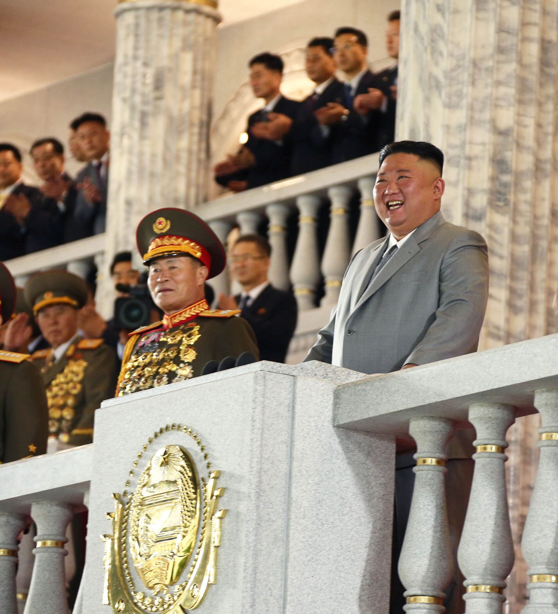 © REUTERS / KCNAالزعيم الكوري الشمالي كيم جونغ أون مع وفد رسمي مرافق له خلال حفل ذكرى مرور 75 على إنشاء حزب العمال الحاكم