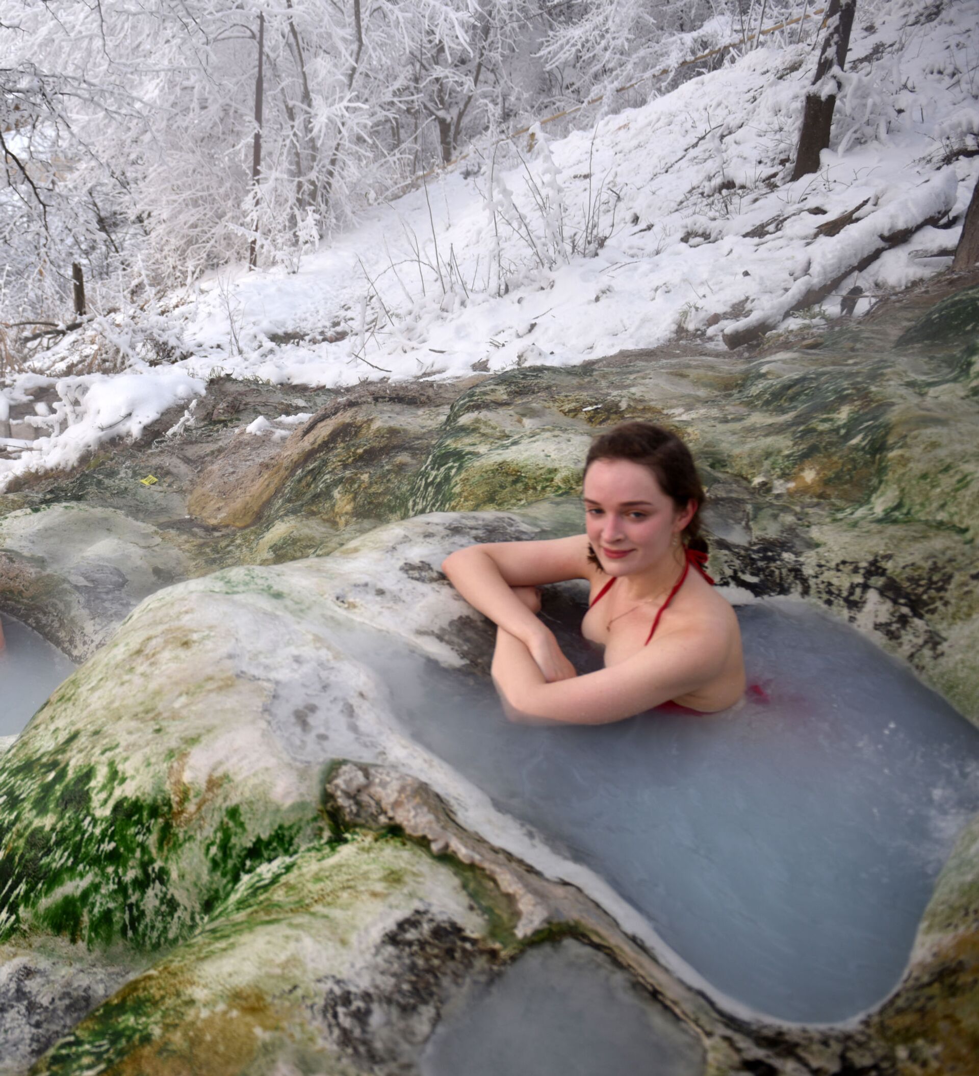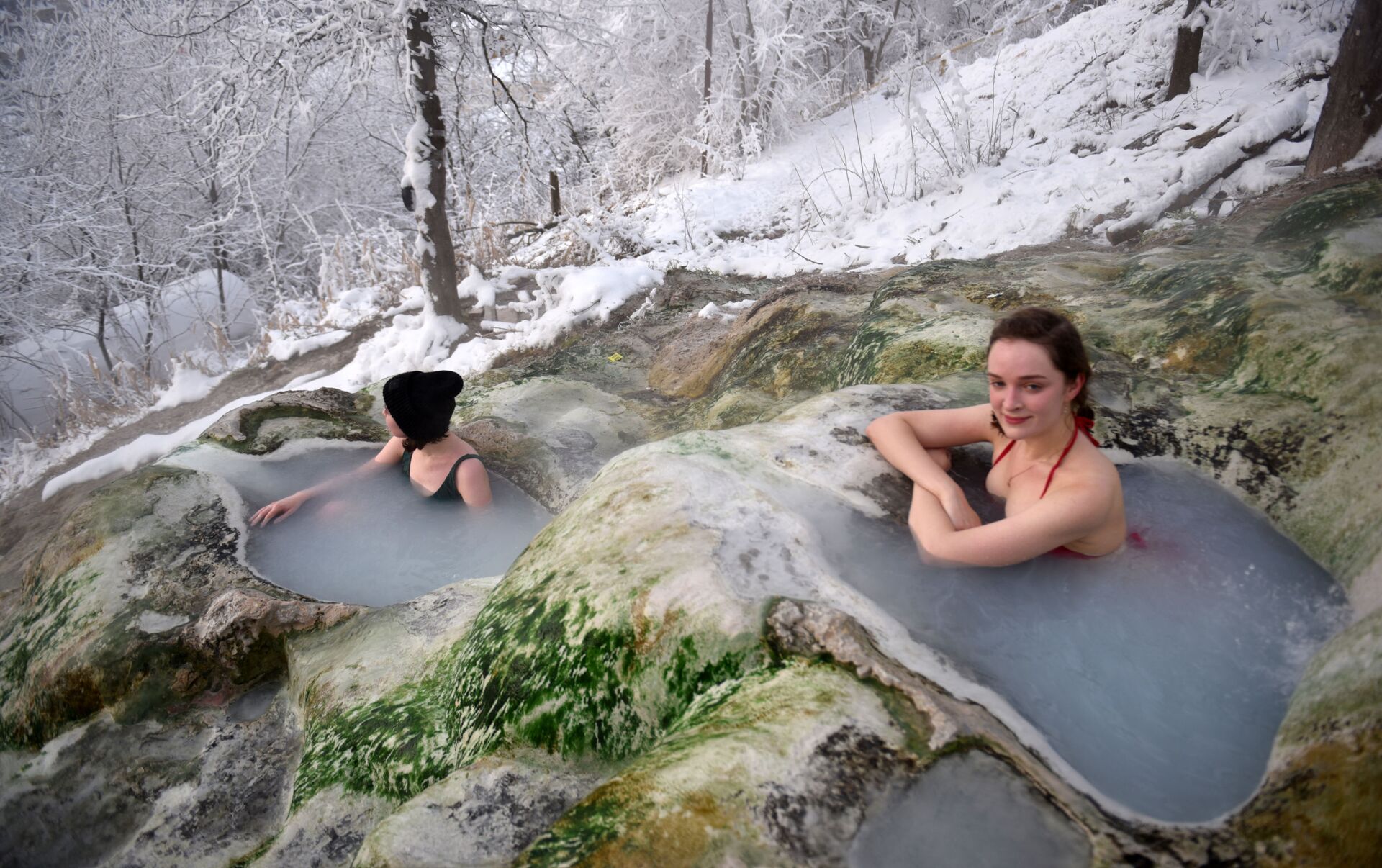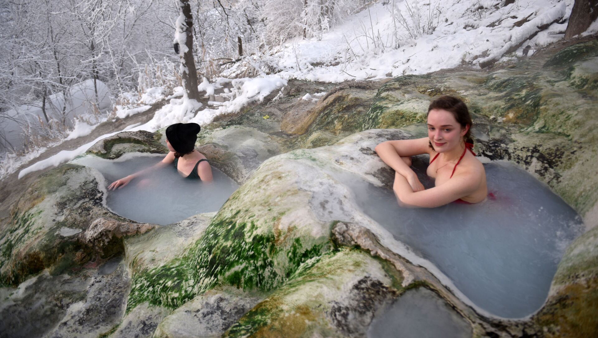شابات يستحمن في ينابيع المياه الساخنة في بياتيغورسك الروسية. على منحدر جبل ماشوك، حيث تتدفق ينابيع كبريتيد الهيدروجين الساخنة، وتحت تأثيرها تكونت المنخفضات على المنحدرات الصخرية، تبدو وكأنها حمامات.