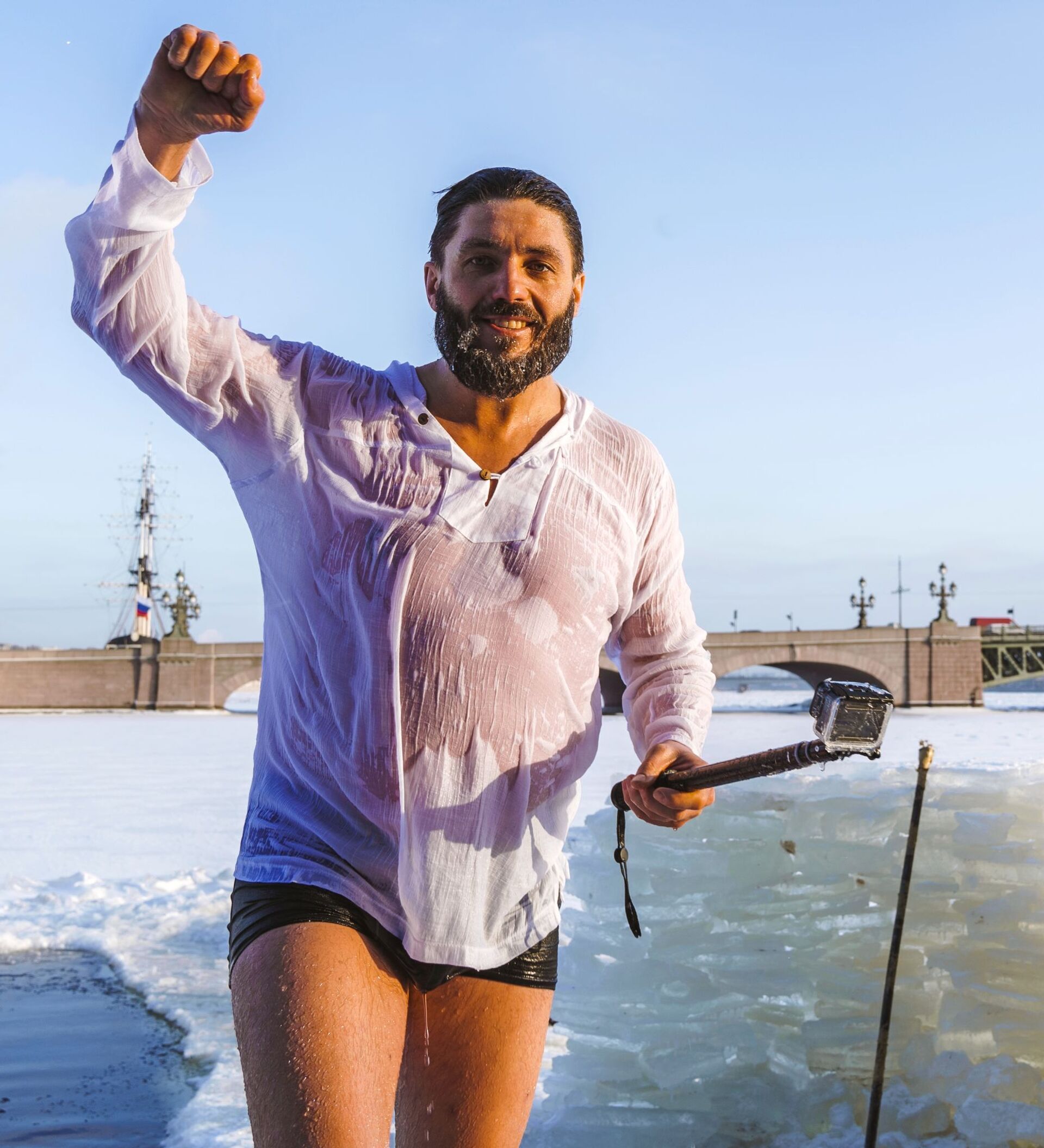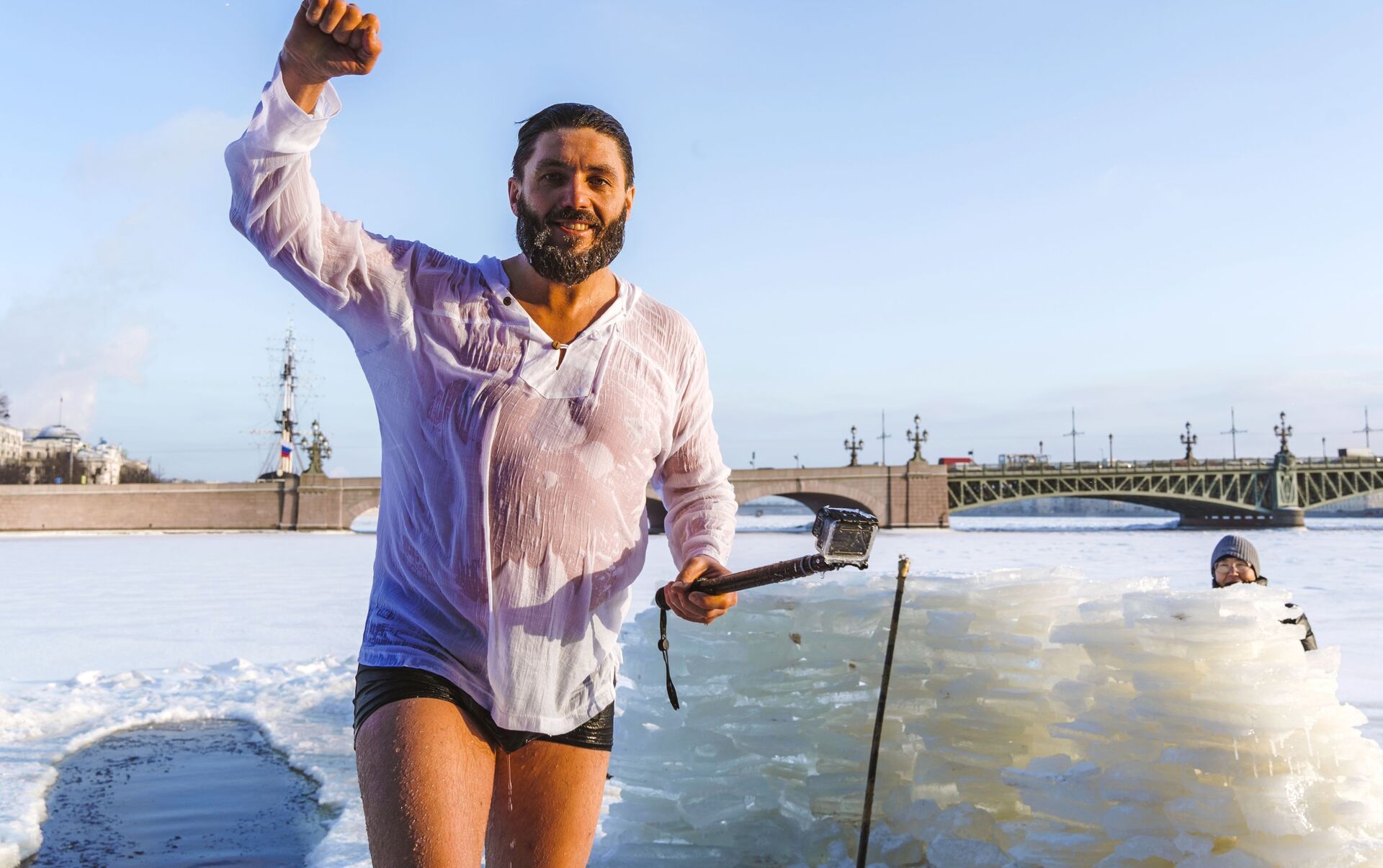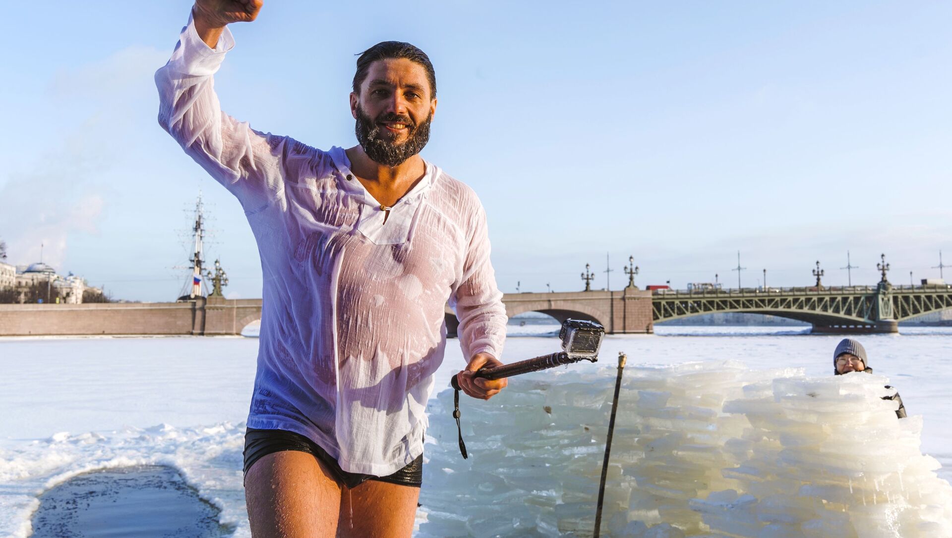 رجل يلتقط صورة تذكارية له بعد السباحة الشتوية في قناة كرونفيرسكي في سان بطرسبورغ، روسيا 14 يناير 2021