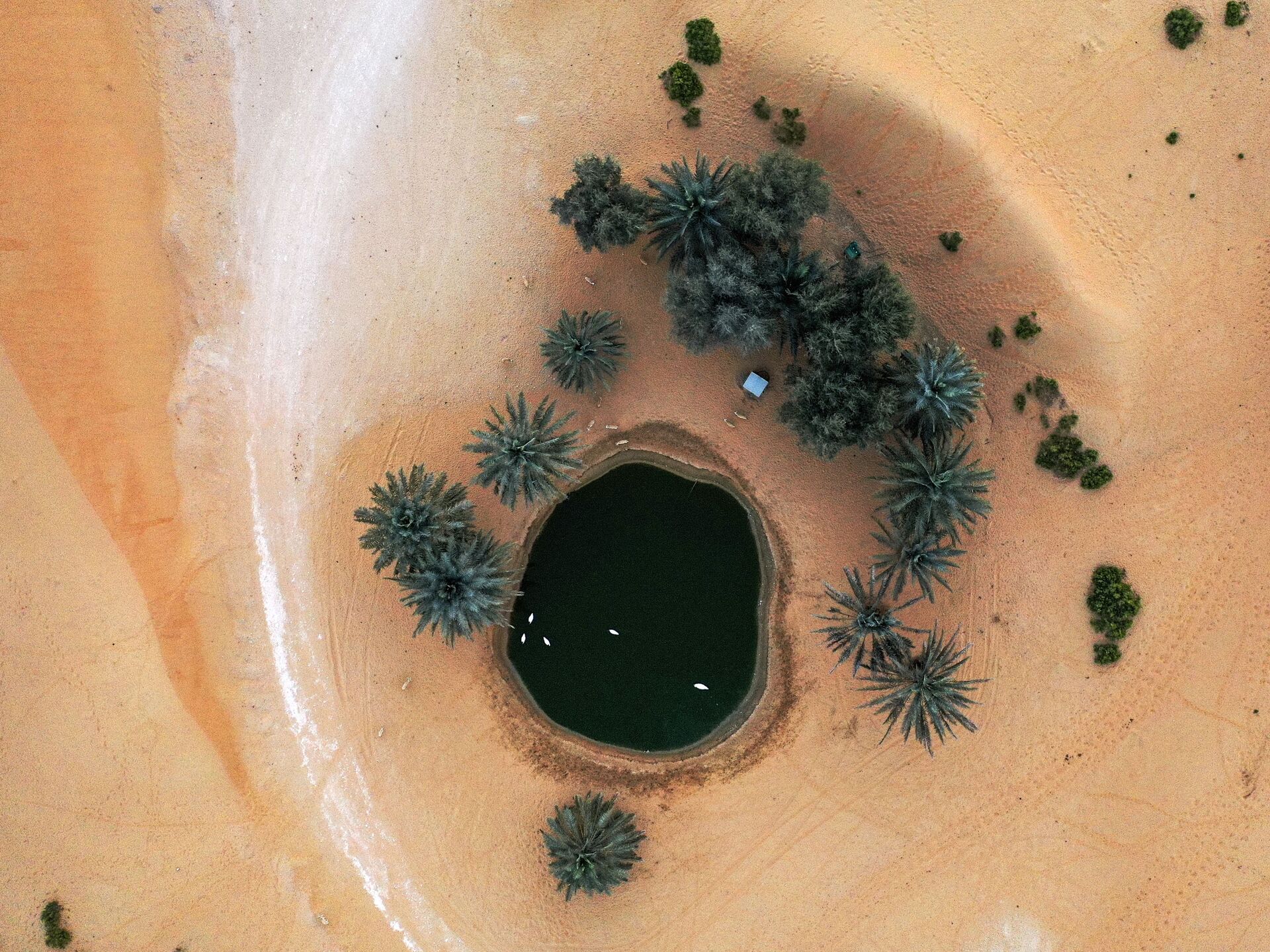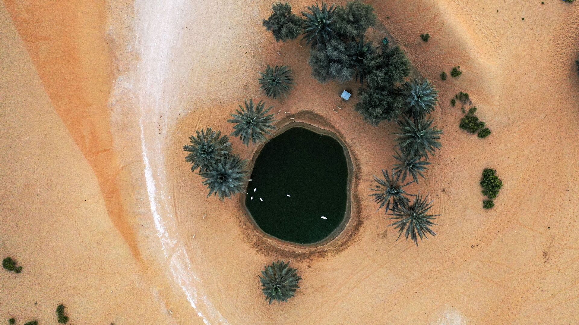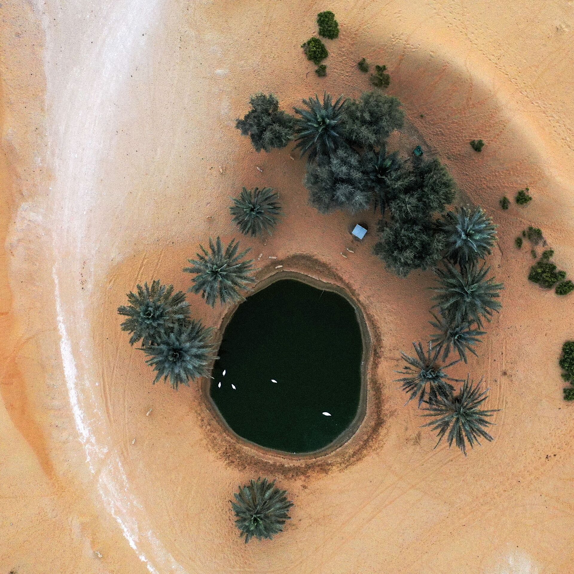 منظر جوي للبجع ذو العنق الأسود (Cygnus melancoryphus) وهو يسبح في بركة في واحة صحراوية في "منتجع تلال" (Telal Resort) في ضواحي مدينة العين في أقصى شرق إمارة أبو ظبي الإمارات العربية المتحدة 26 يناير 2020.