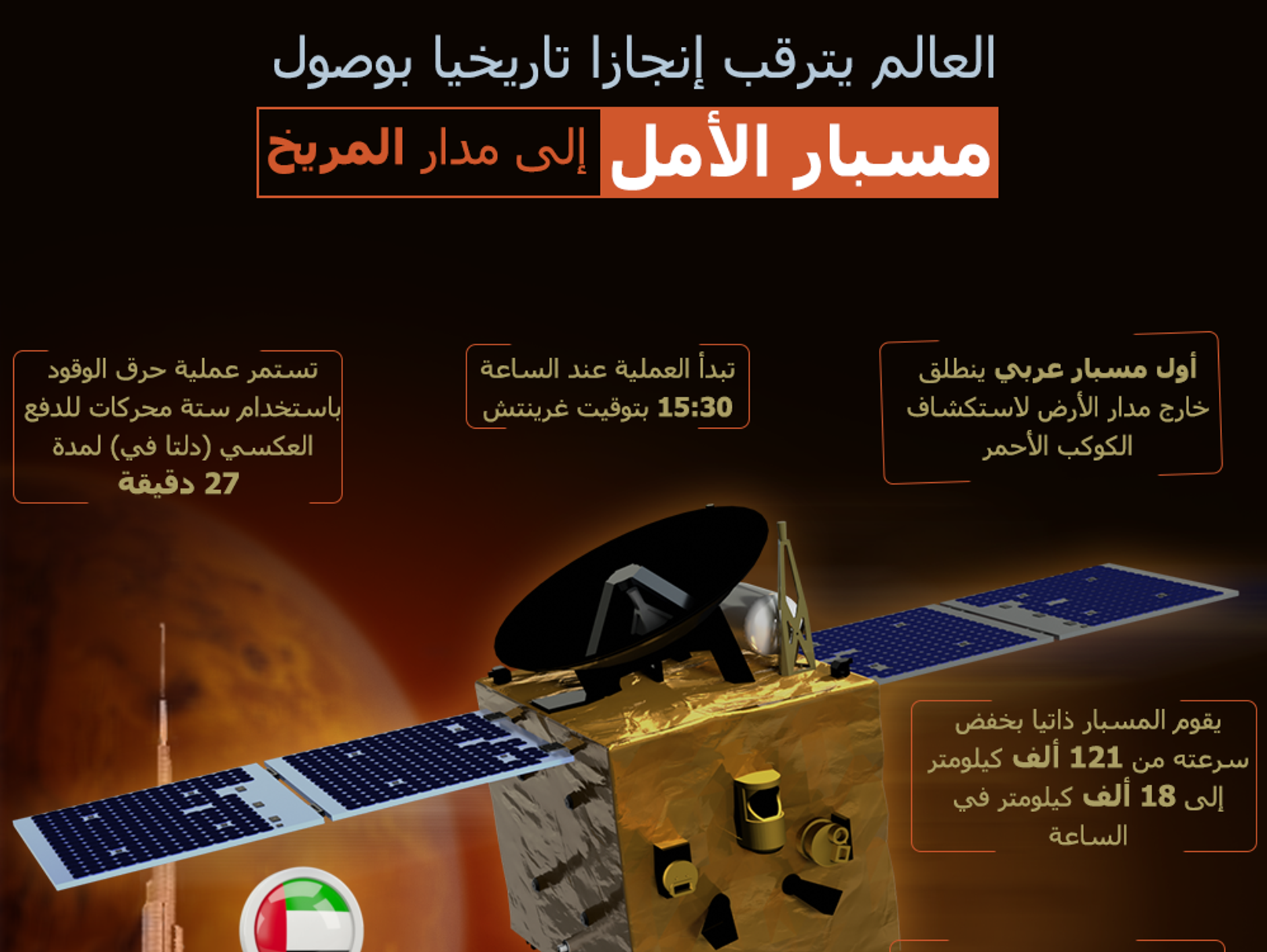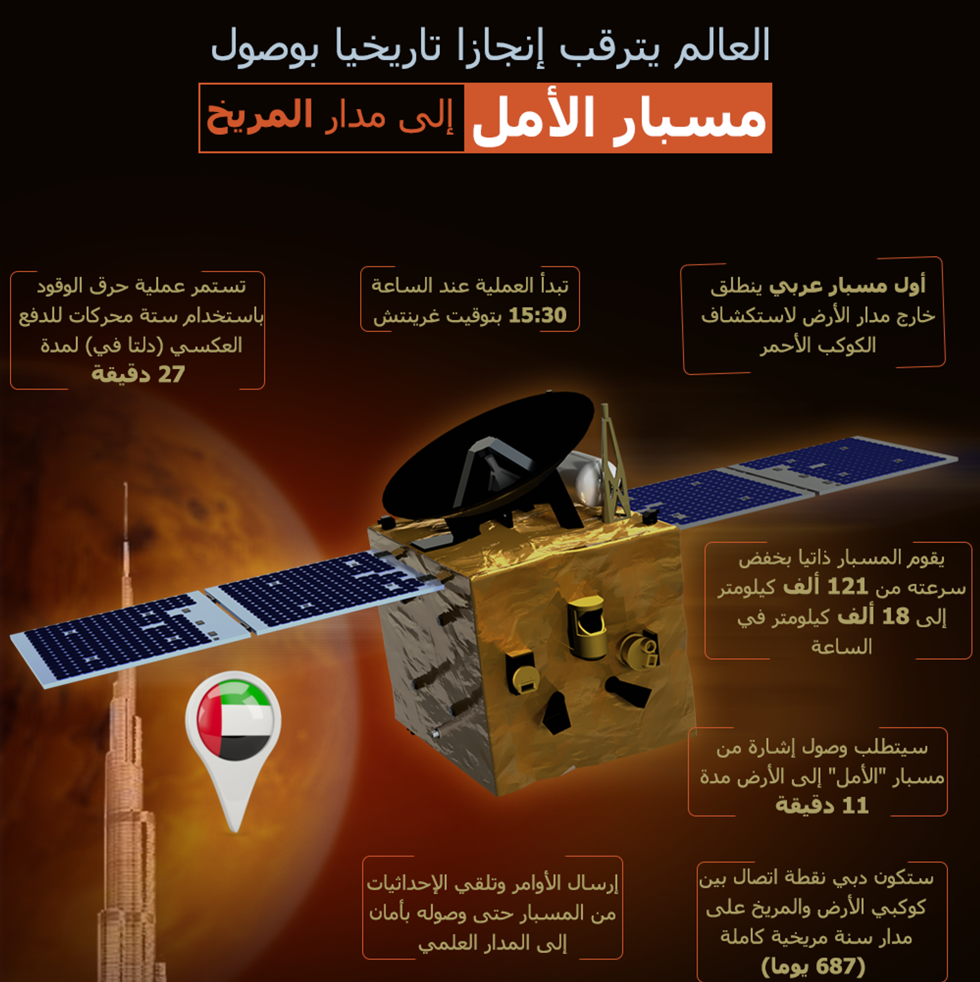 15:41 GMT 09.02.2021 (تم التحديث: 07:56 GMT 27.01.2022) تتجه الأنظار، اليوم الثلاثاء، إلى أبو ظبي، حيث من المتوقع أن يصل مسبار "الأمل" الإماراتي، أول رحلة عربية استكشافية من نوعها، إلى مدار كوكب المريخ، ما يجعله أول مهمة من أصل ثلاث تبلغ الكوكب الأحمر هذا الشهر.