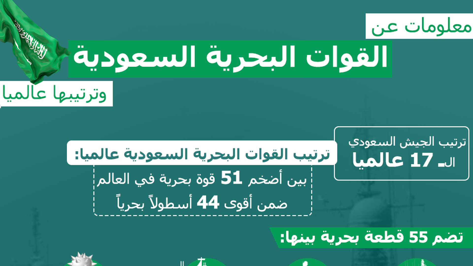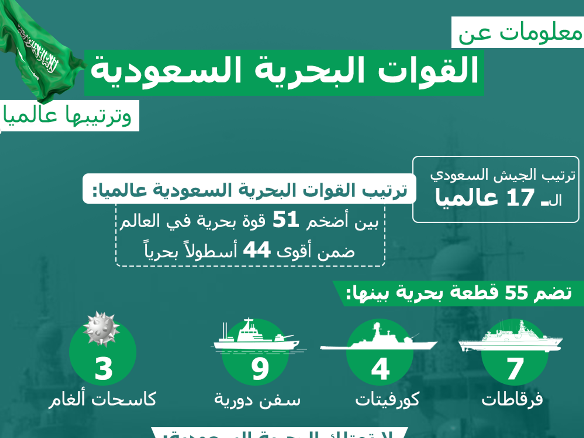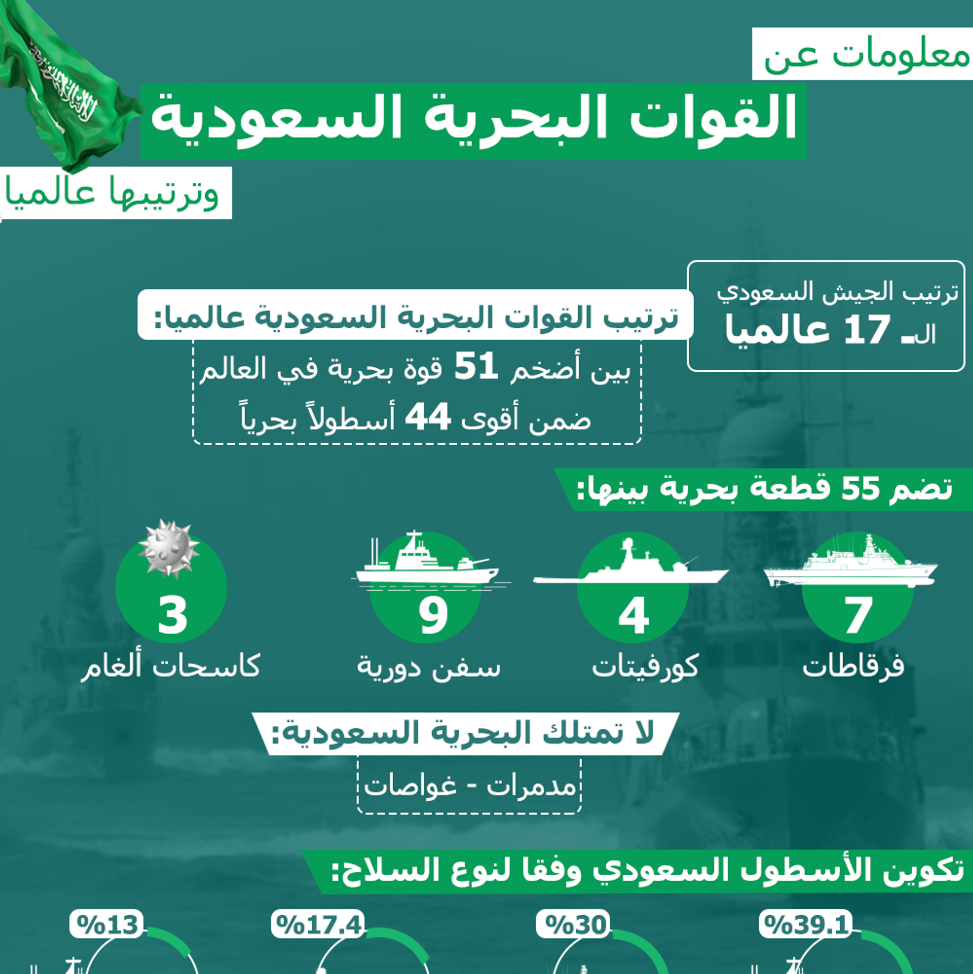 كل نوعية القطع البحرية المتطورة التي يملكها الأسطول السعودي يجعلها في المرتبة رقم 44 من حيث القوة والكفاءة القتالية للوحدات البحرية، التي تملكها الأساطيل البحرية حول العالم.