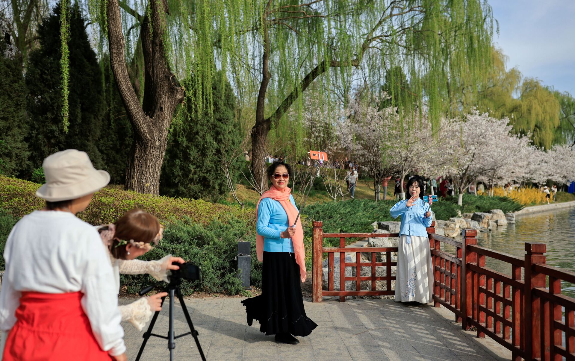 نساء يلتقطن صورا على خلفية تفتح أزهار شجر الكرز الشهيرة في هذا الوقت من العام، بكين، الصين 31 مارس 2021 - سبوتنيك عربي, 1920, 07.04.2021