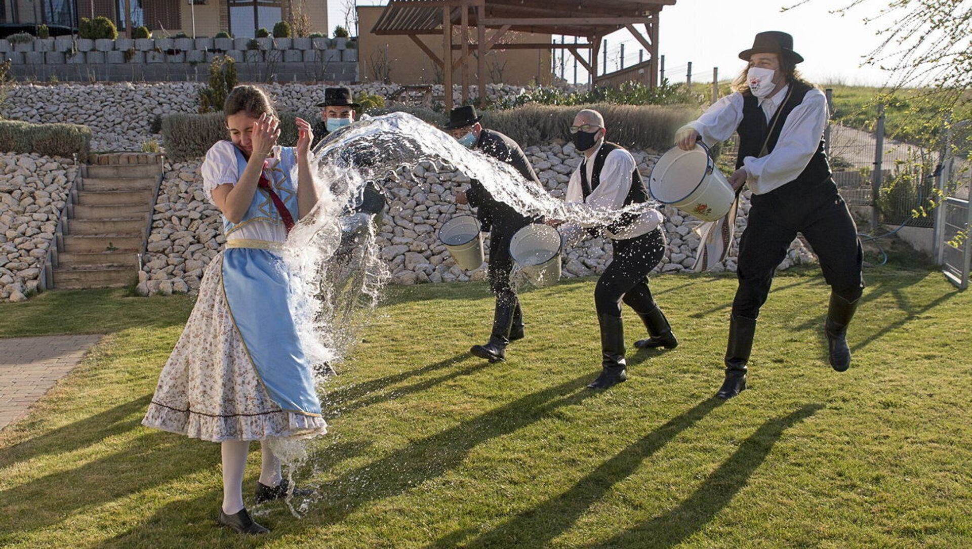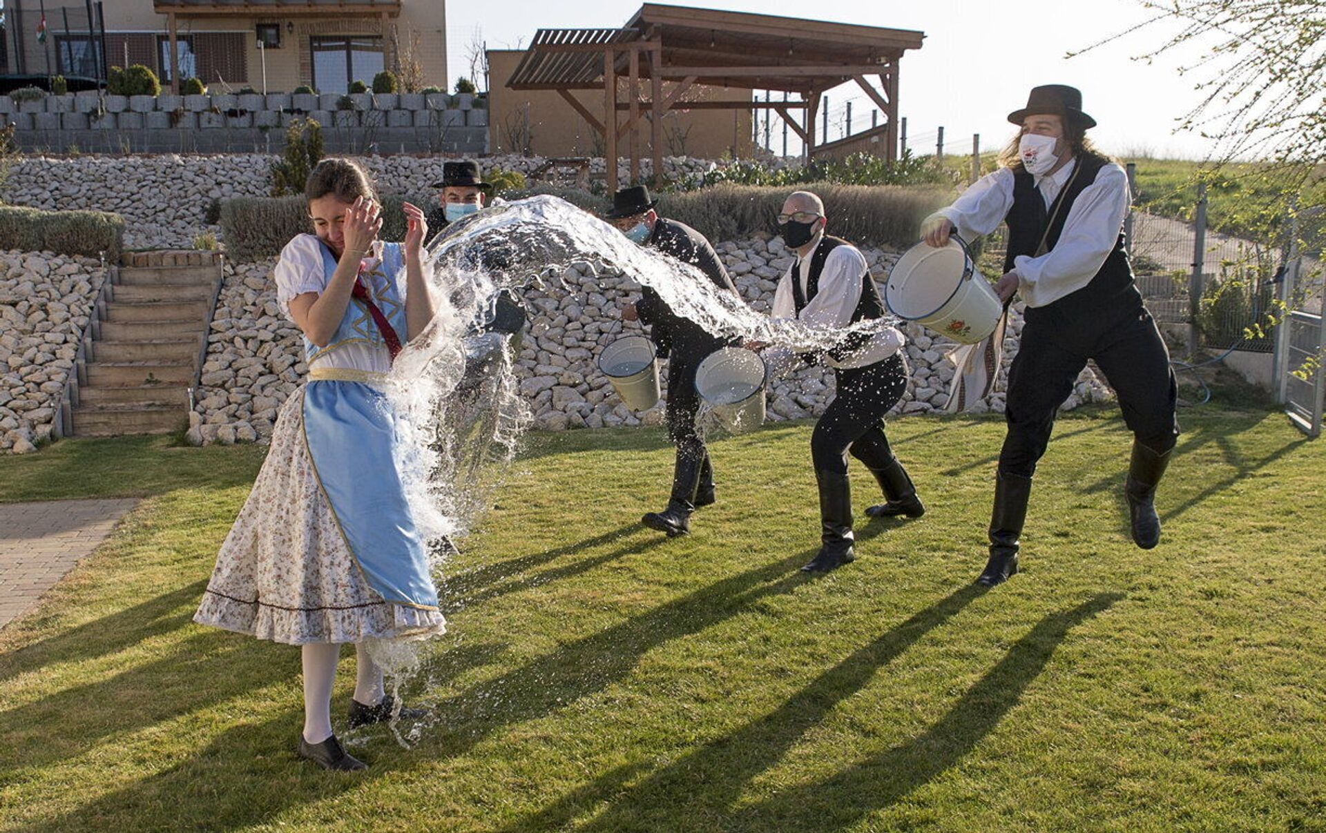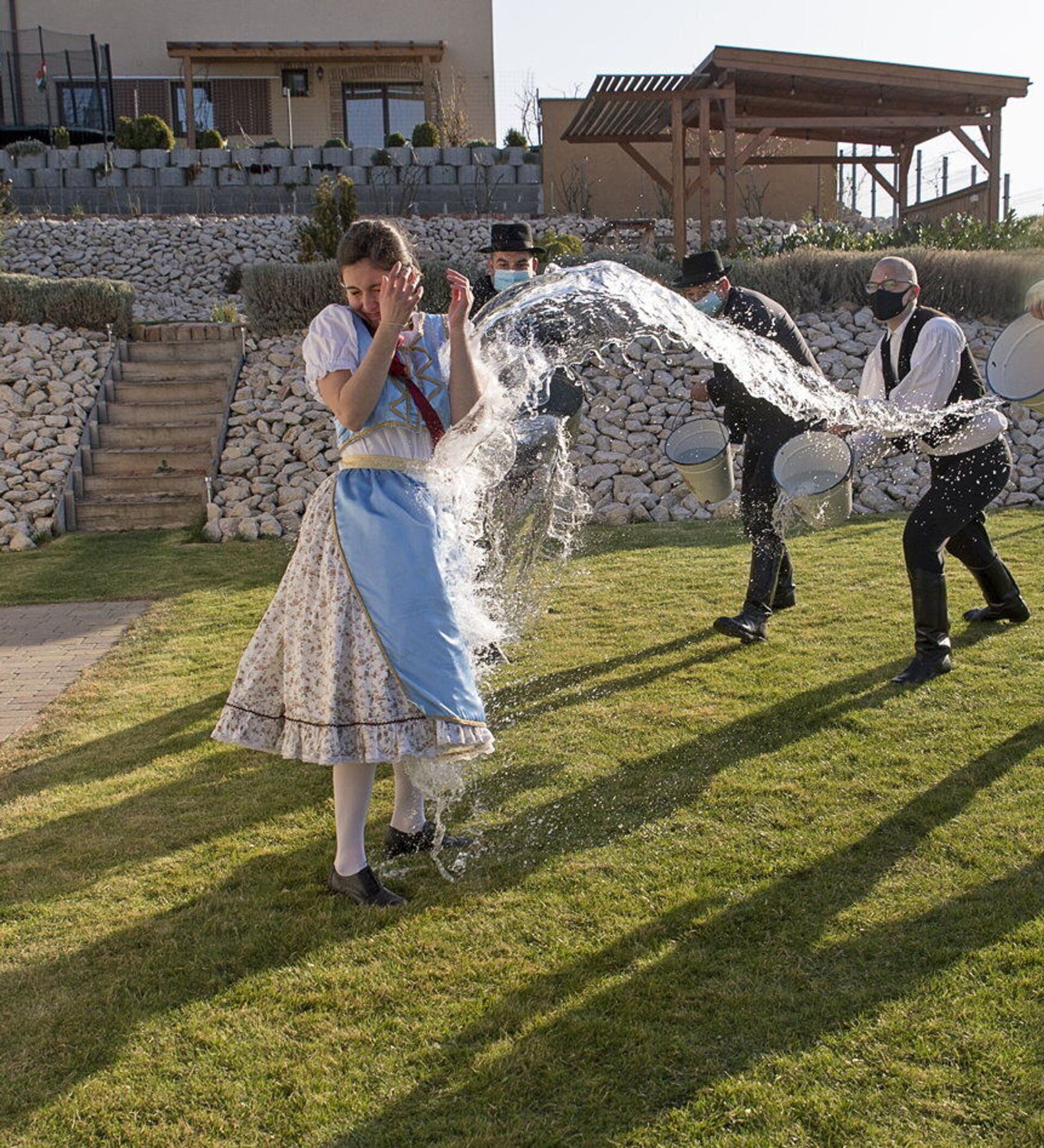 حبس التقليد المجري القديم، في يوم الاثنين بعد عيد الفصح يرتدي الأهالي الأزياء الشعبية، ويقوم الشباب، أعضاء جمعية ماركال للرقص والفنون الشعبية، بصب الماء على الفتيات الشابات، في مينفوكساناك، المجر، 5 أبريل 2021.