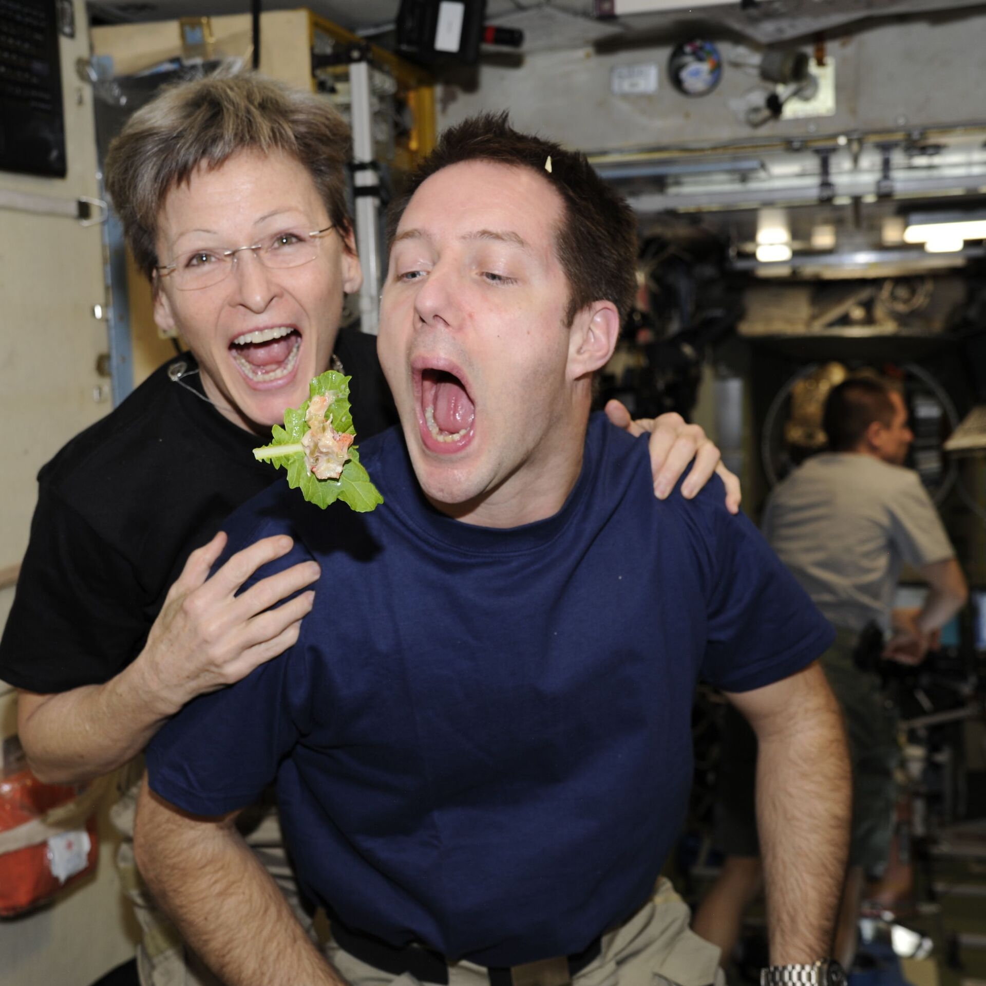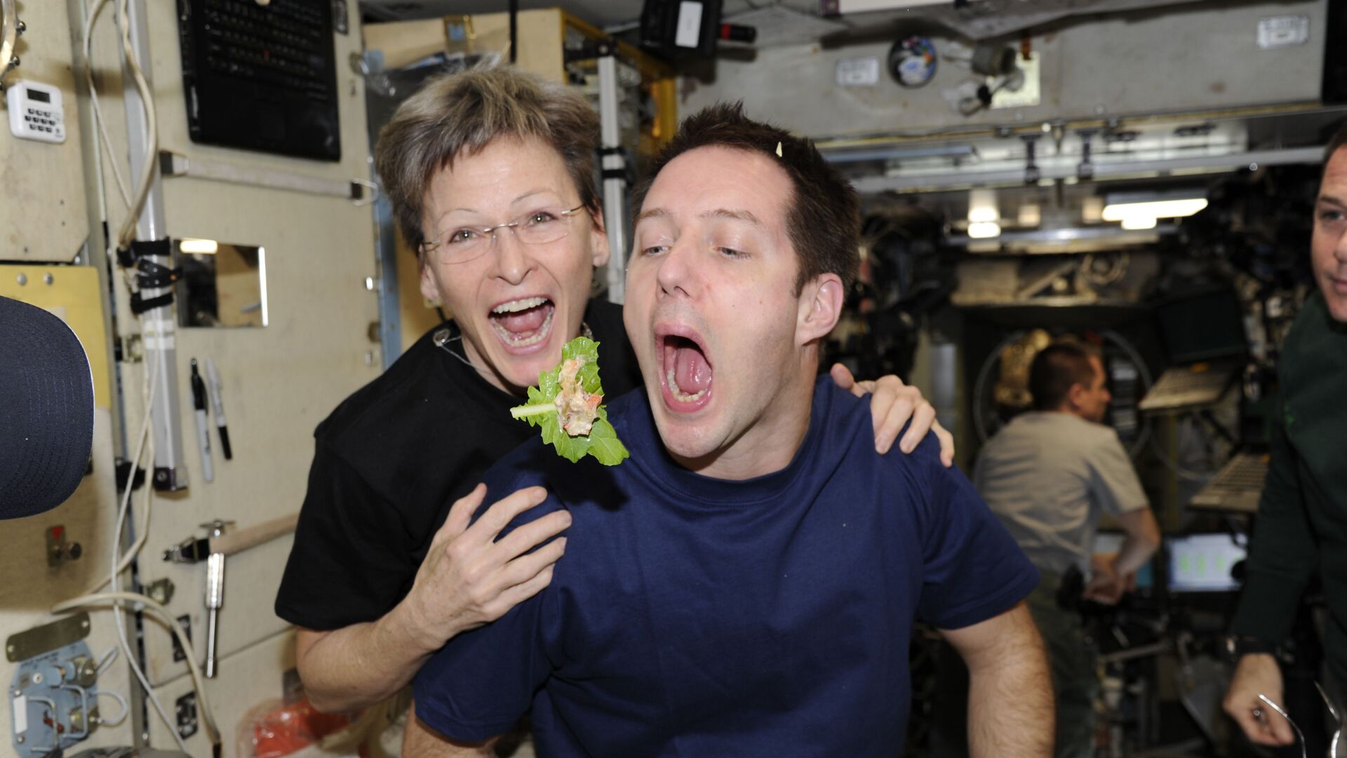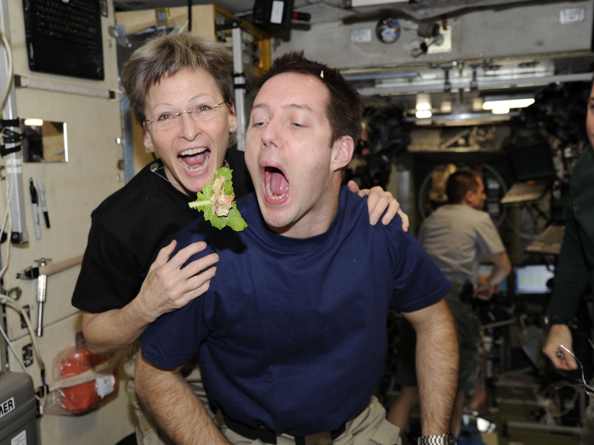 رائد الفضاء الفرنسي توما بيسشي، ورائدة الفضاء في "ناسا" بيجي ويتسون، يأكلان الخس الذي تم زراعته على متن محطة الفضاء الدولية