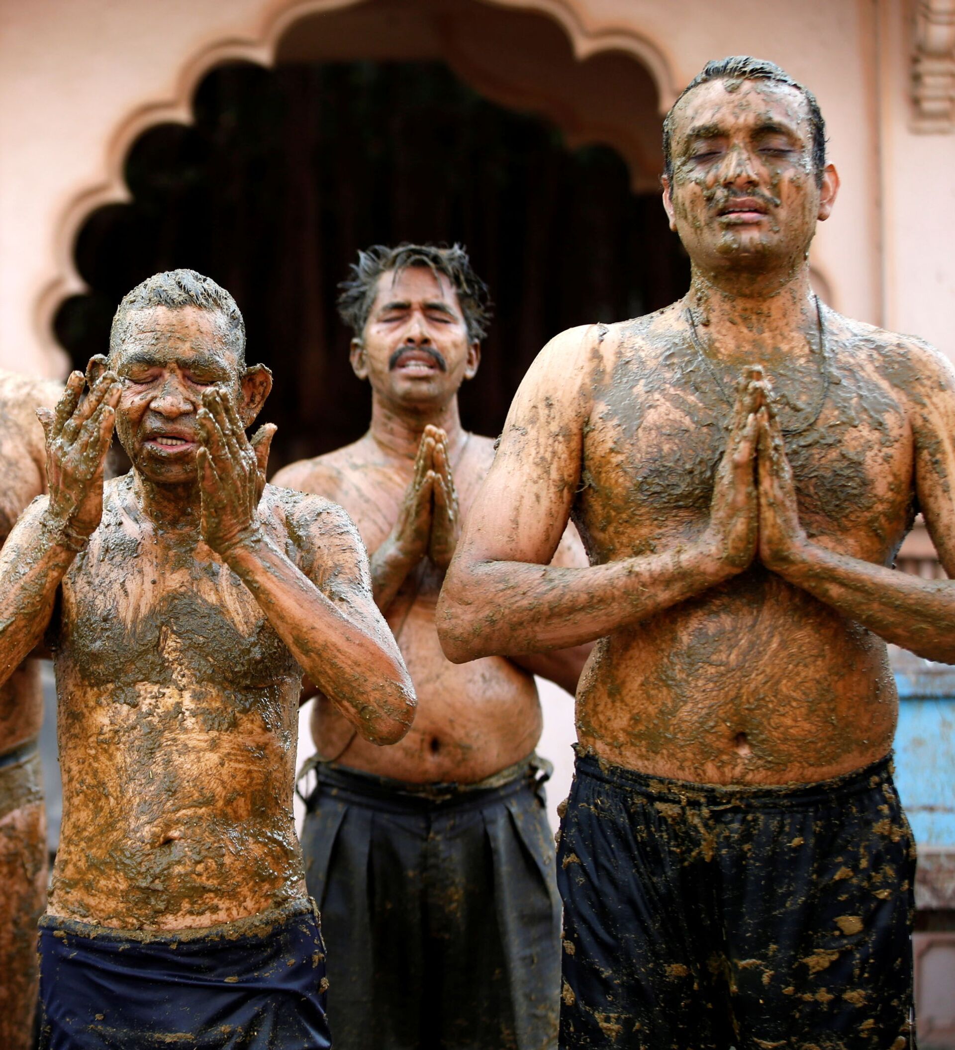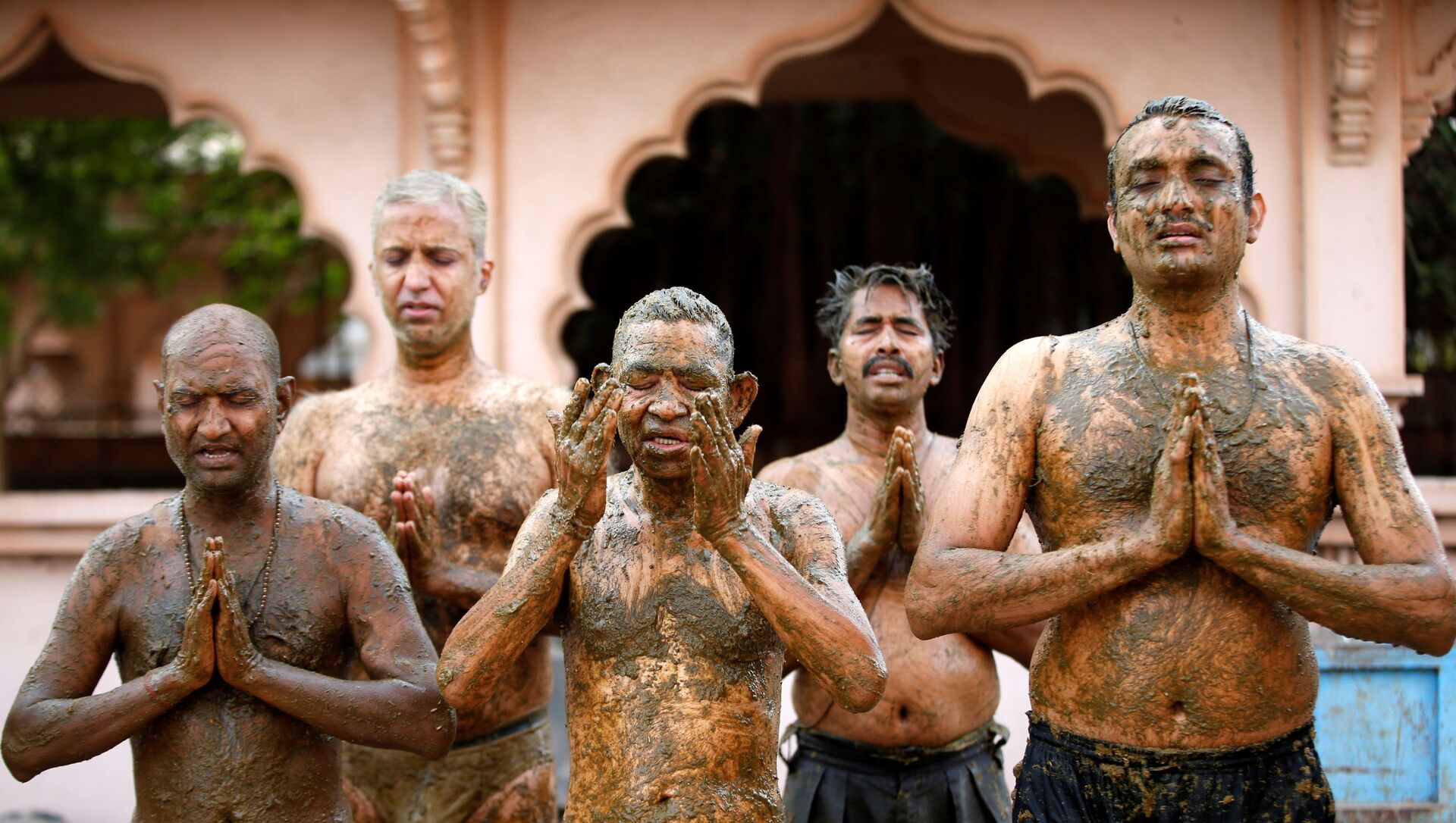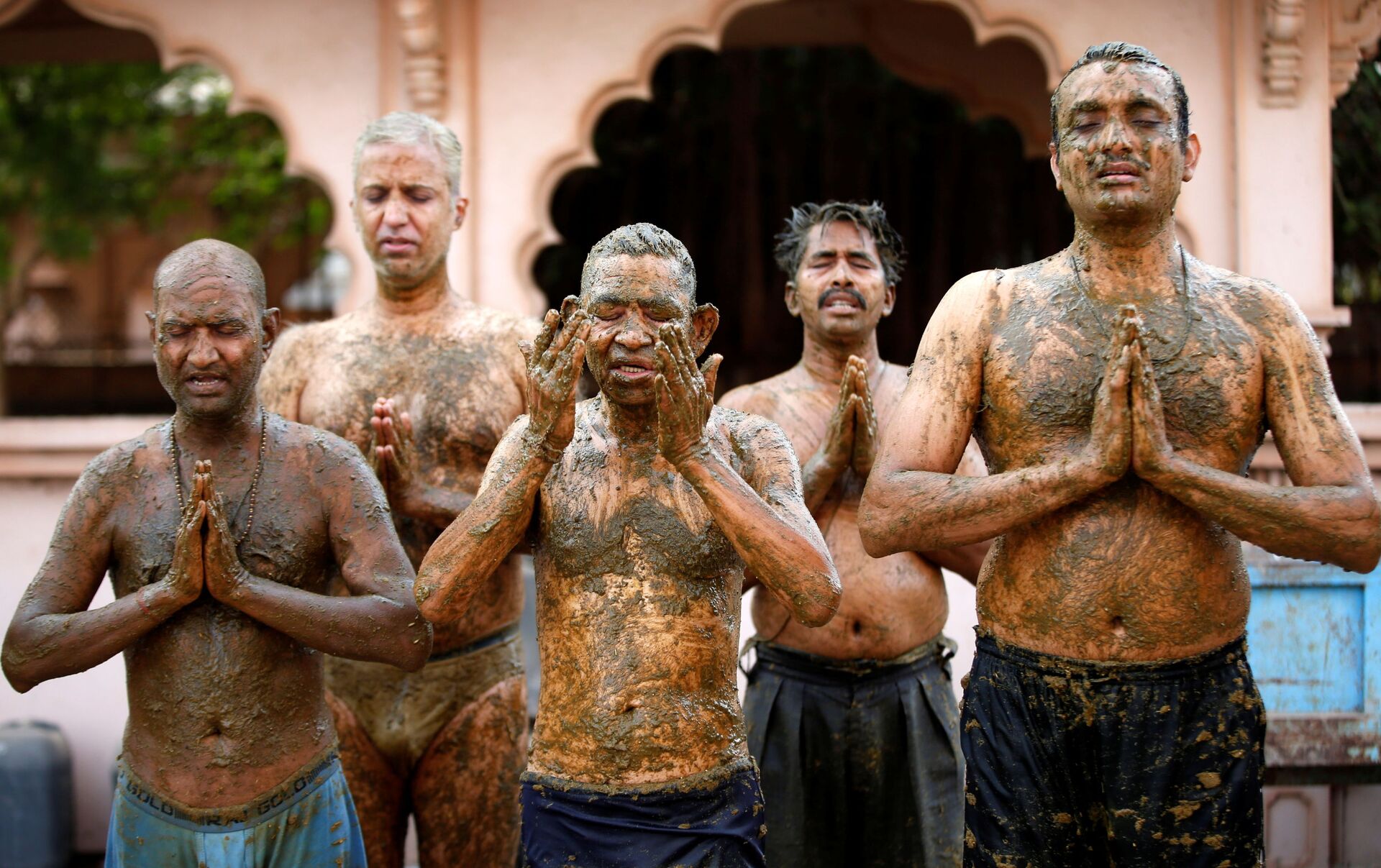 يلجأ بعض الهنود إلى دهن أجسادهم بروث البقر فيما يسمى بـ"علاج روث الأبقار"، وذلك اعتقادا منهم أنه يعزز مناعتهم للدفاع ضد "كوفيد-19"، وذلك في "ملجأ الأبقار" في ضواحي أحمد آباد في الهند.