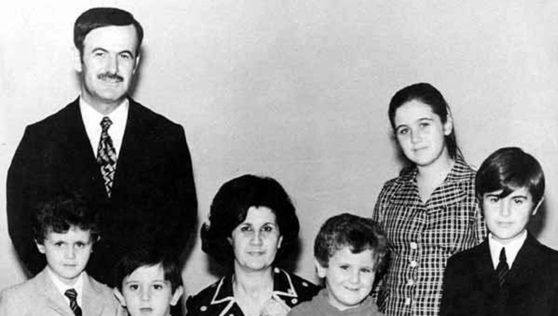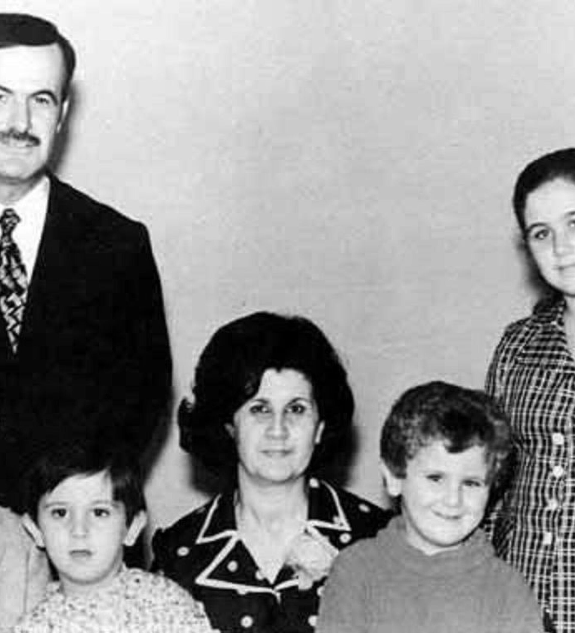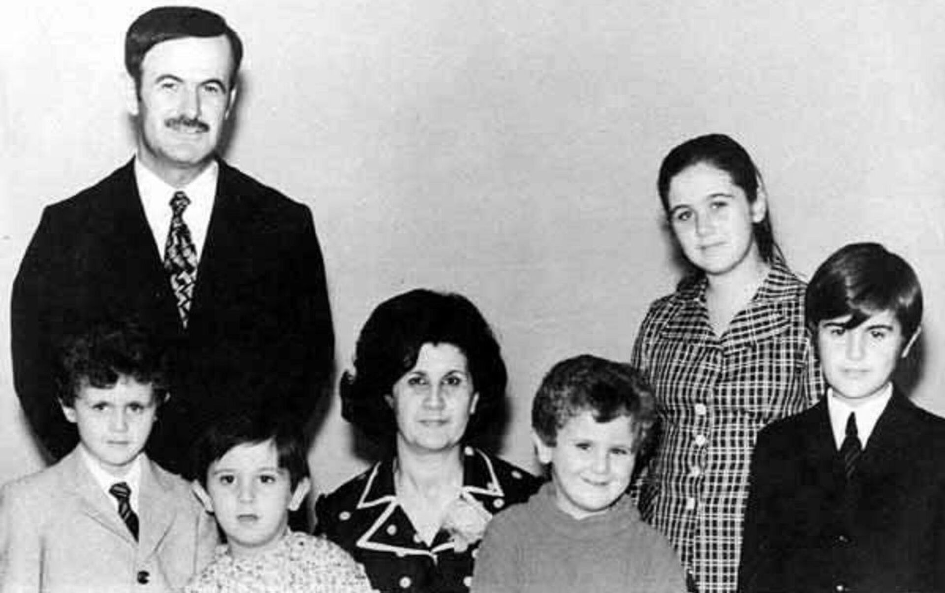 من اليسار إلى اليمين: الرئيس السوري الحالي بشار الأسد (موالد عام 1965)، برفقة والده حافظ الأسد، ووالدته أنيسة مخلوف، وأخوته: ماهر، مجد، بشرى، وباسل، أوائل السبعينات.