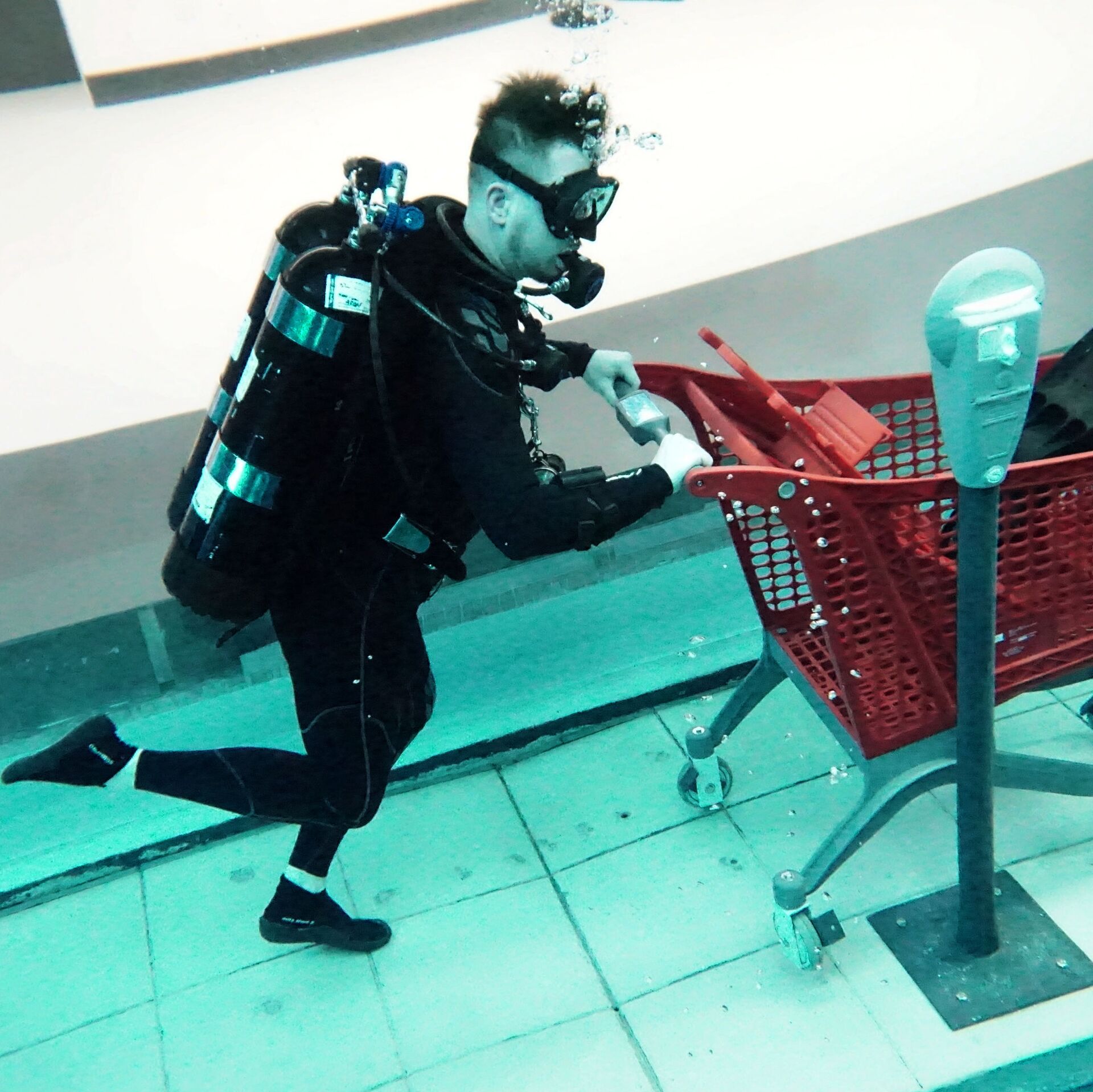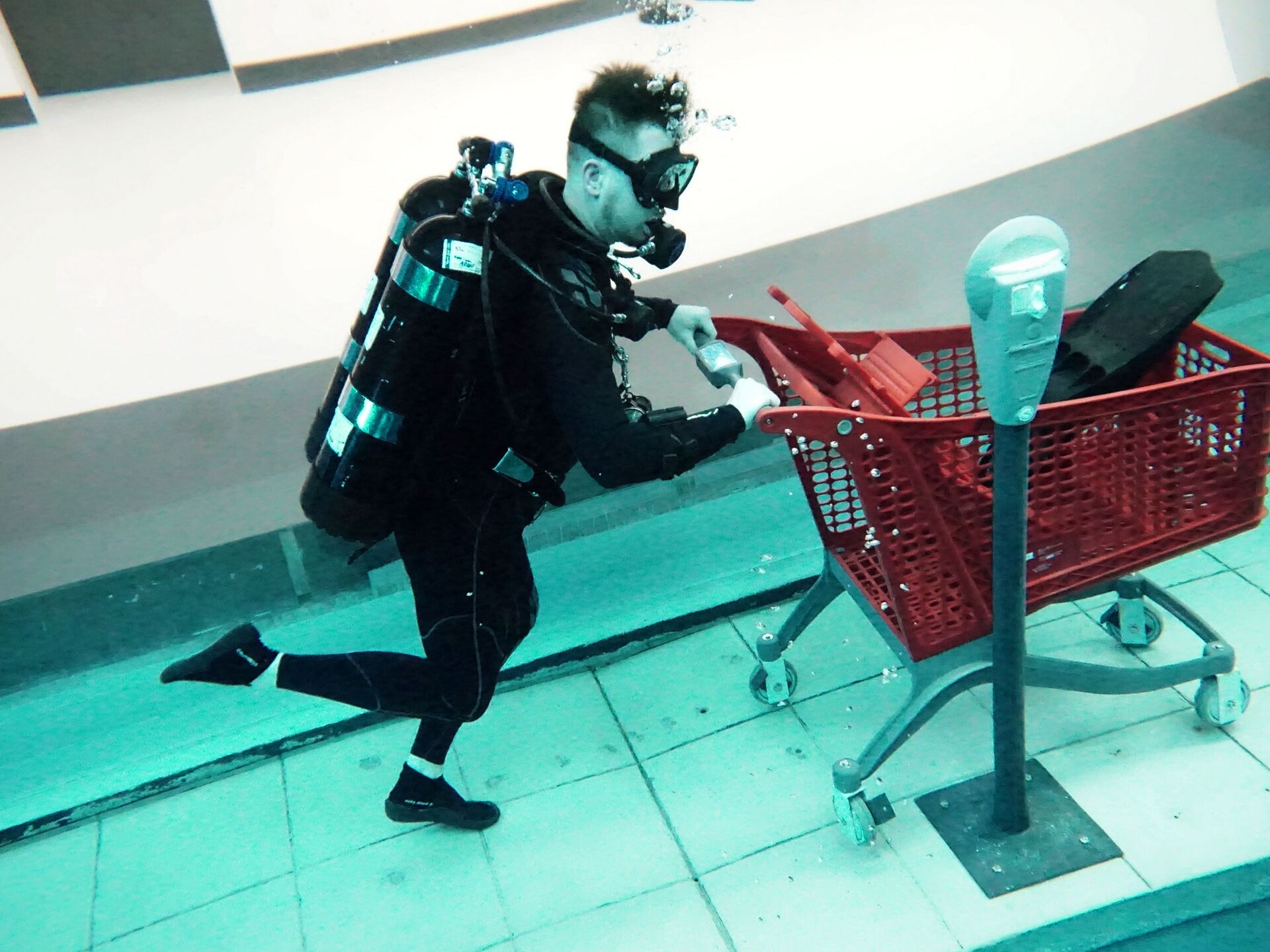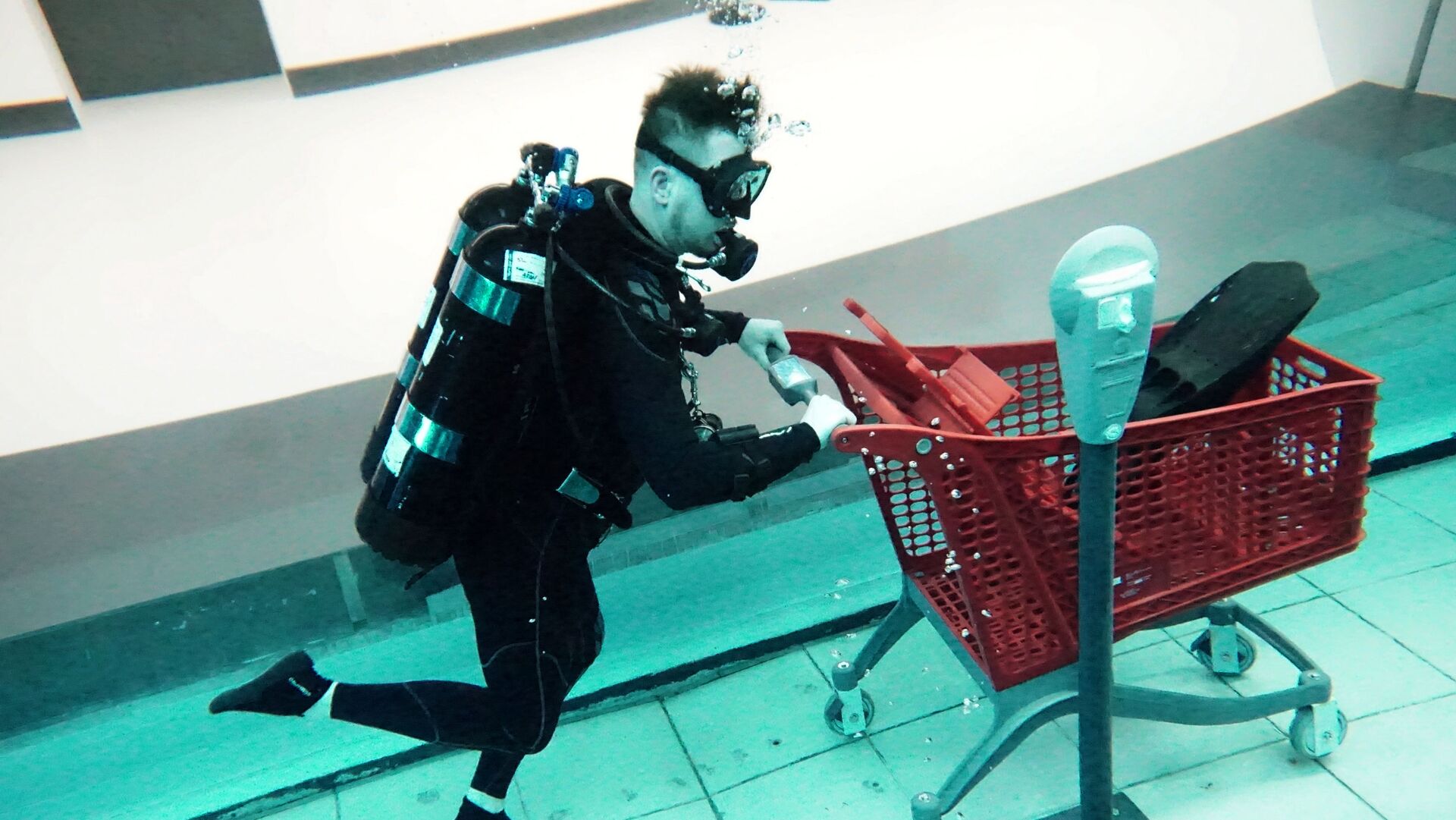 غطاس يستخدم عربة التسوق في أعمق مسبح للغطس في العالم، "ديب دايف دبي"، الإمارات العربية المتحدة، 10 يوليو 2021