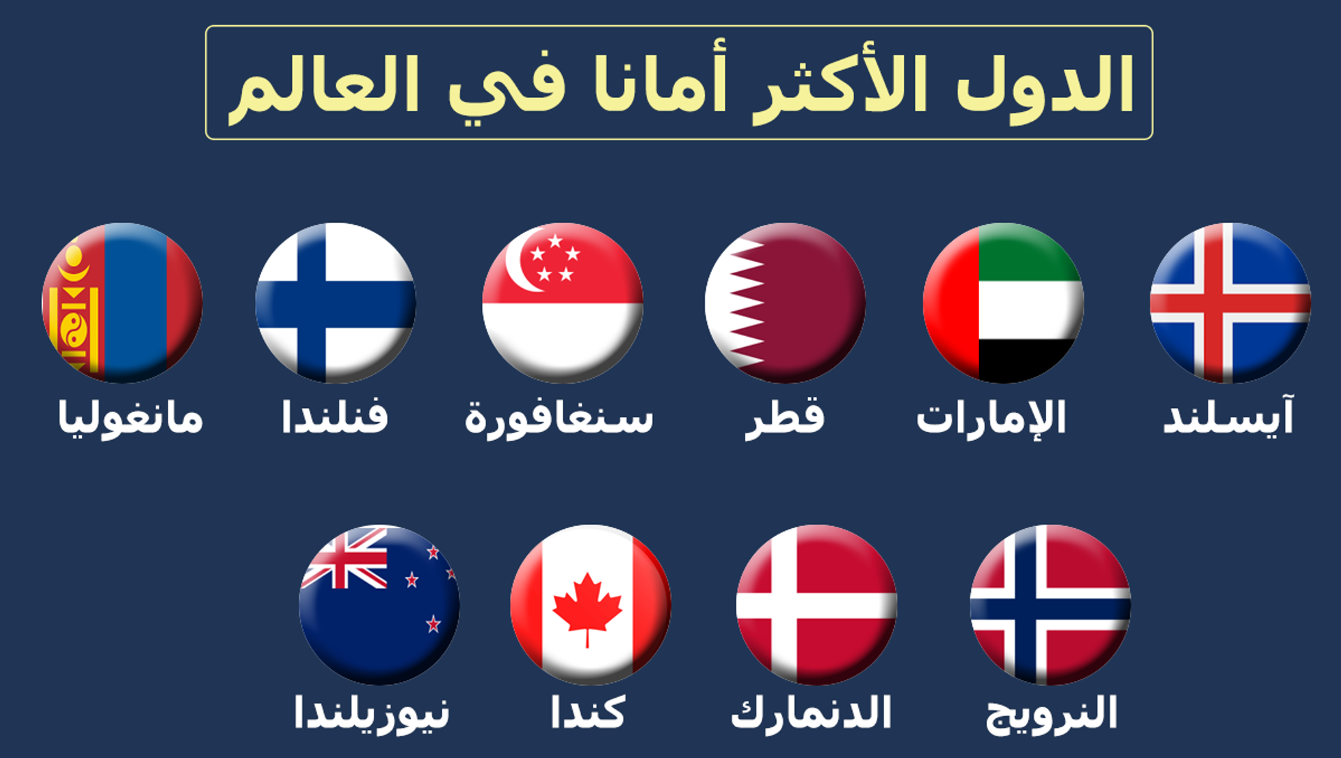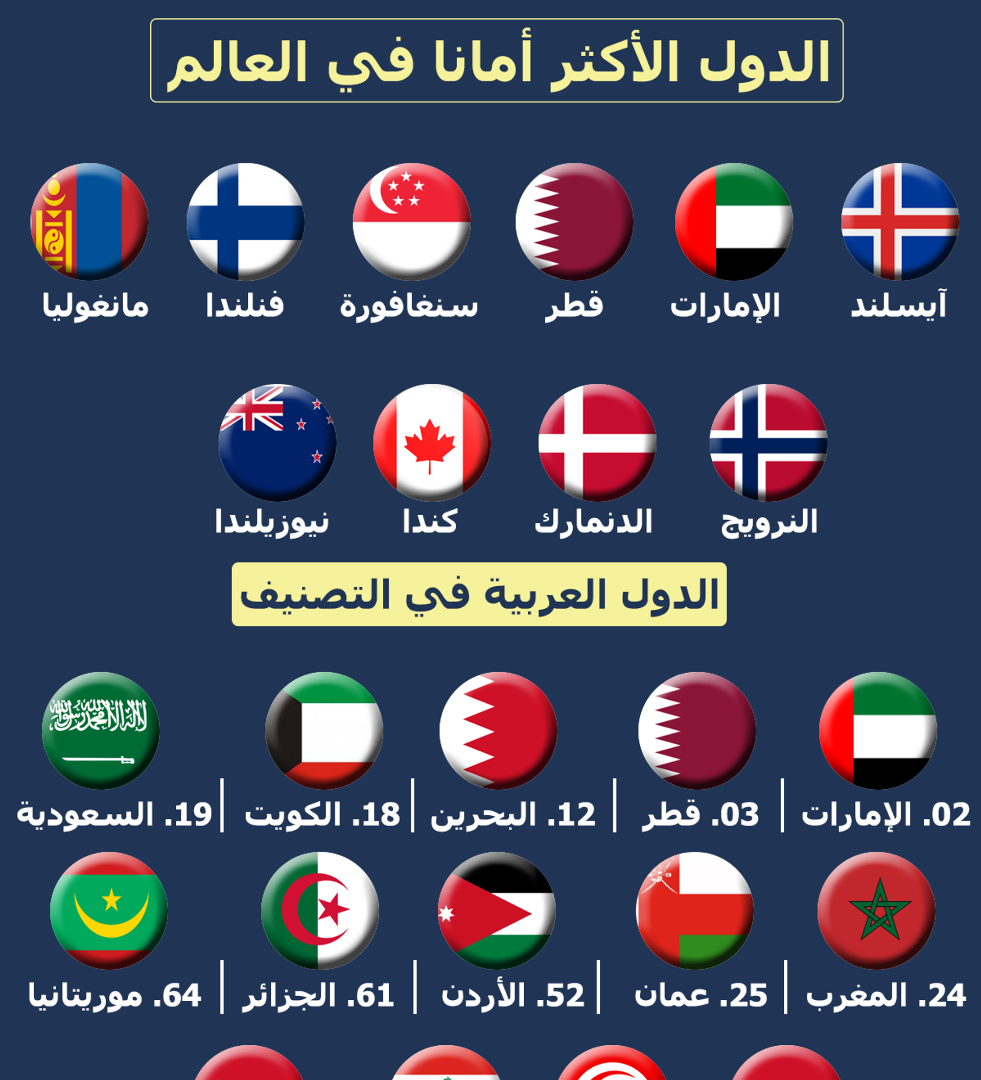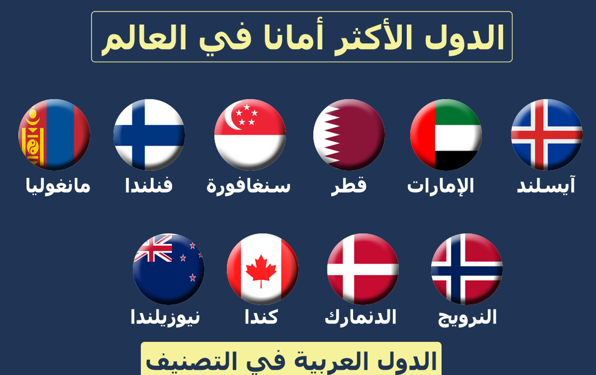 حلت خمسة بلدان عربية في تصنيف الدول العشرين الأكثر أمانا في العالم لعام 2021، والذي تصدره مجلة "جلوبال فايننس" بشكل سنوي، ويتضمن هذا العام بيانات حول مخاطر الوباء.