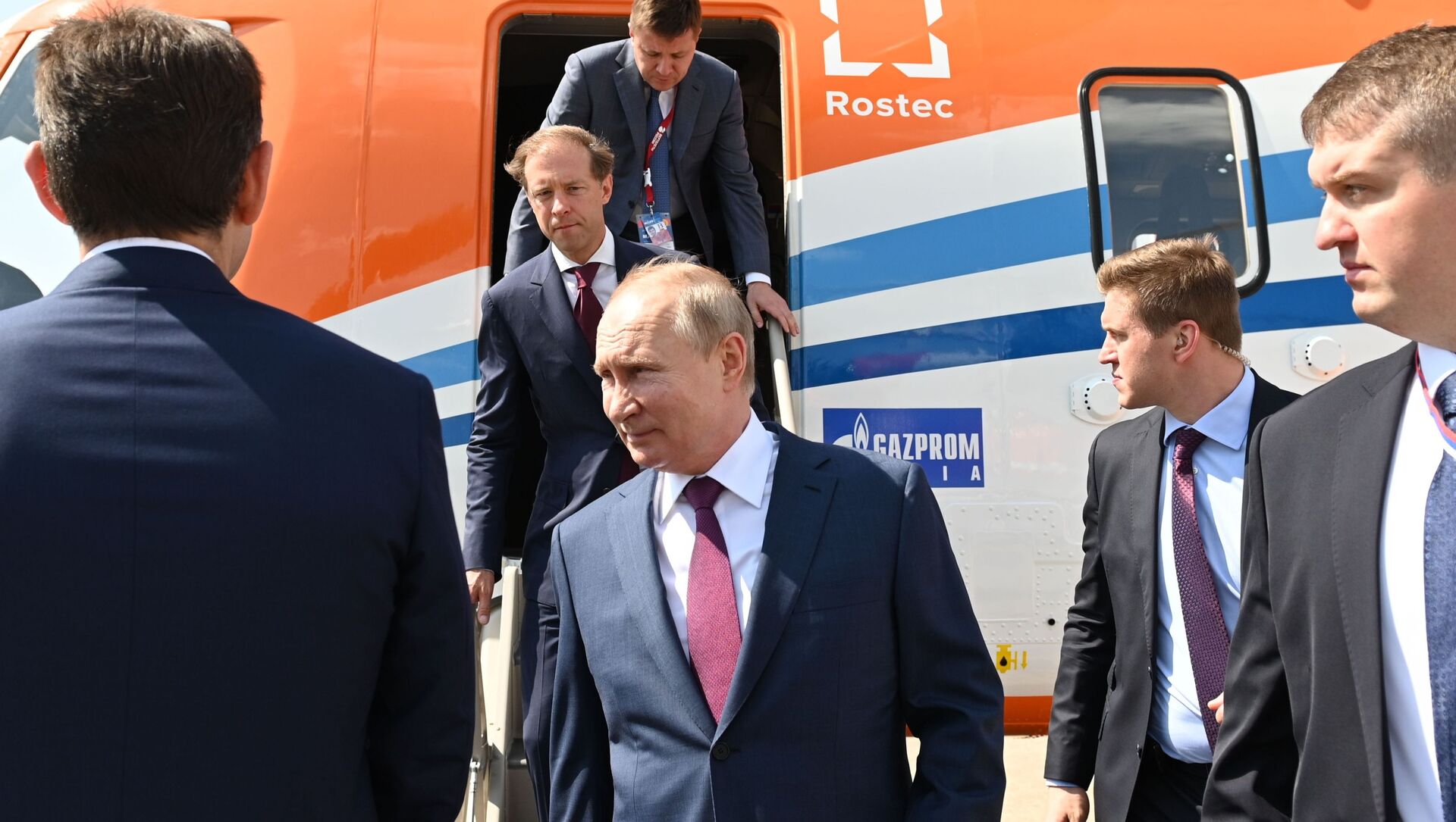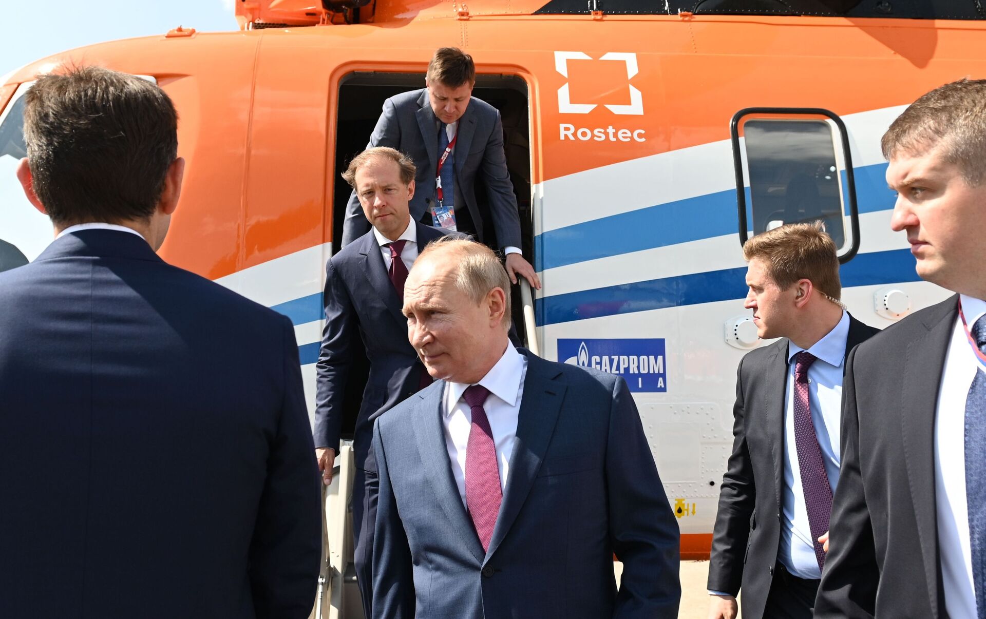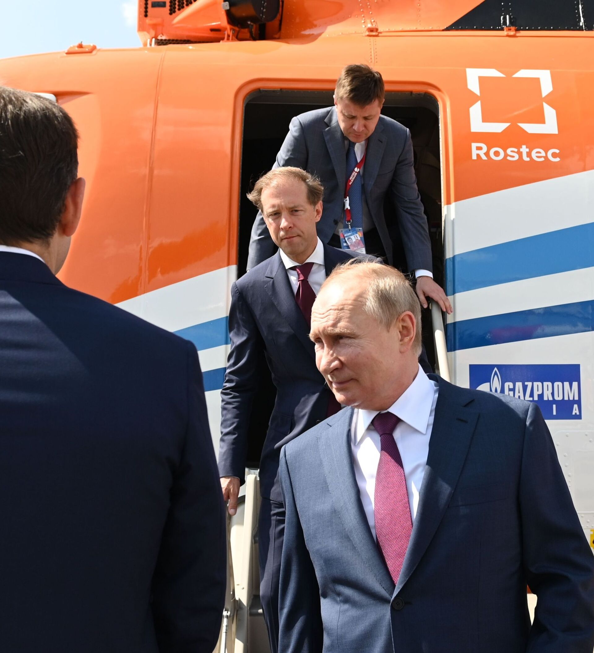 الرئيس الروسي، فلاديمير بوتين، والمدير التنفيذي لشركة "روستيخ" الروسية، سيرغي تشيميزوف، يشاركان في مراسم افتتاح معرض الطيران والفضاء الدولي "ماكس 2021" في مطار جوكوفسكي، ضواحي موسكو، روسيا 20 يوليو 2021