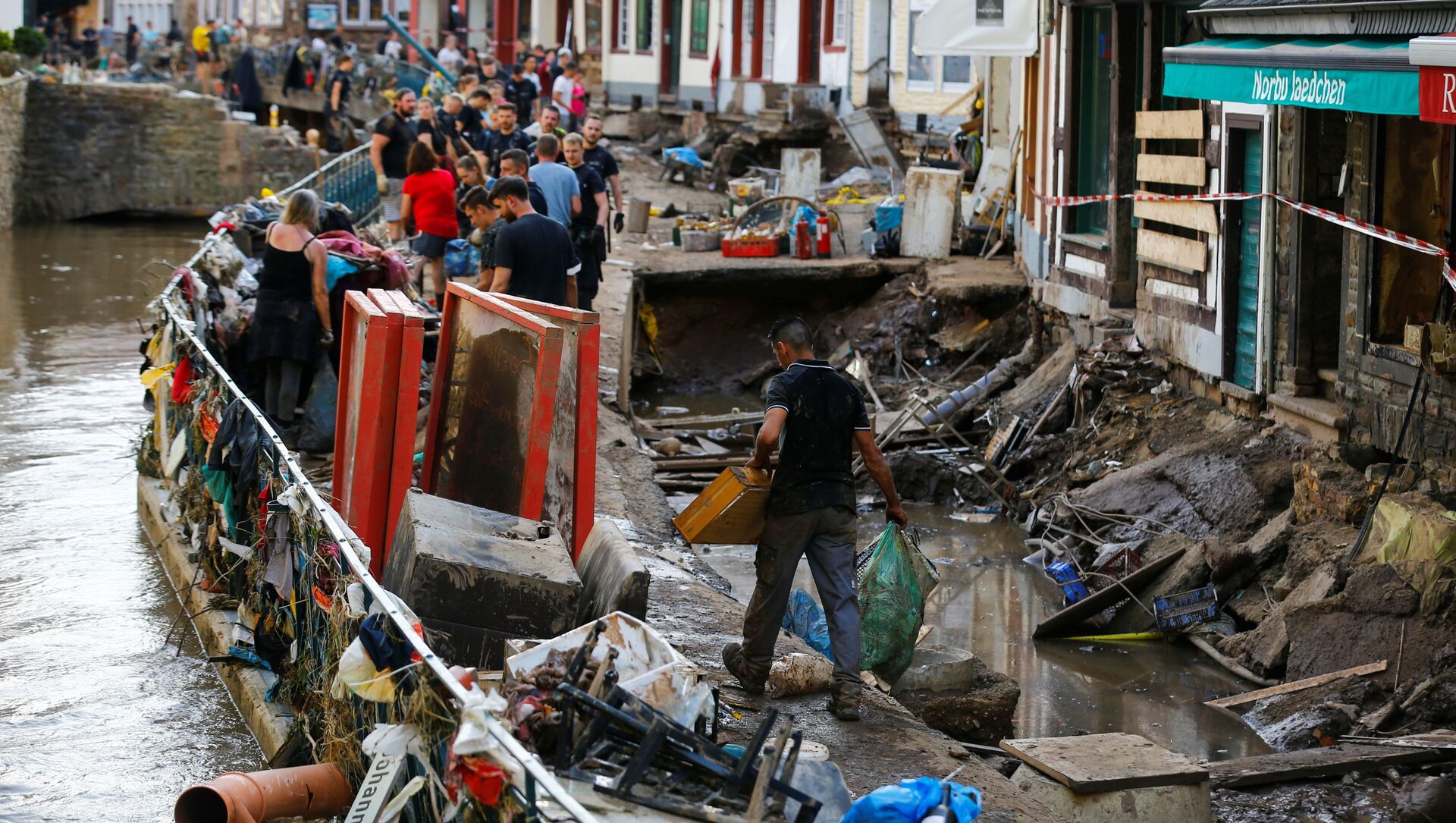 © REUTERS / Thilo Schmuelgenمتطوعون وأفراد الشرطة يقومون بتنظيف منطقة تضررت بمياه الفيضانات في مدينة باد مونستر آيفل، ألمانيا 17 يوليو 2021
