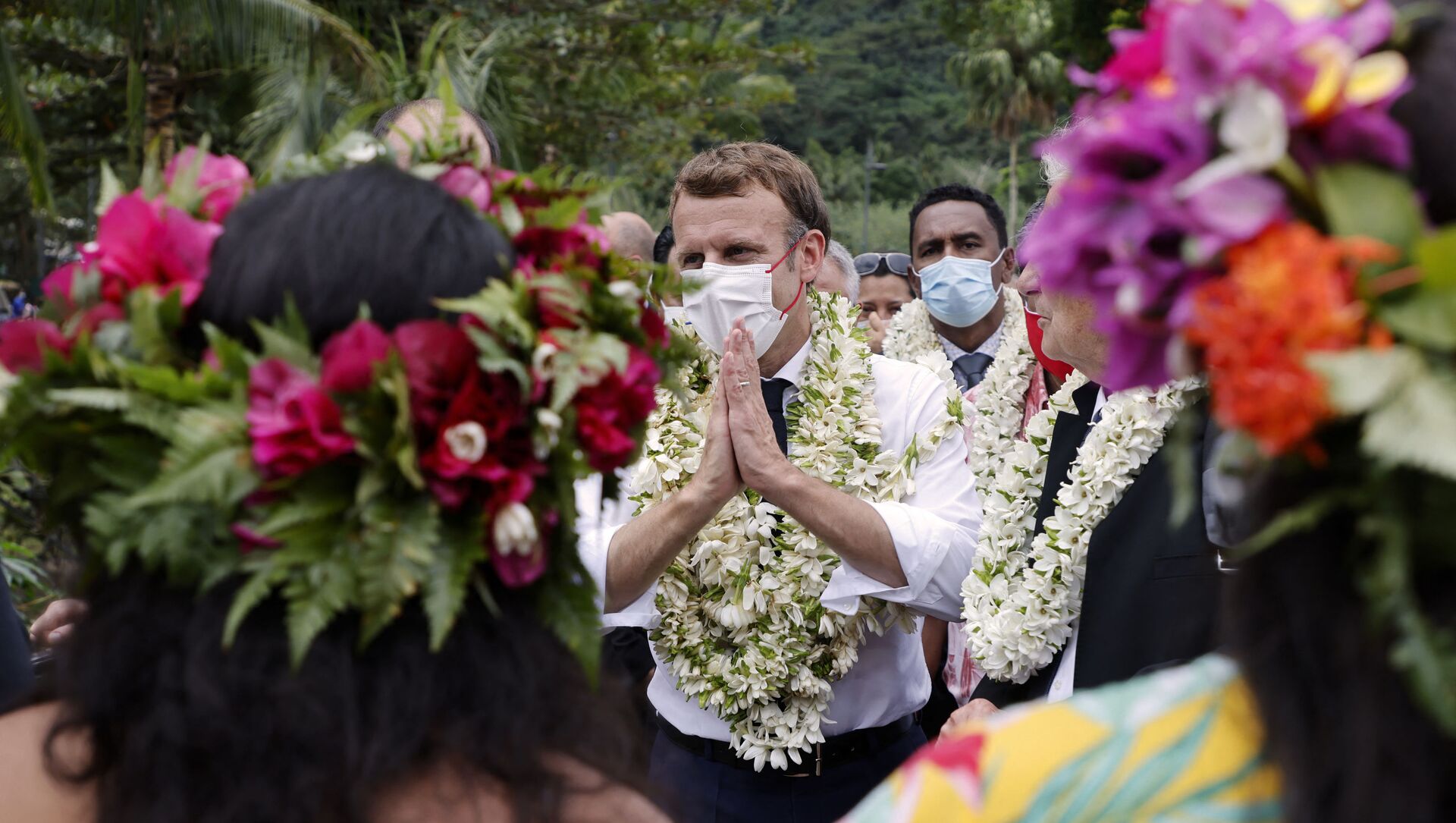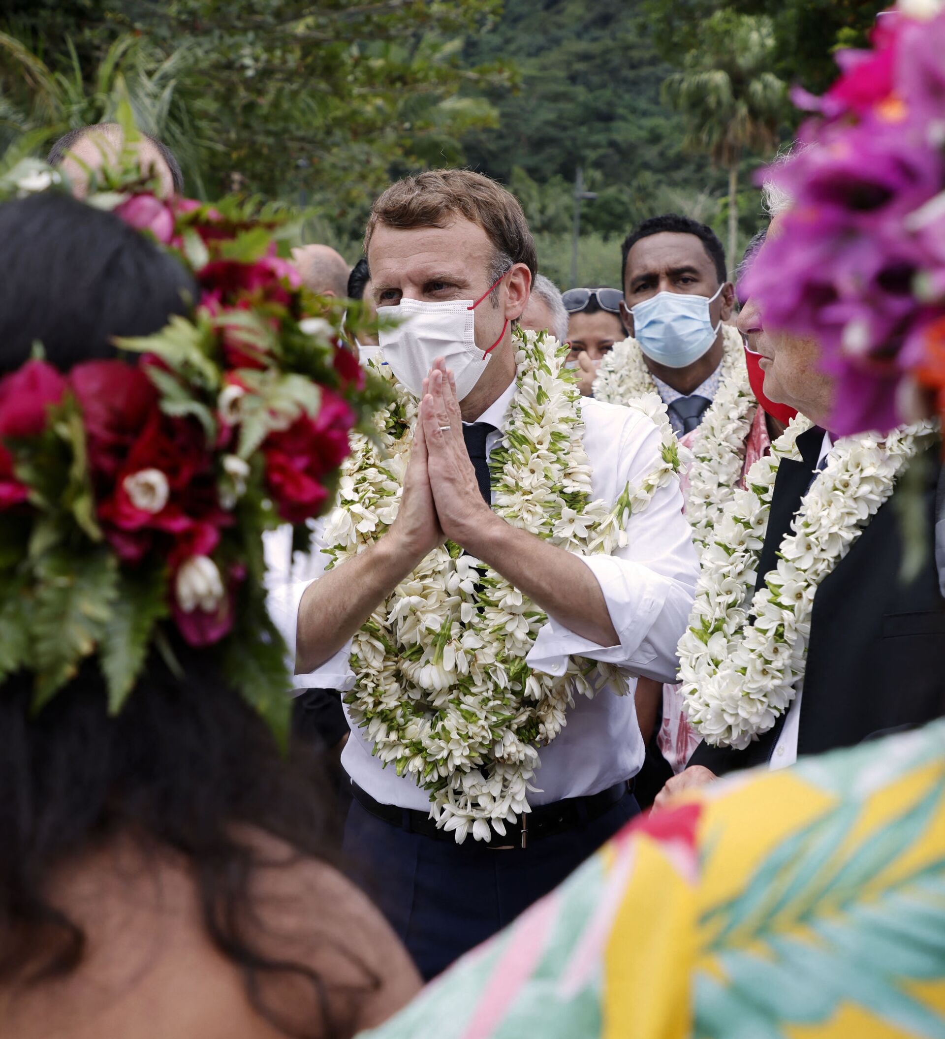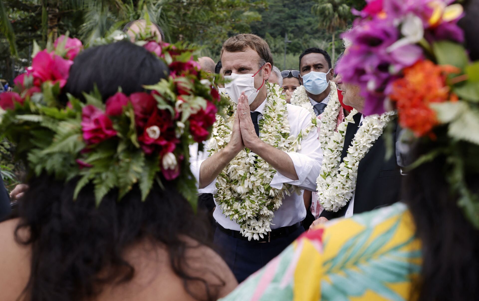 يشارك فنانون وراقصون تقليديون في عرض ثقافي لزيارة الرئيس الفرنسي إيمانويل ماكرون، في ملعب أثناء زيارته إلى أتونا في هيفا أوا، ثاني أكبر جزيرة في جزر ماركيساس، بولينيزيا الفرنسية في 25 يوليو 2021