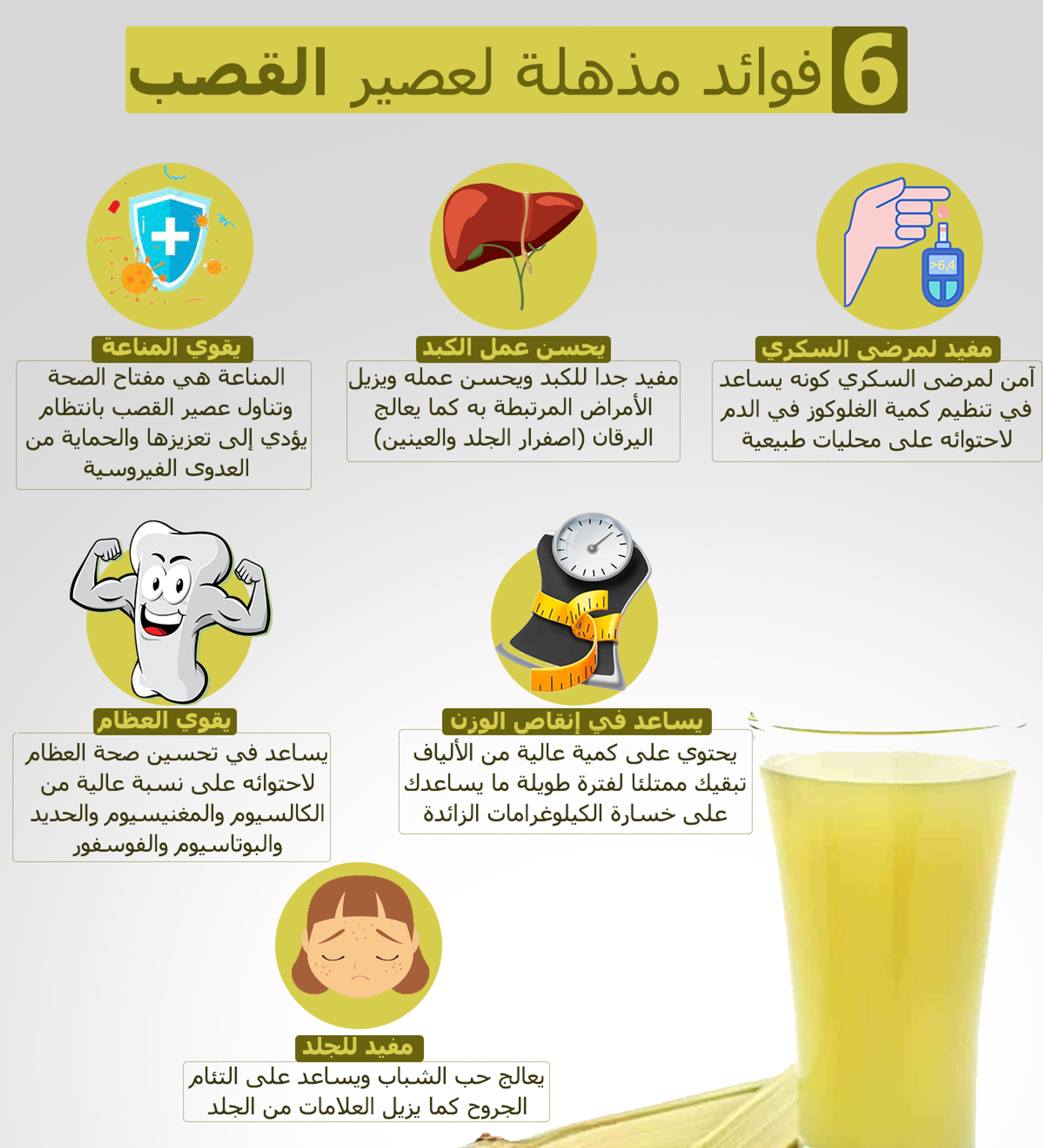 إلى جانب طعمه المنعش، يعتبر عصير قصب السكر مفيدا جدا للصحة، لاحتواءه على عناصر غذائية مهمة تعزز المناعة وتقي من عدة أمراض، إلى جانب احتوائه على نسبة منخفضة من السعرات.