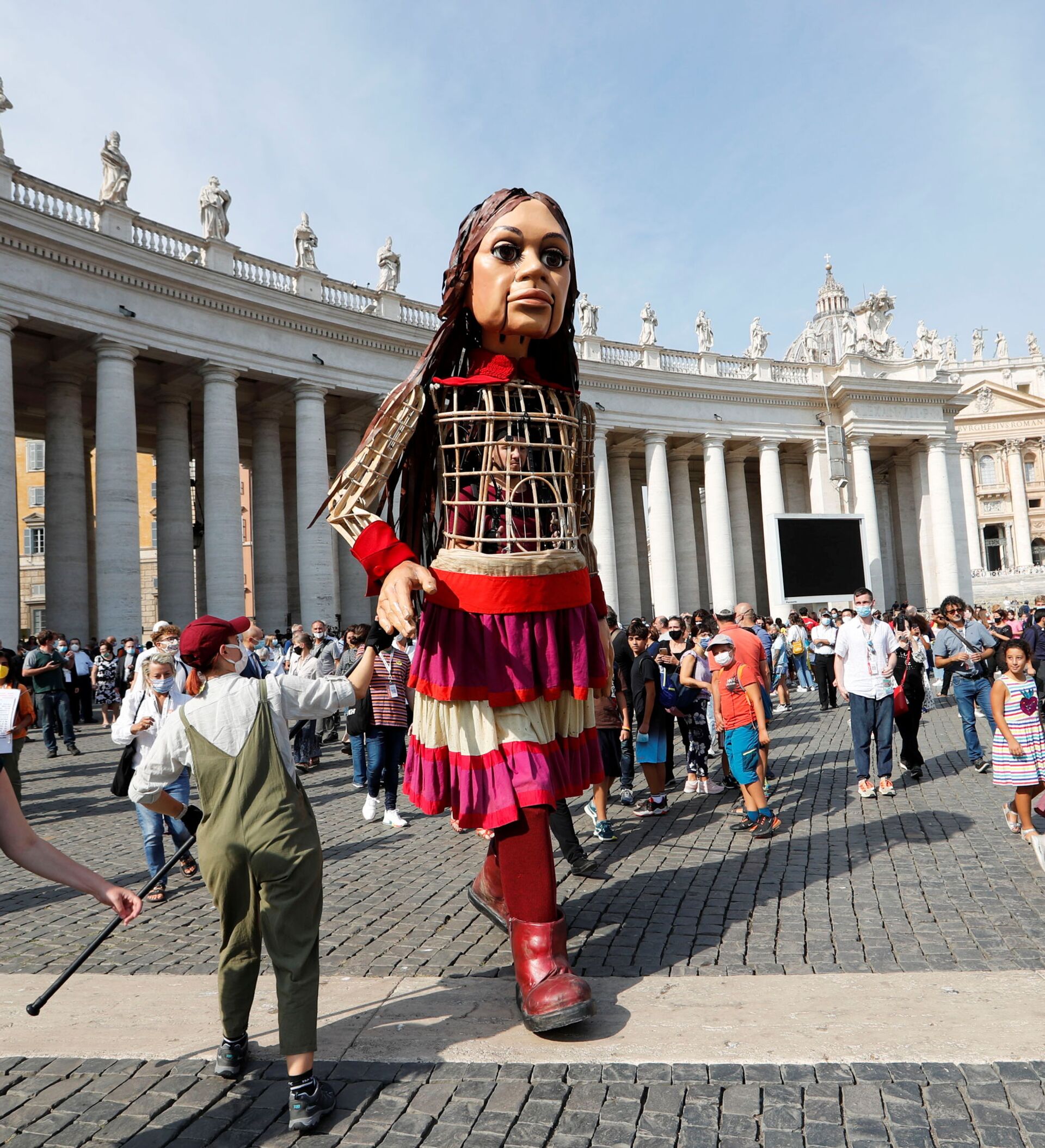 الصغيرة أمل، لعبة طولها 3.5 م، تمثل فتاة سورية، التي وصلت إلى الفاتيكان بعد رحلتها من التي انطلقت من تركيا إلى أوروبا، في إطار السير لـ 8000 كم من التوعية حول محنة اللاجئين الشباب، 10 سبتمبر 2021