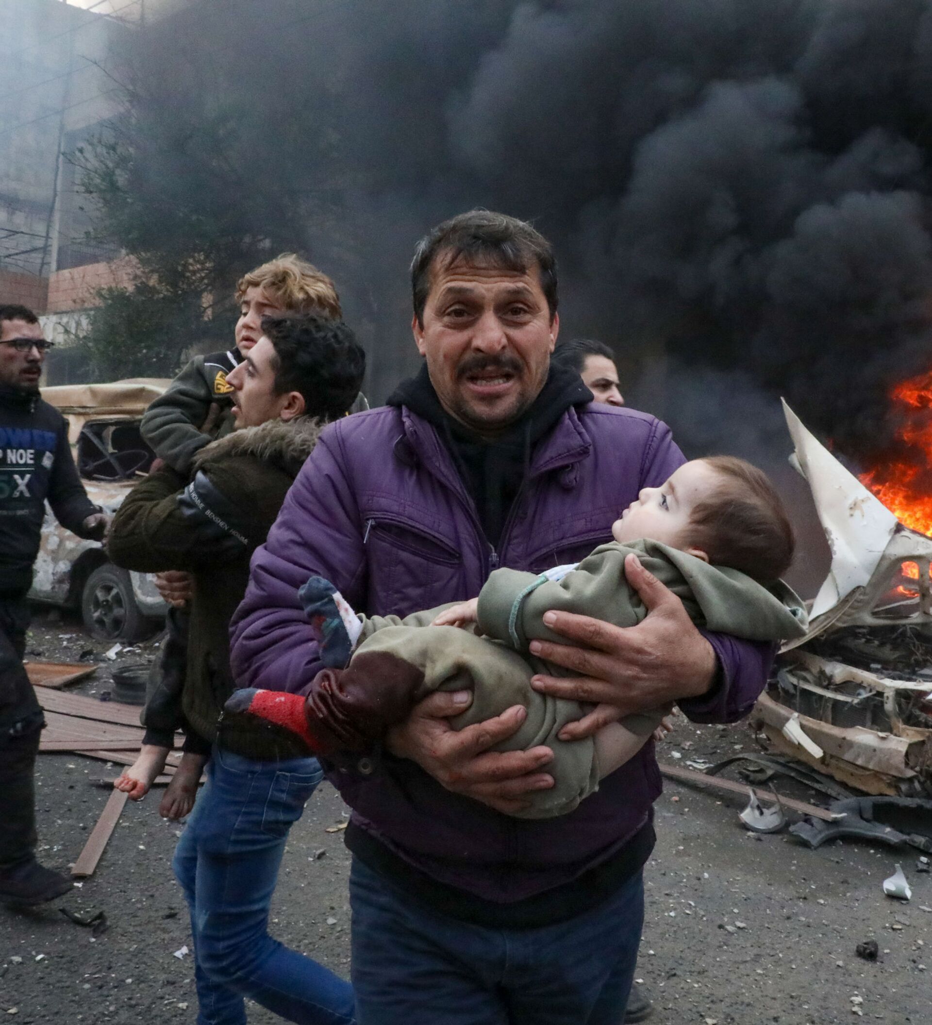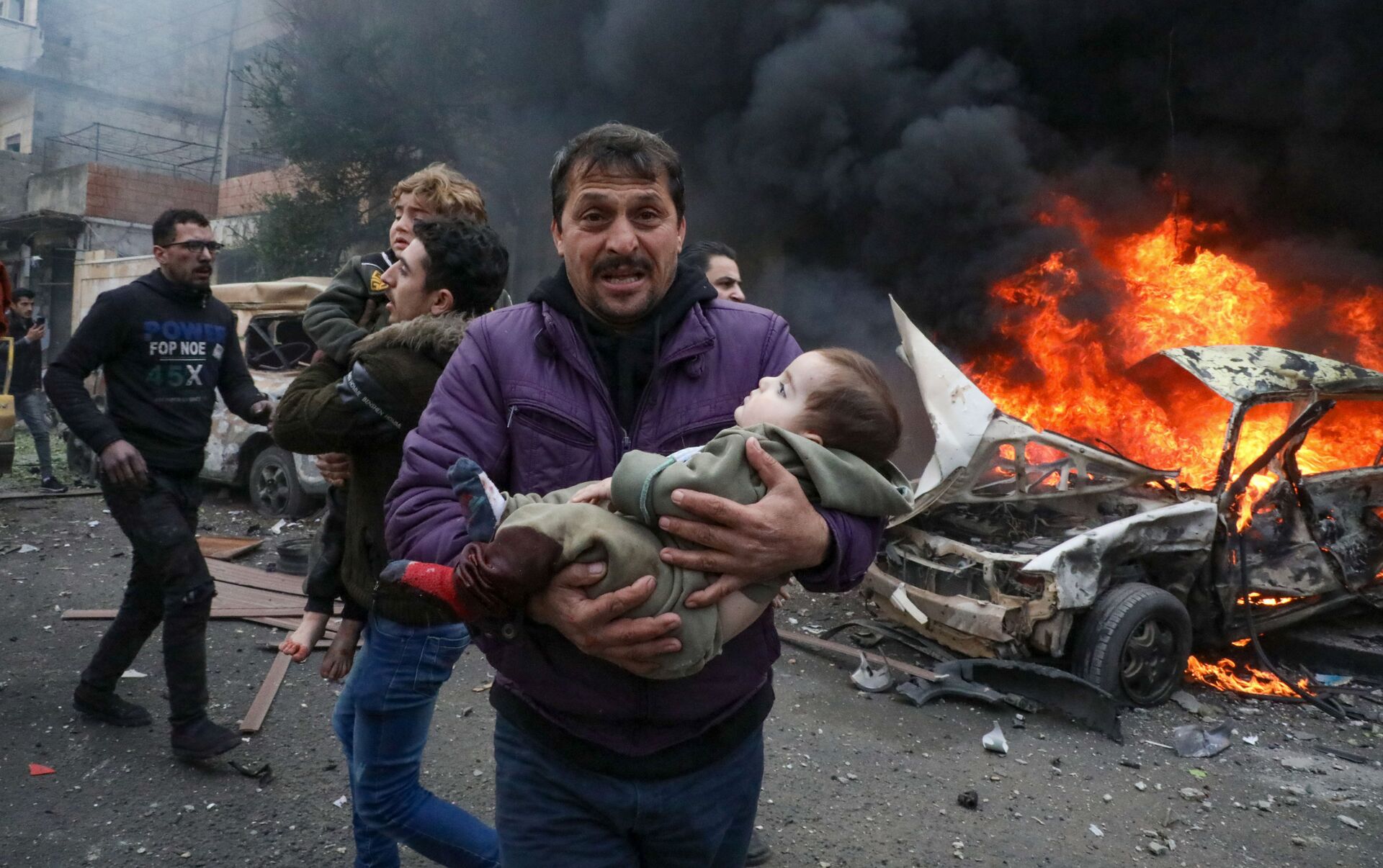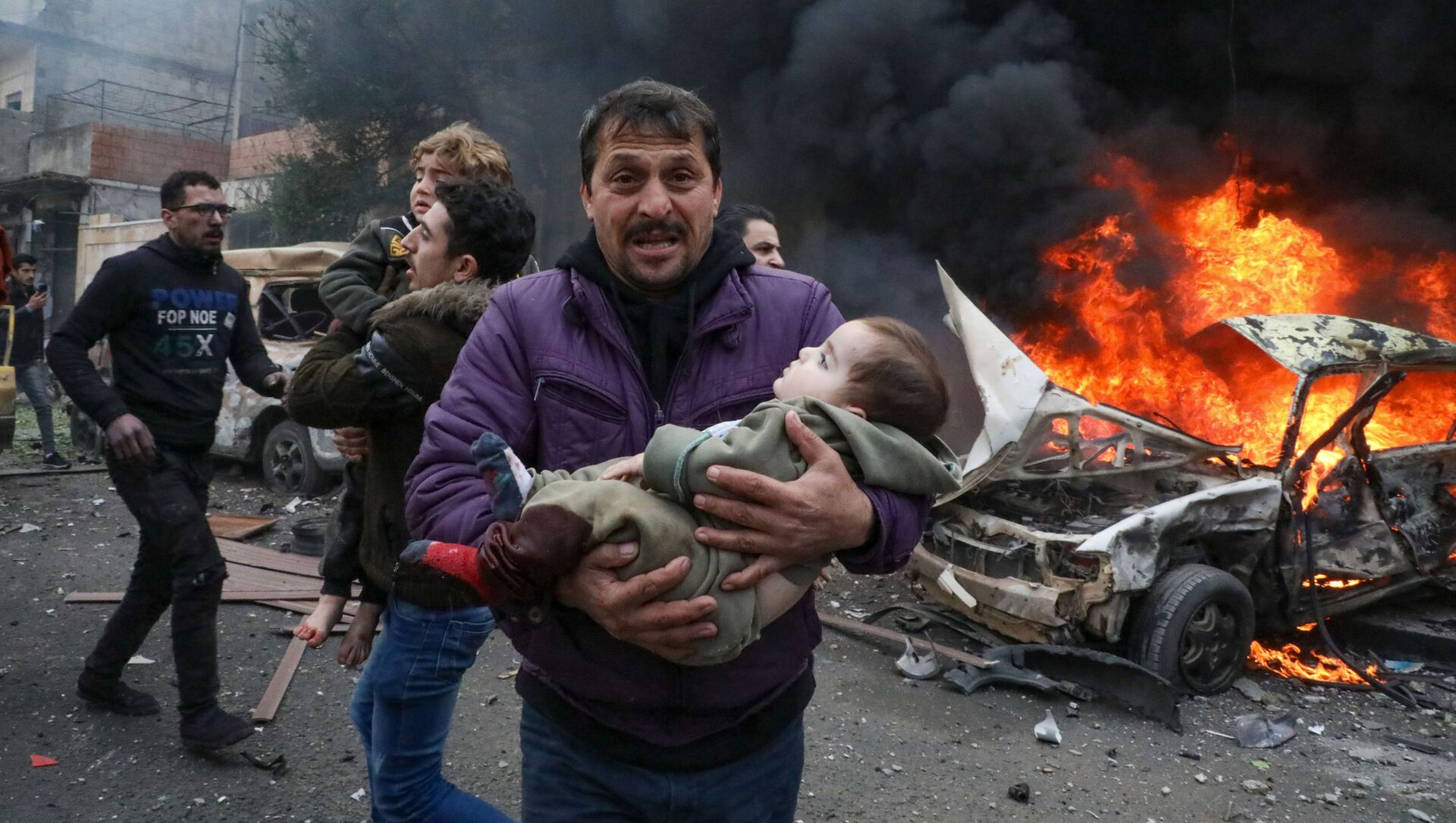 © AFP 2023 / Nayef Al-Aboudتحذير "محتوى حساس" - مدني يحمل ضحية صغيرة في موقع انفجار سيارة مفخخة ببلدة أعزاز بريف حلب الشمالي، سوريا 31 يناير2021