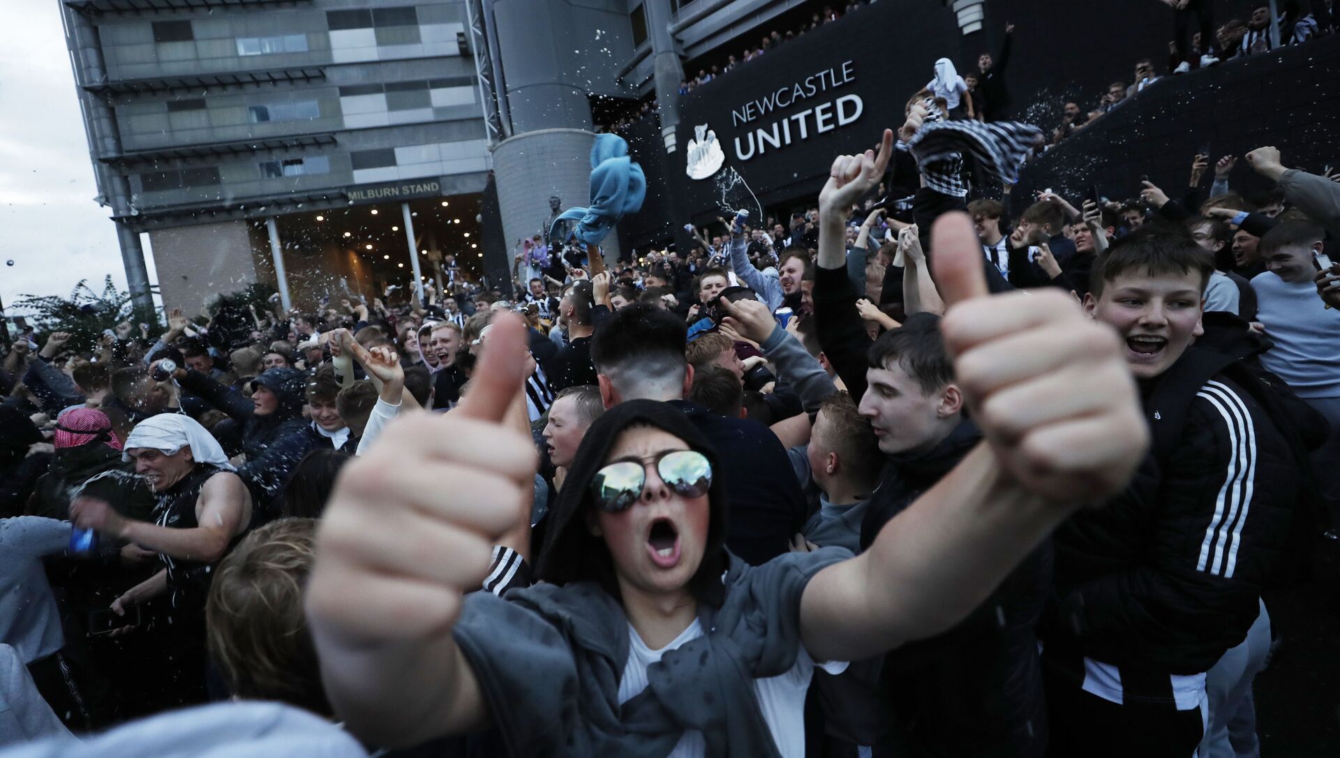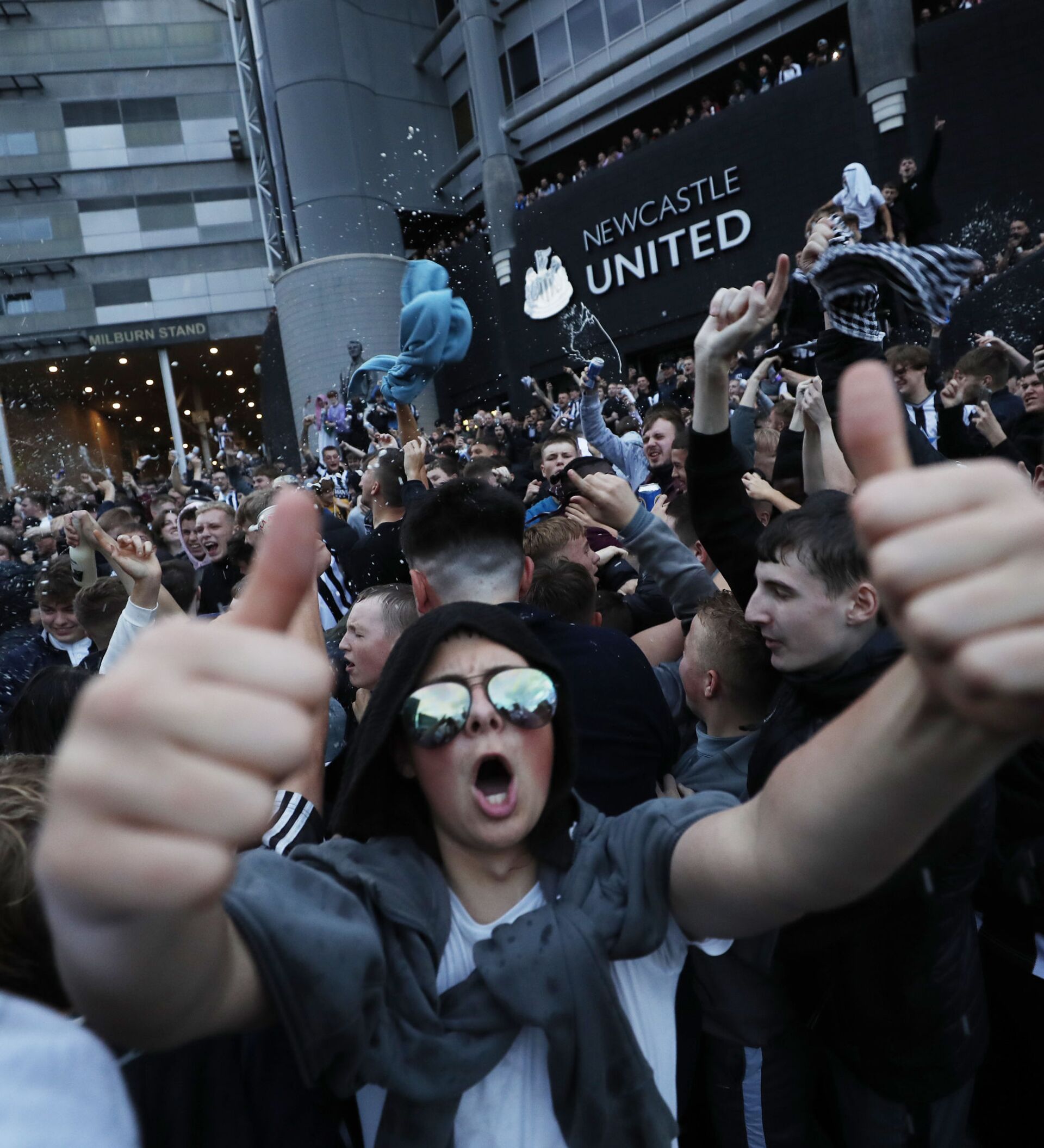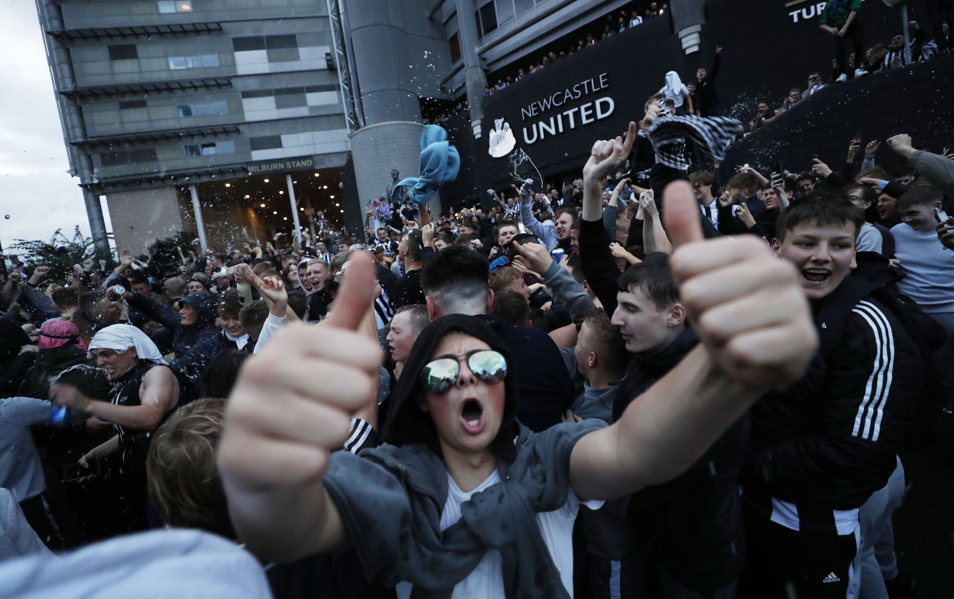 © REUTERS / LEE SMITHفرحة جماهير نيوكاسل يونايتد من أمام السانت جيمس بارك بعد الاعلان الرسمي عن استحواذ السعودية على نيوكاسل بنسبة 100%