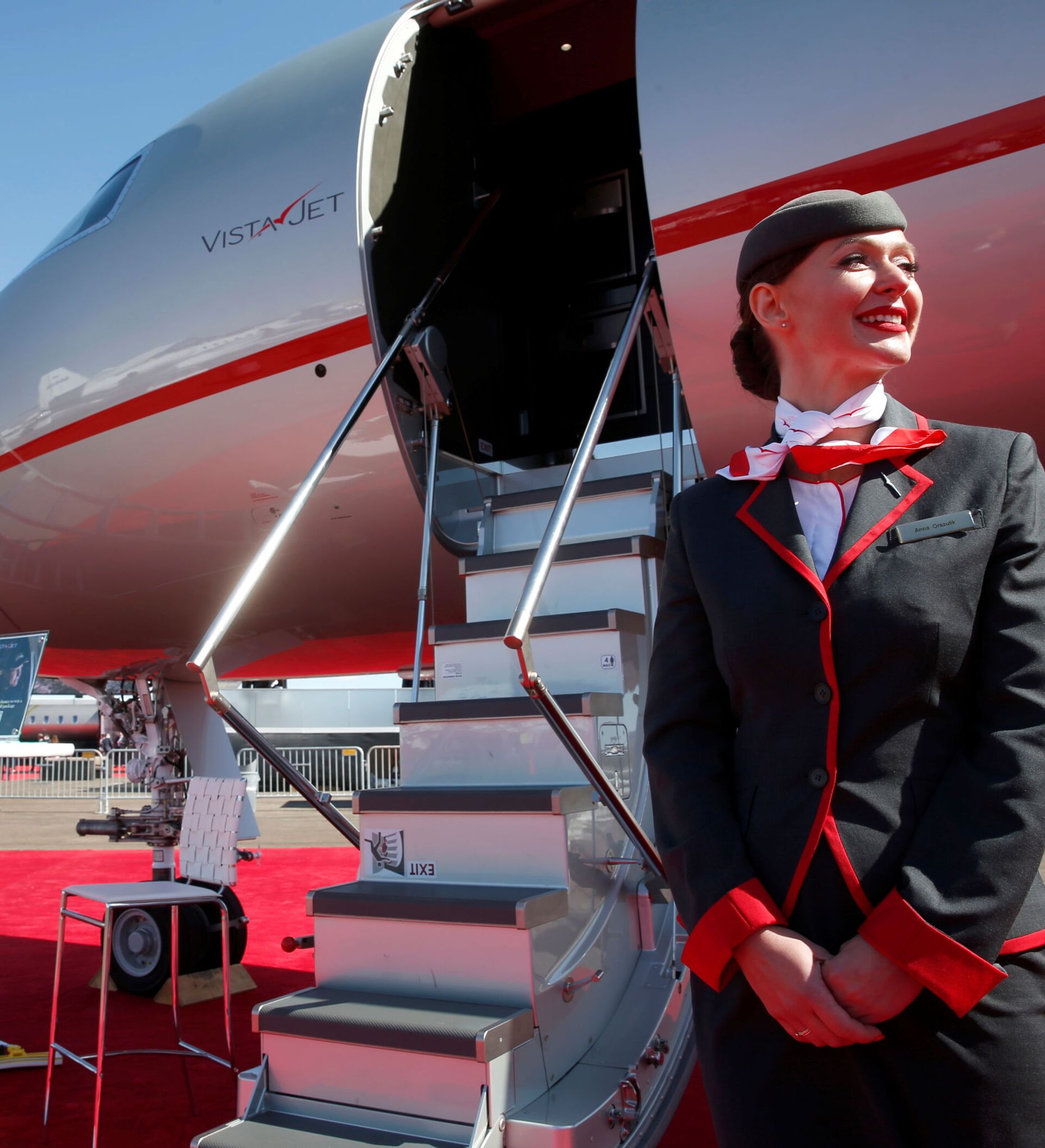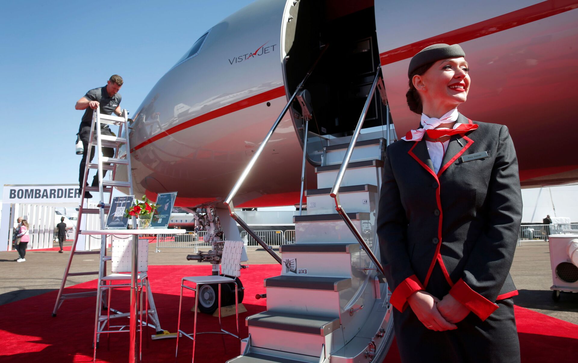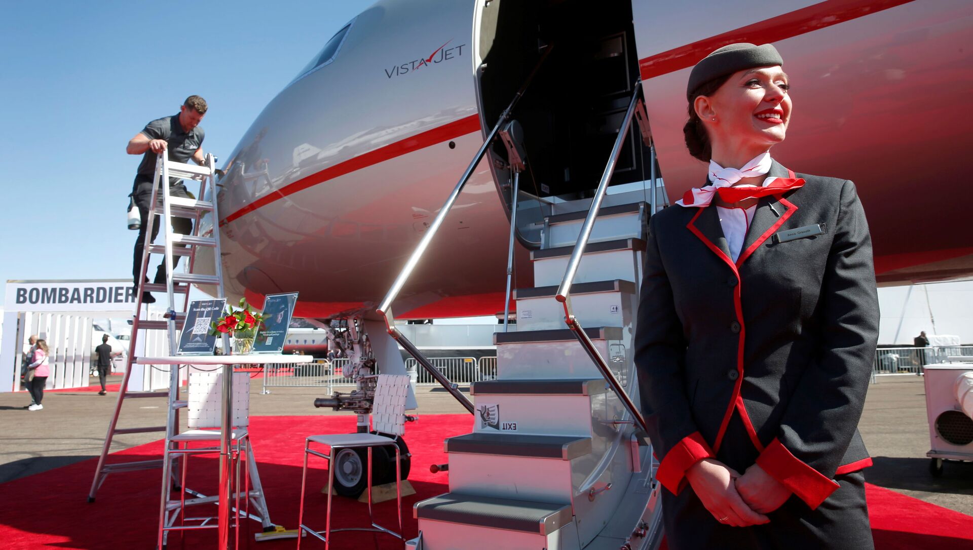 مضيفة الطيران، آنا أورزوليك، تقف أمام طائرة أعمال من طراز VistaJet Global 7500 في مطار هندرسون، خلال مؤتمر ومعرض طيران الأعمال NBAA في هندرسون، ولاية نيفادا، الولايات المتحدة ، 12 أكتوبر 2021.