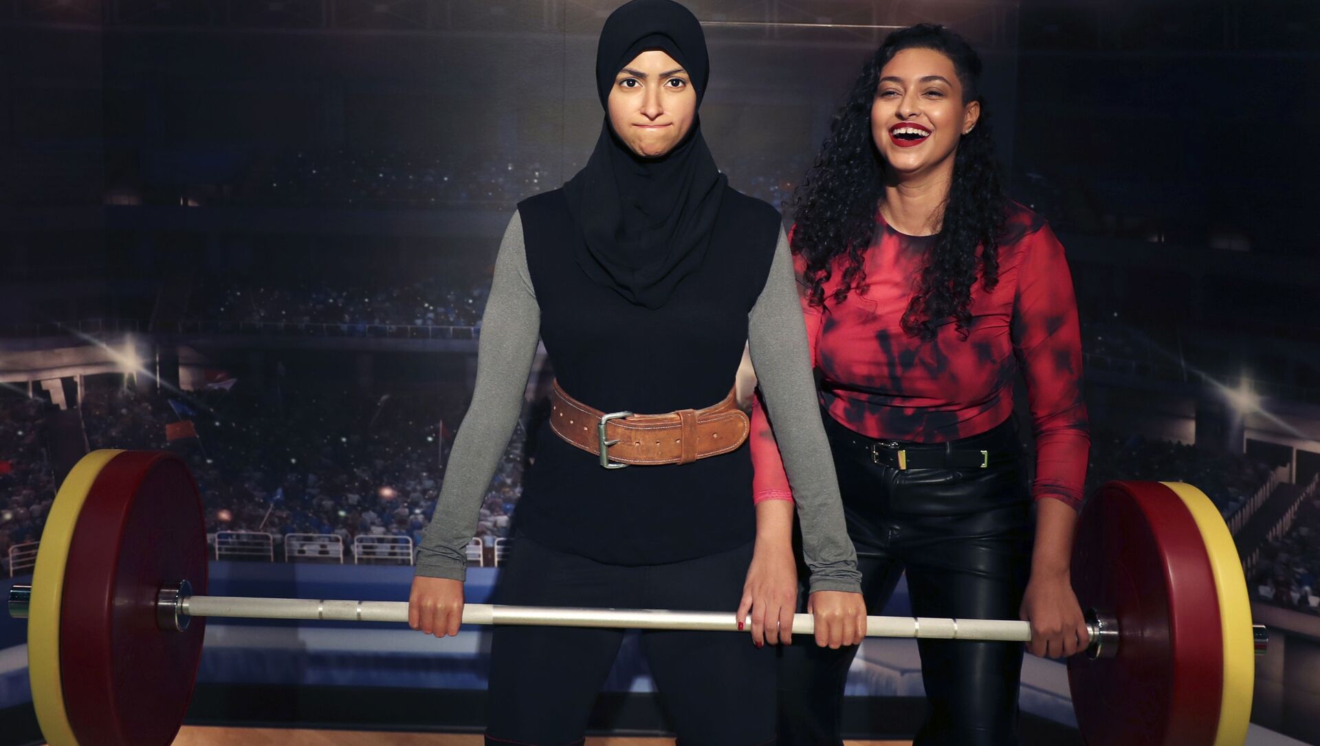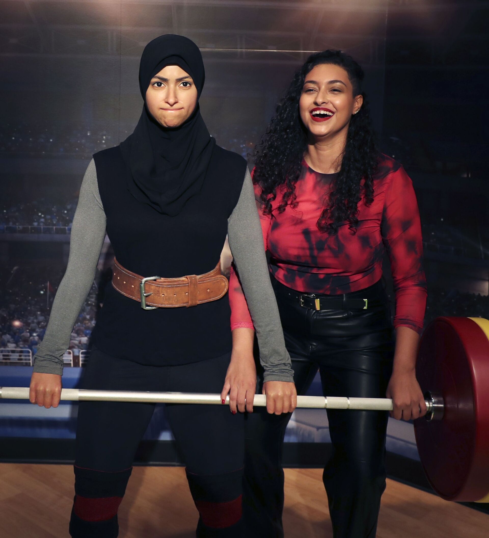 آمنة الحداد، بطلة رفع الأثقال الإماراتية تقف مع تمثالها الشمعي في افتتاح متحف "مدام توسو دبي"، الإمارات العربية المتحدة، 13 أكتوبر 2021