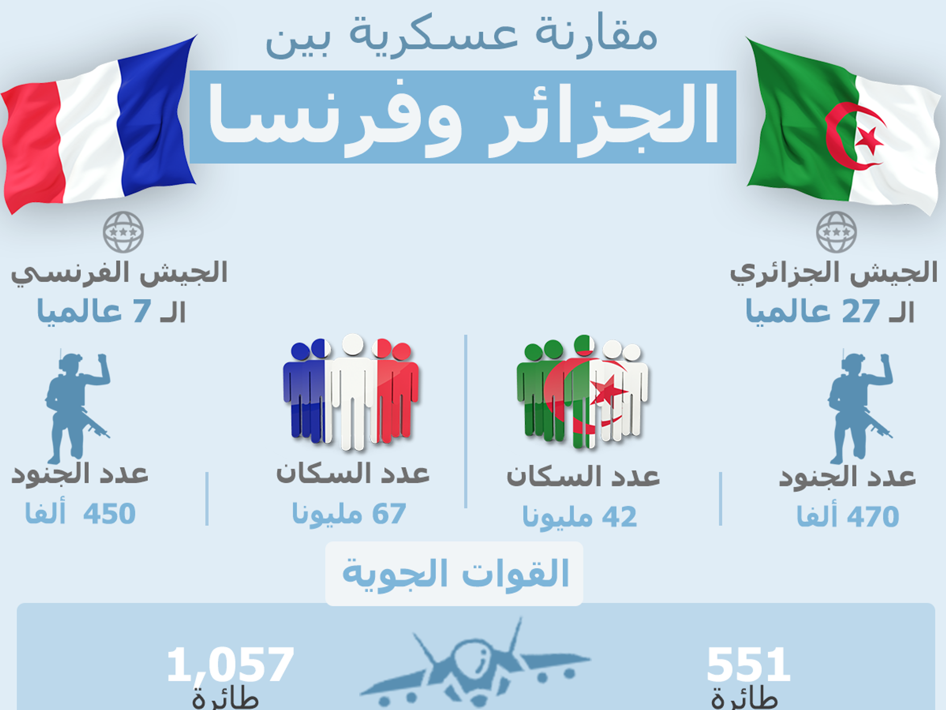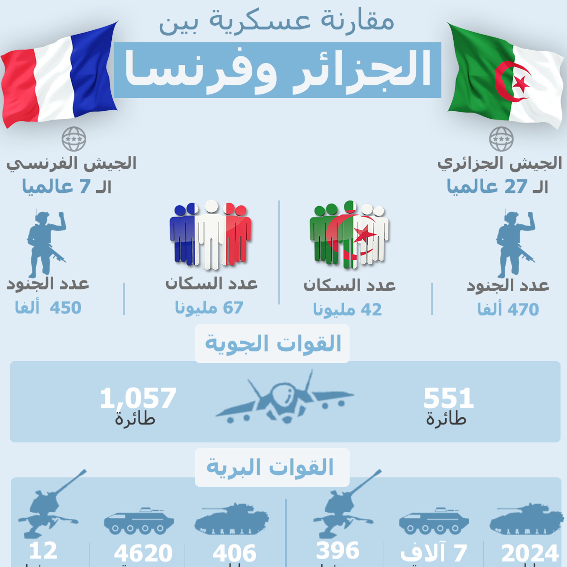 يحتل الجيش الجزائري المرتبة رقم 27 بين أقوى 140 جيشا في العالم ويصنف في المرتبة رقم 2 بين أقوى الجيوش الأفريقية، بينما يحتل الجيش الفرنسي المرتبة رقم 7 عالميا.