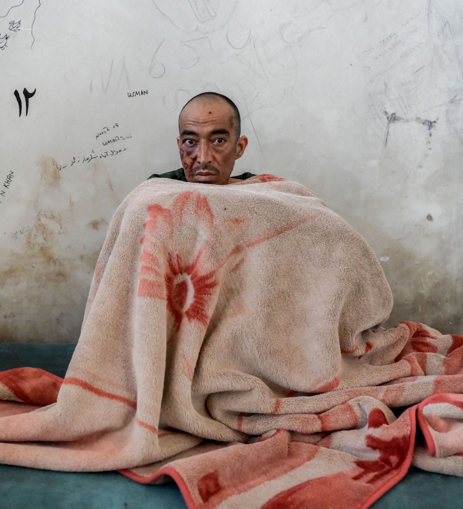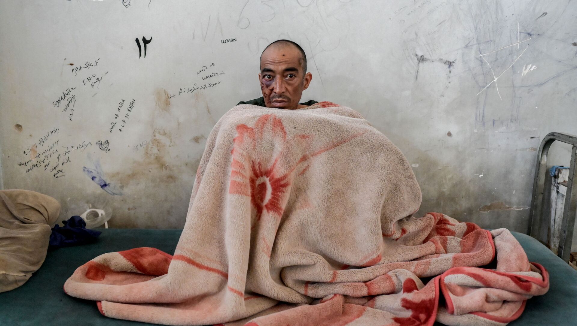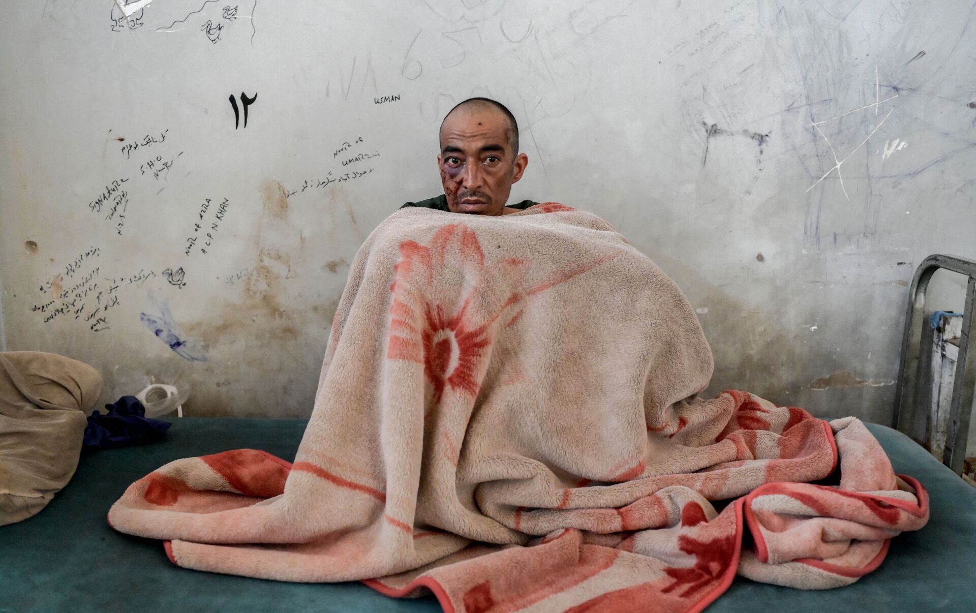 مدمنو مخدرات يقفون في ممر منتظرين دورهم للغتسال قبل توجههم إلى جناح إزالة السموم، في مستشفى ابن سينا الطبي للعلاج من تعاطي المخدرات في كابول، أفغانستان 16 أكتوبر 2021