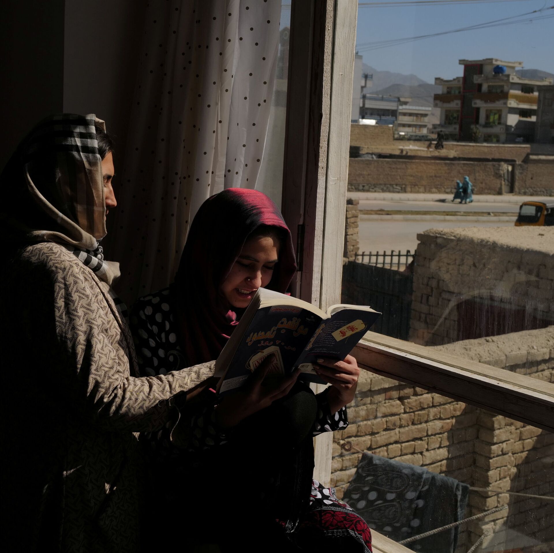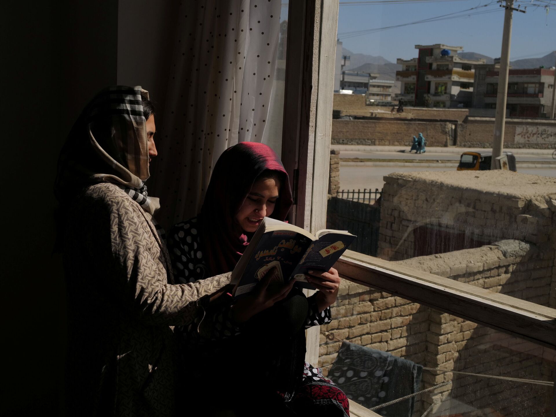 حواء، 20 عامًا، طالبة في السنة الثالثة في الأدب الروسي في جامعة برهان الدين رباني (التي أعيدت تسميتها من قبل طالبان إلى جامعة كابول التعليمية)، تقرأ كتابًا مع أختها على حافة النافذة في منزلهم في كابول ، أفغانستان، 23 أكتوبر 2021.