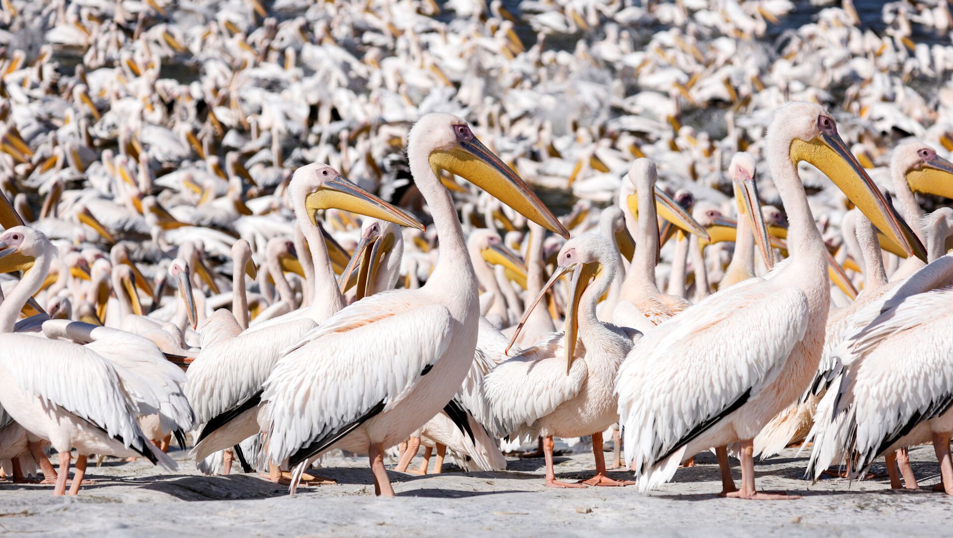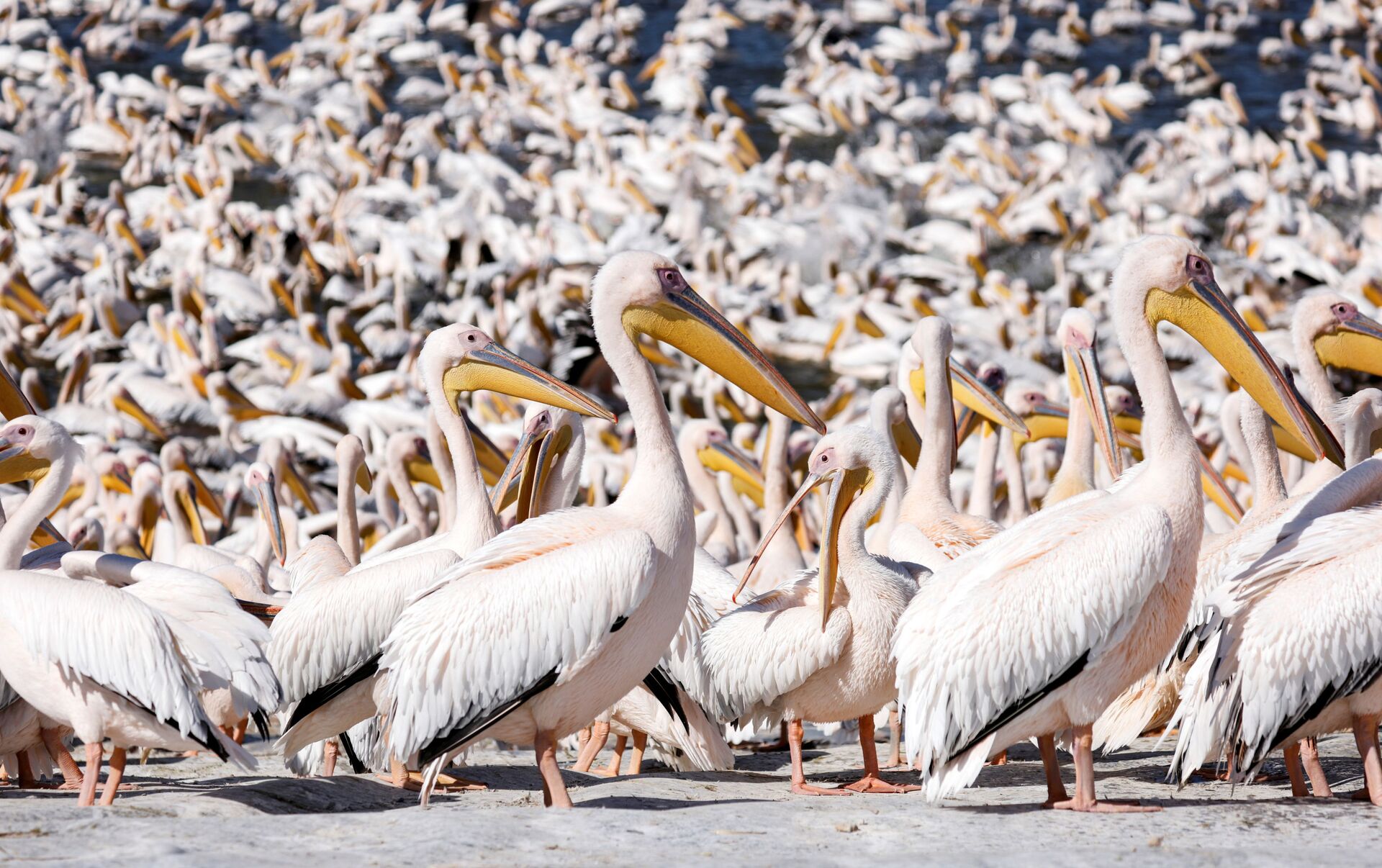 وتشاهدون في ألبوم "سبوتنيك" تصوير جوي لطيور البجع الأبيض العملاق في خزان مياه في وادي حيفر شمال تل أبيب.