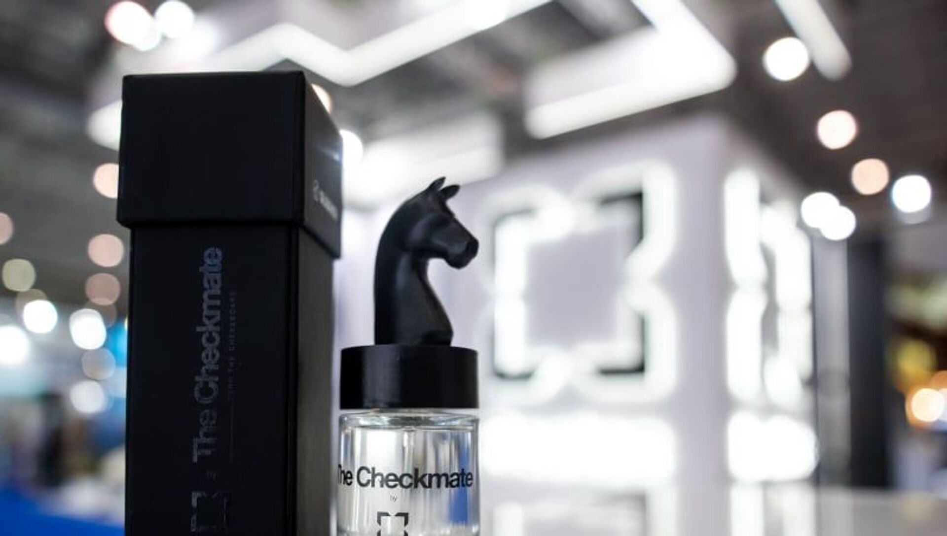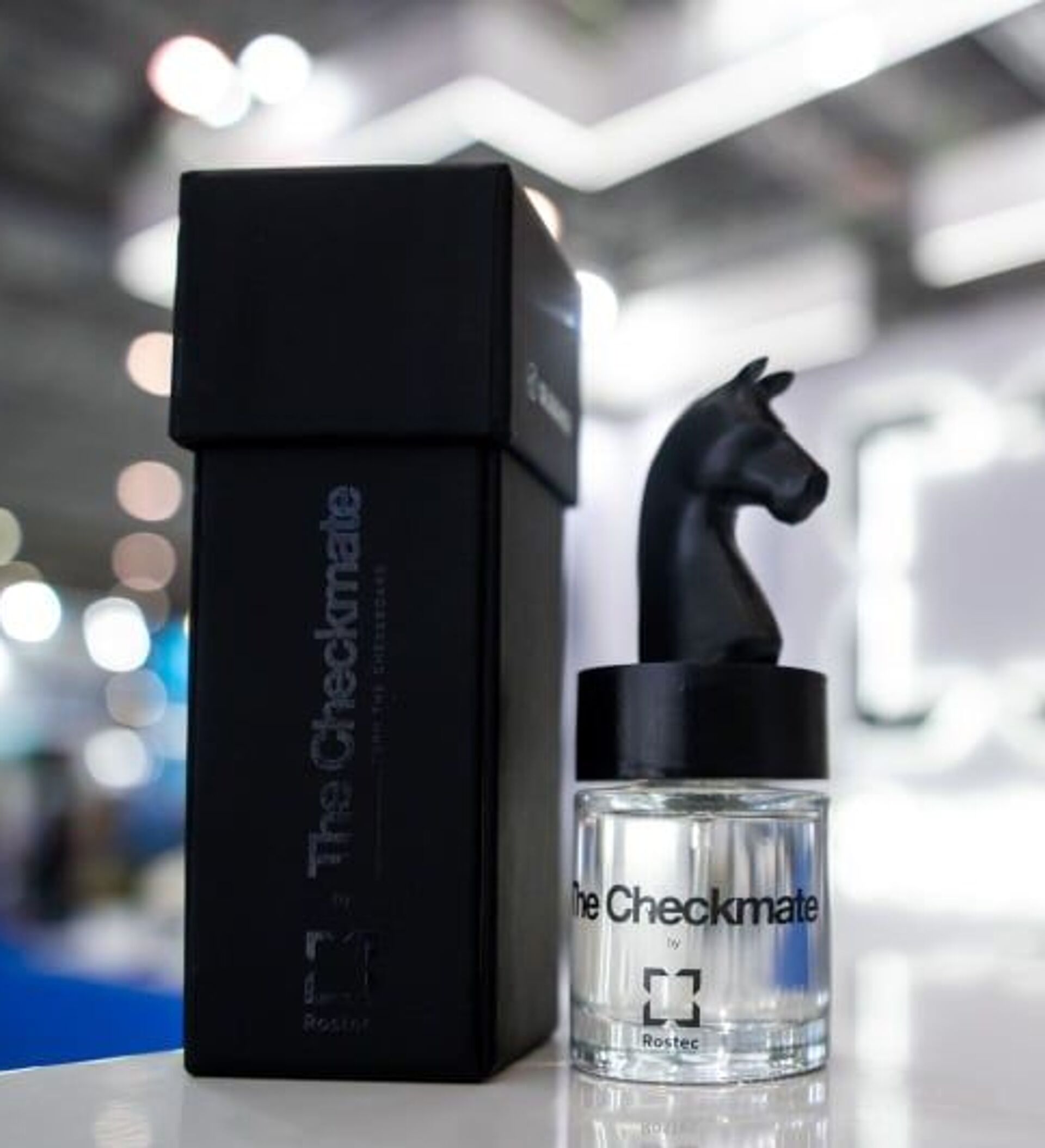 زجاجة العطر مصنوعة على شكل حصان شطرنج أسود وهو أحد رموز المقاتلة.