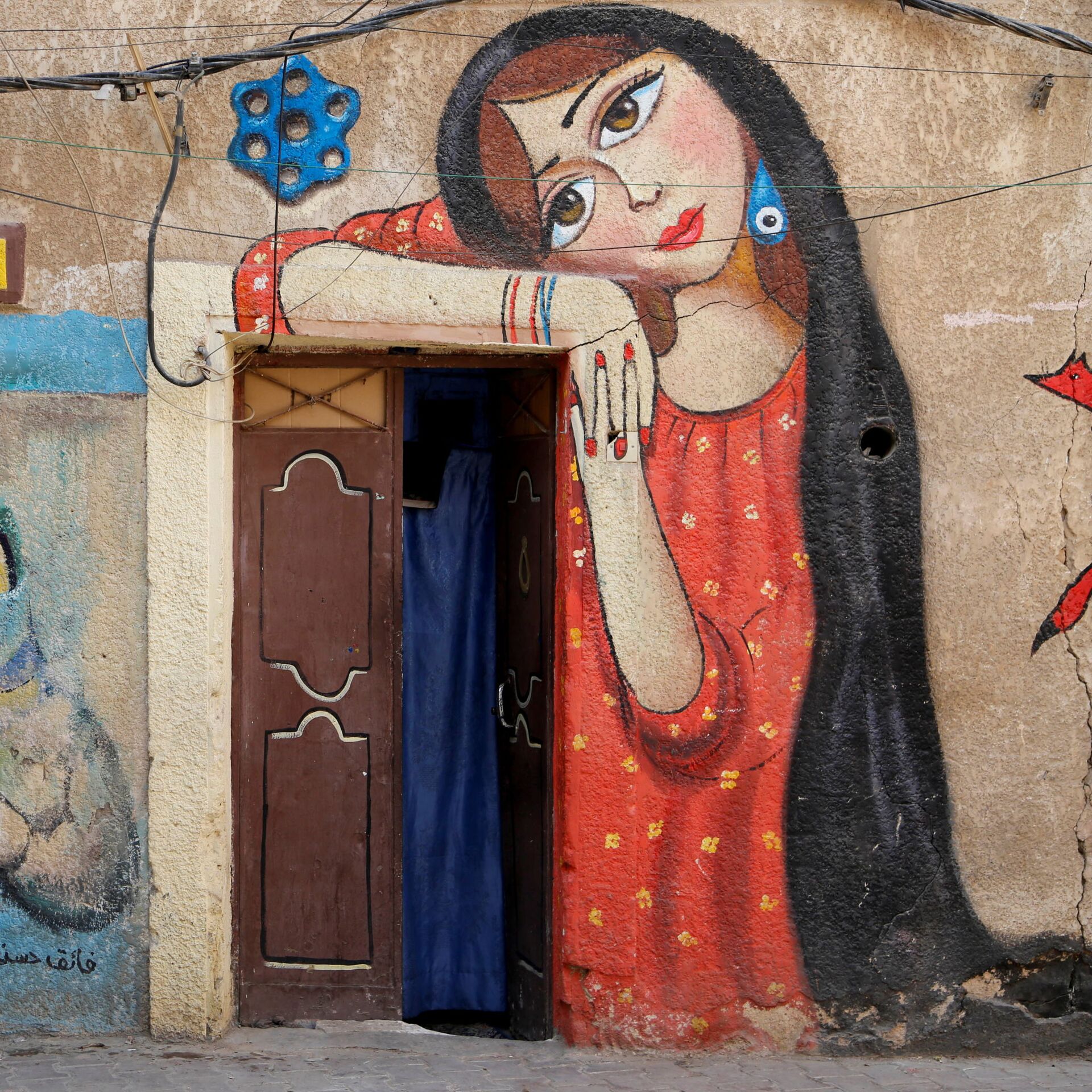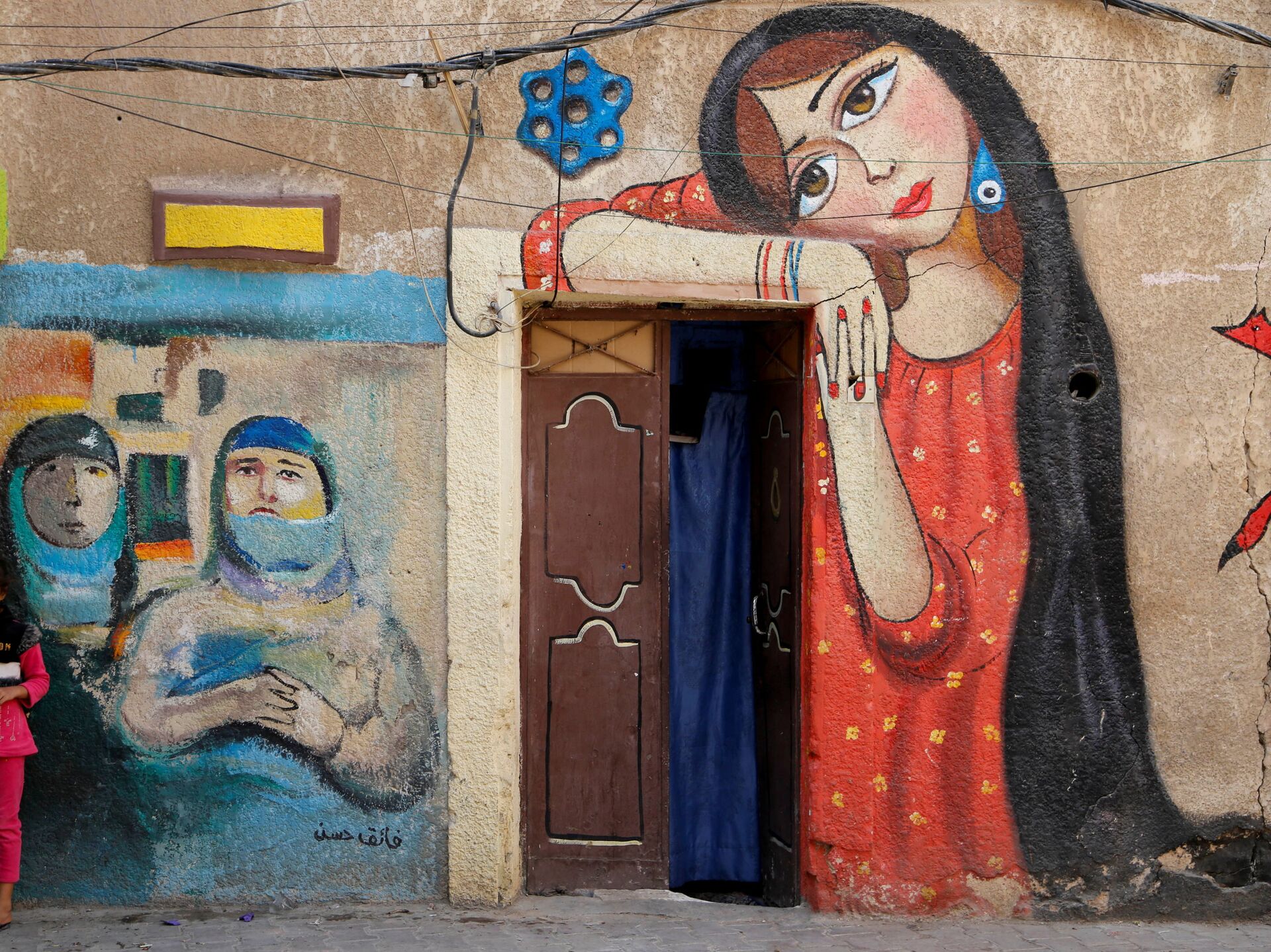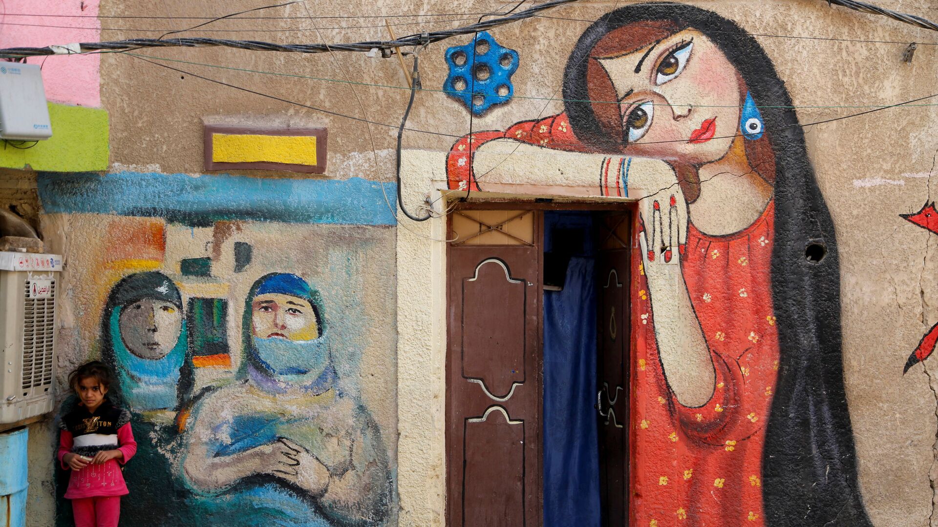 لوحة جدارية رسمتها مجموعة من الرسامين العراقيين الذين تطوعوا لطلاء جدران منازل الأحياء القديمة لتزيين مدينتهم في حي الكاظمية في بغداد، العراق، 30 نوفمبر 2021