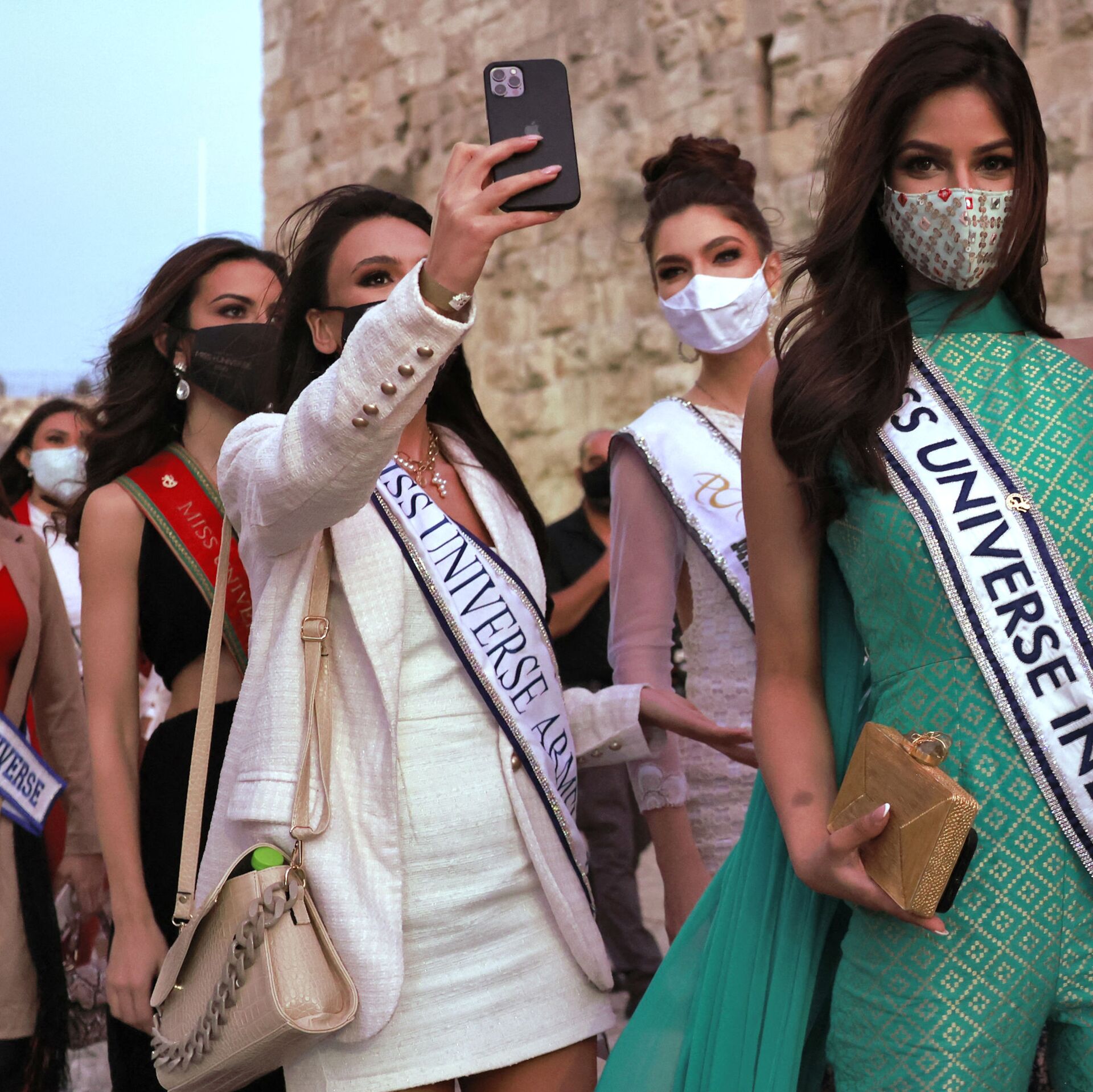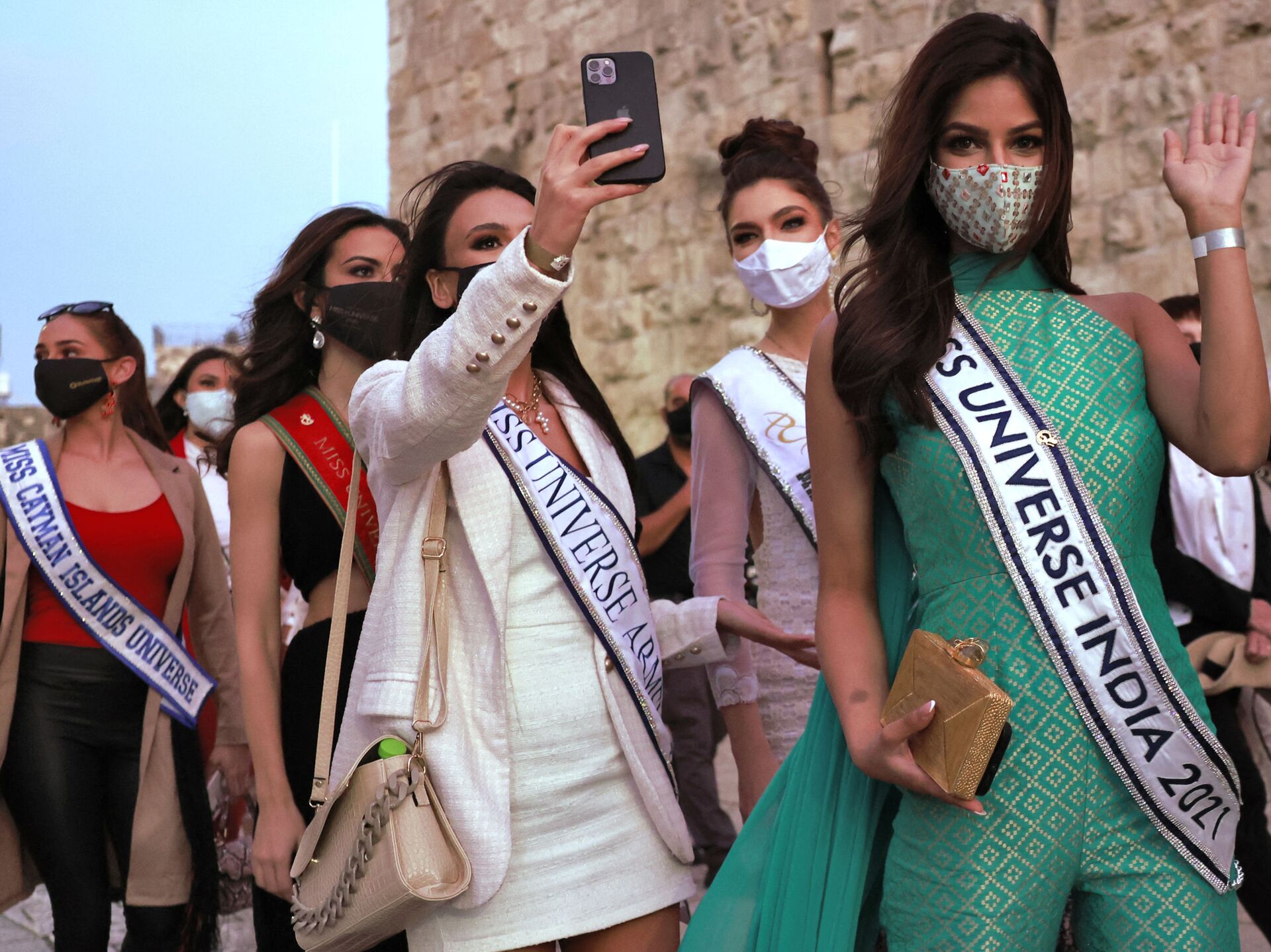 متسابقات "ملكة جمال الكون" يلتقطن صور سيلفي في برج داوود في المدينة القديمة بالقدس، قبل مسابقة ملكة الجمال السنوية التي ستقام في منتجع إيلات المطل على البحر الأحمر، 30 نوفمبر 2021.