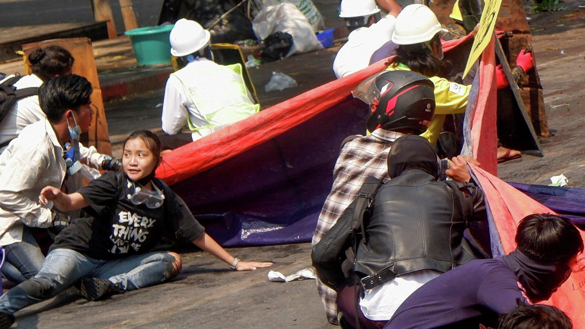 المتظاهرون يرقدون على الأرض بعد أن فتحت الشرطة النار لتفريق مظاهرة مناهضة للانقلاب في ماندالاي، ميانمار، 3 مارس/ آذار 2021 - سبوتنيك عربي, 1920, 05.12.2021