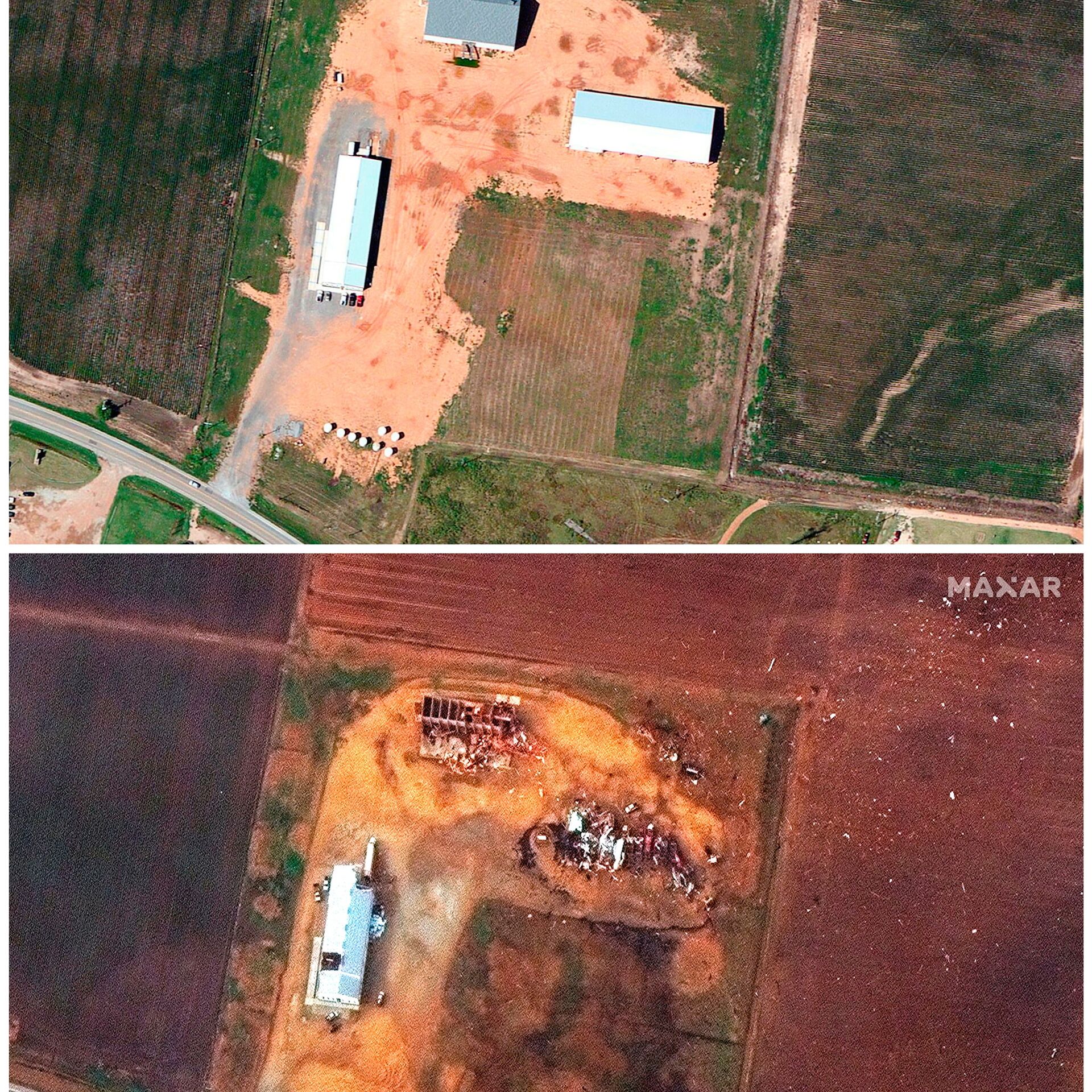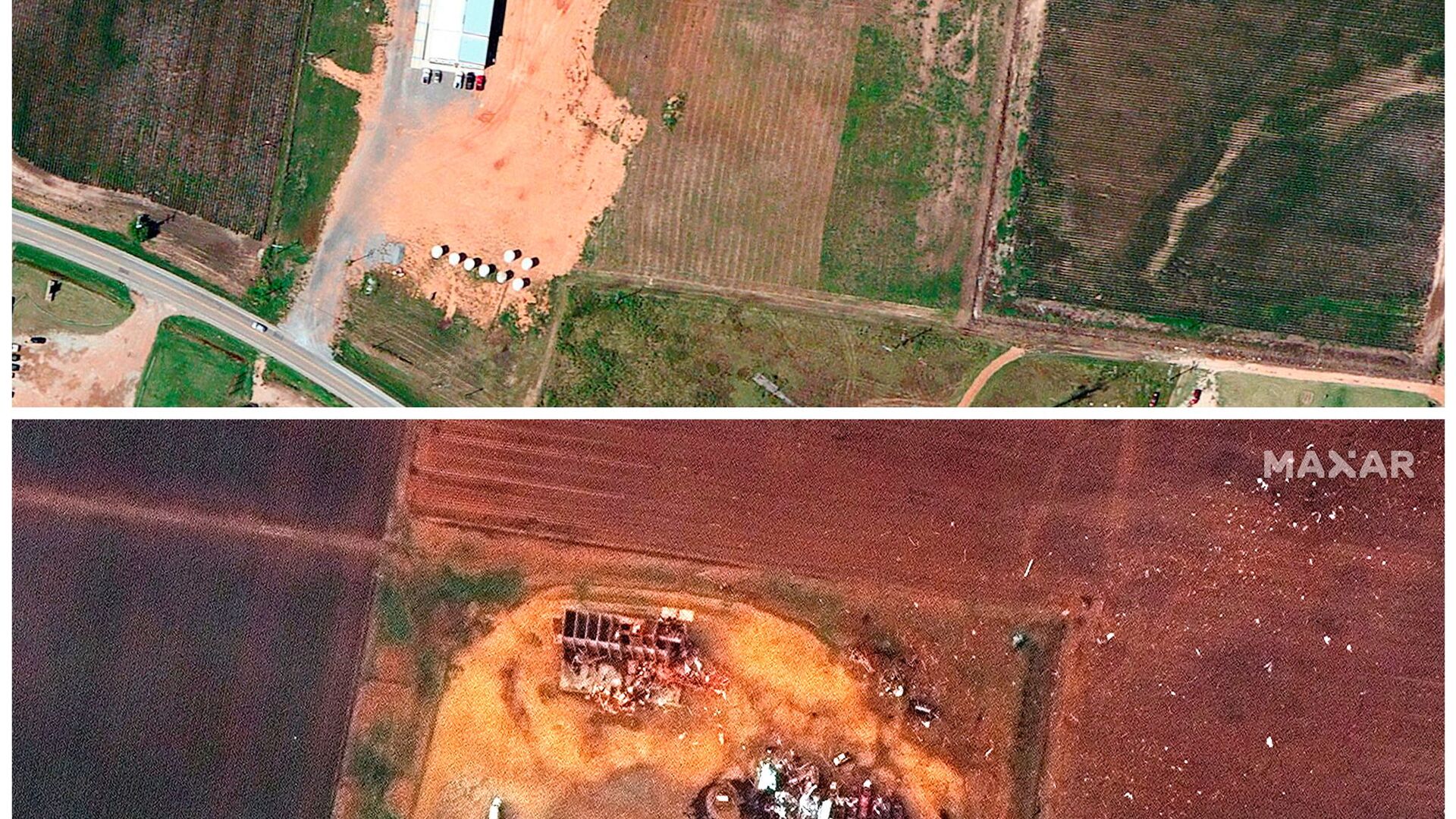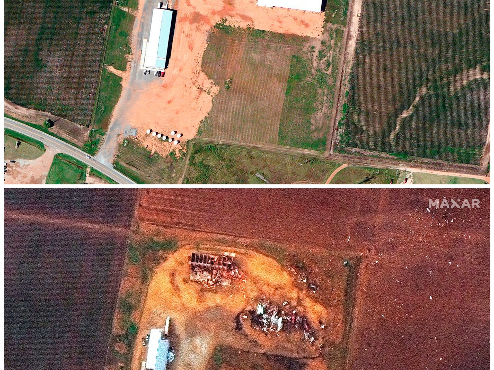 تُظهر مجموعة من صور الأقمار الصناعية مباني زراعية في مونيت، ولاية أركنساس الأمريكية، قبل وبعد اندلاع مدمر للأعاصير التي اجتاحت العديد من الولايات الأمريكية، في 22 فبراير 2021 (أعلى) و 11 ديسمبر 2021 (أسفل)