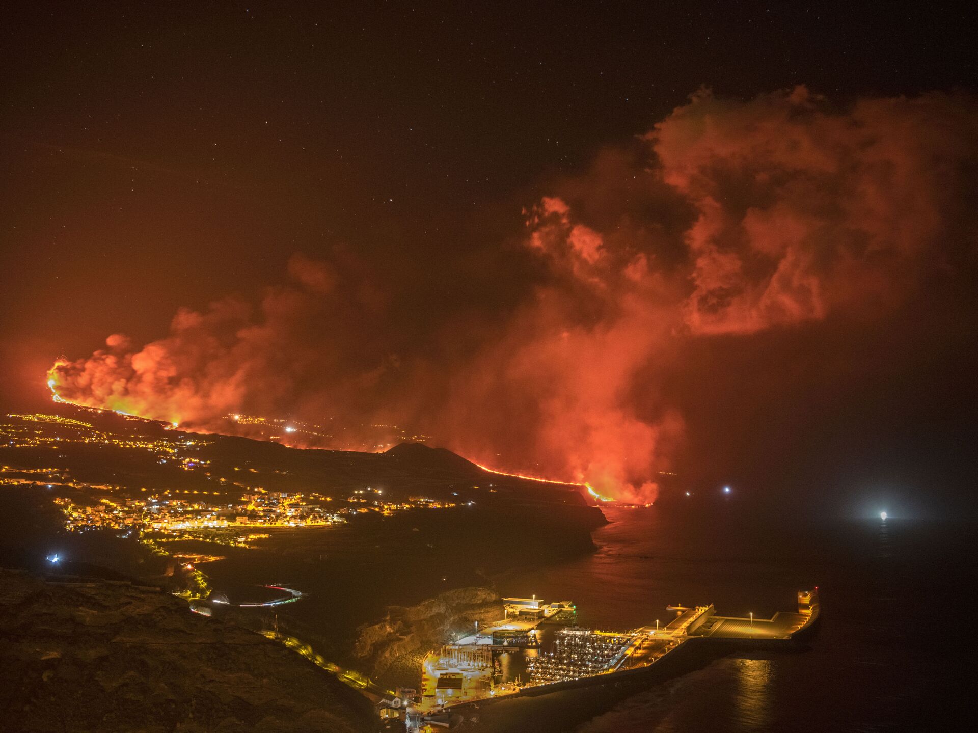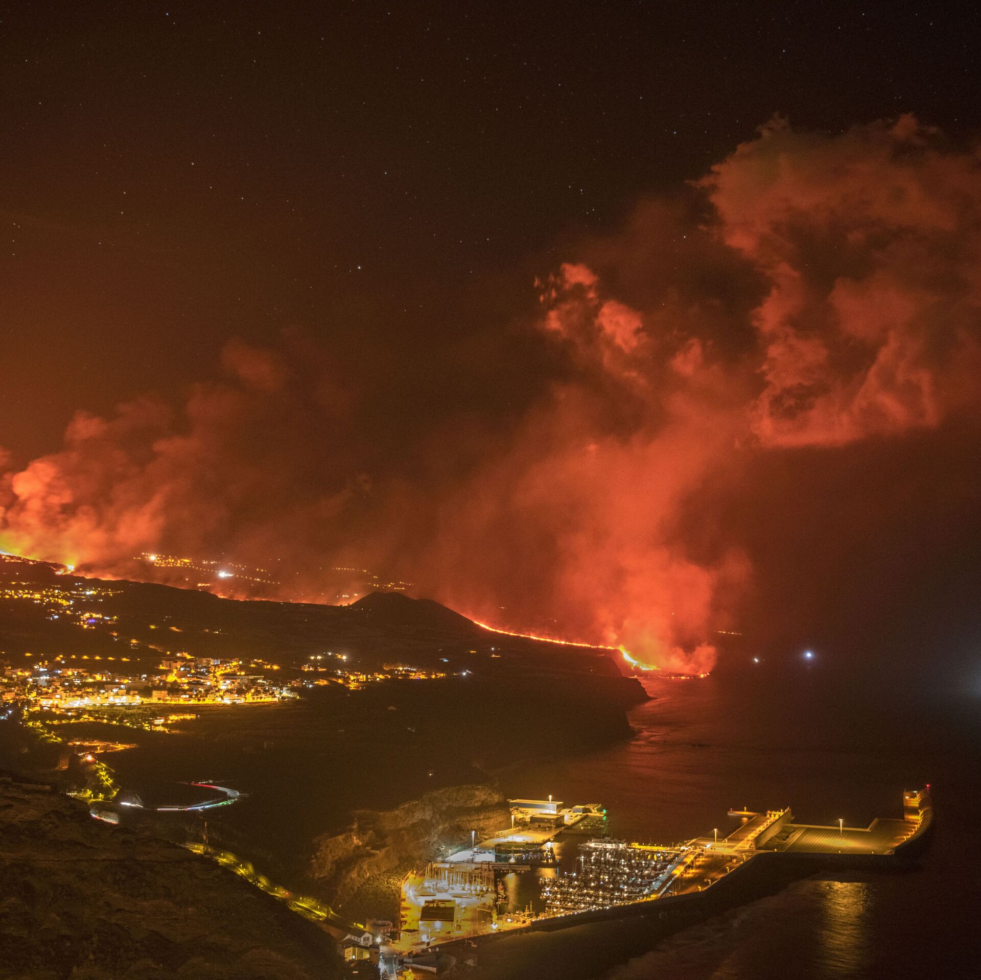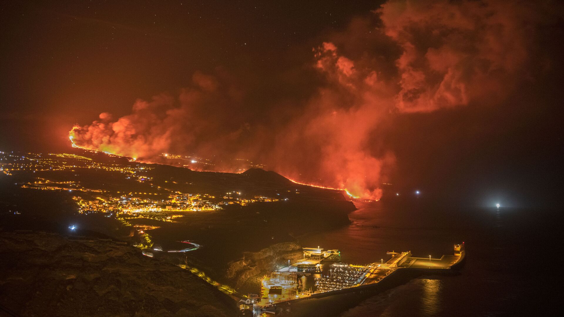 الحمم البركانية تصل البحر في جزيرة لا بالما بإسبانيا، 29 سبتمبر 2021. وصلت الحمم البركانية من بركان ثار في 19 سبتمبر/ أيلول من العام الجاري في جزر الكناري الإسبانية أخيرًا إلى المحيط الأطلسي بعد القضاء على مساحات شاسعة من الأراضي ومئات المنازل وإجلاء آلاف السكان.