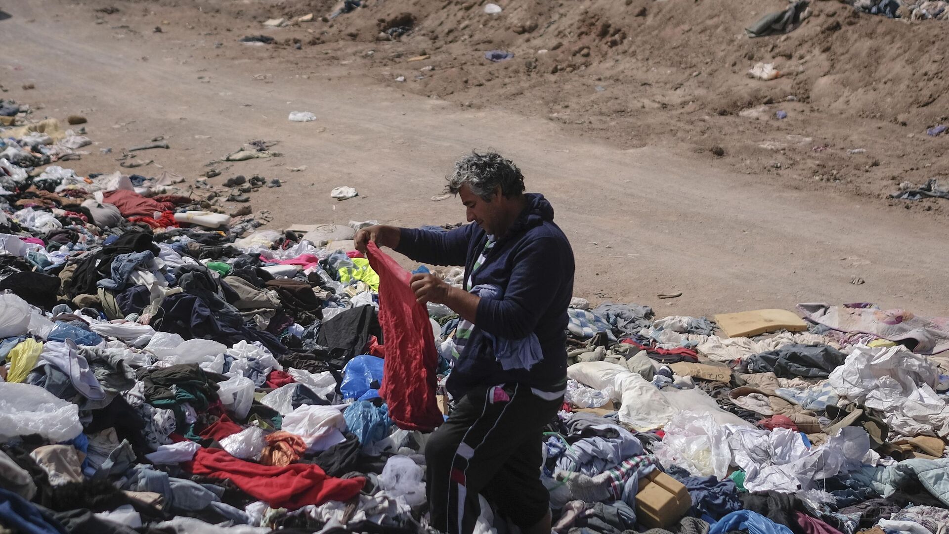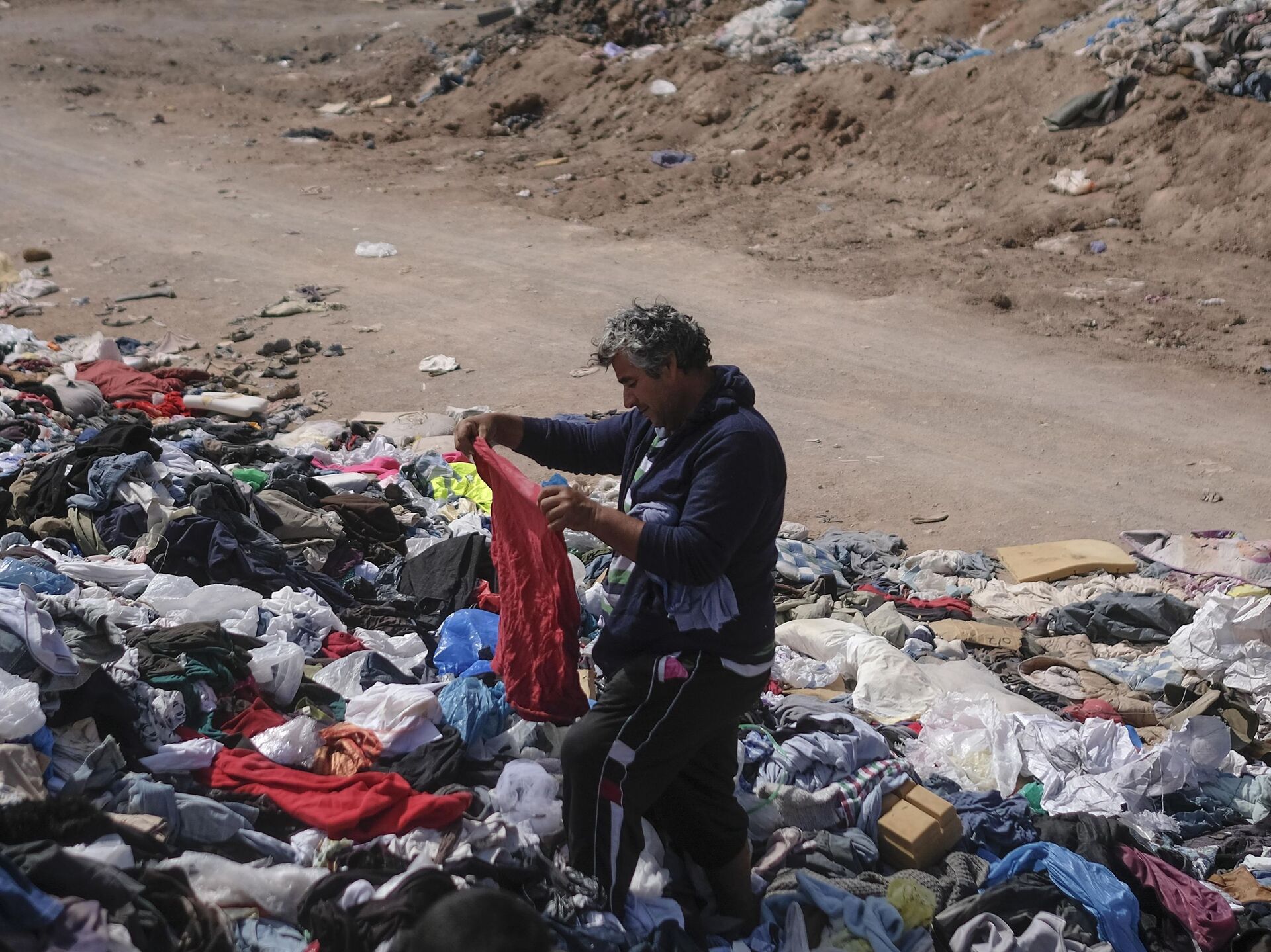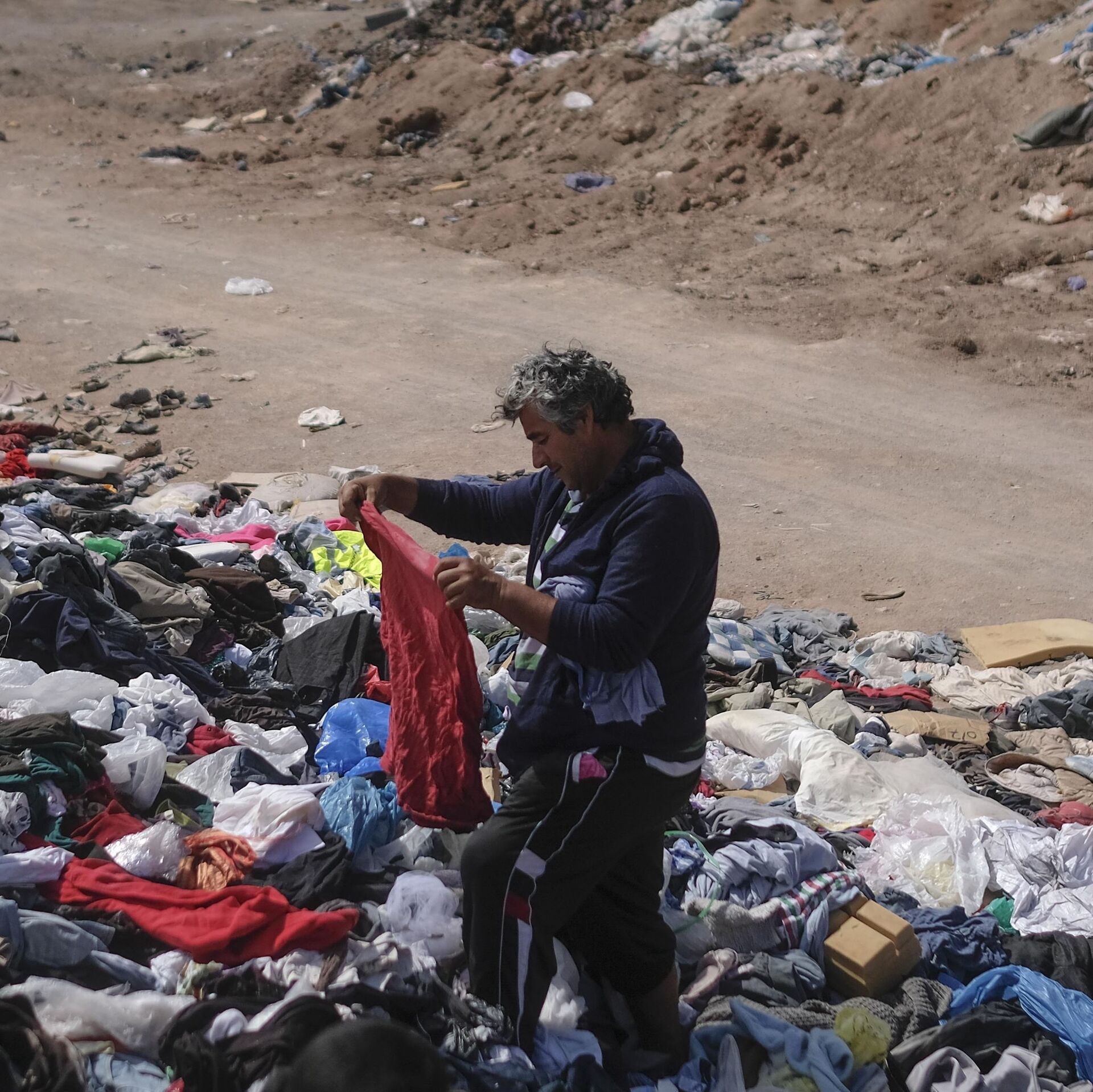 © AP Photo / Matias Delacroixألكسيس كارينو يتفقد قطعة من الملابس في كومة كبيرة من الملابس المستعملة بالقرب من حي لا مولا في ألتو هوسبيسيو، تشيلي، 13 ديسمبر 2021