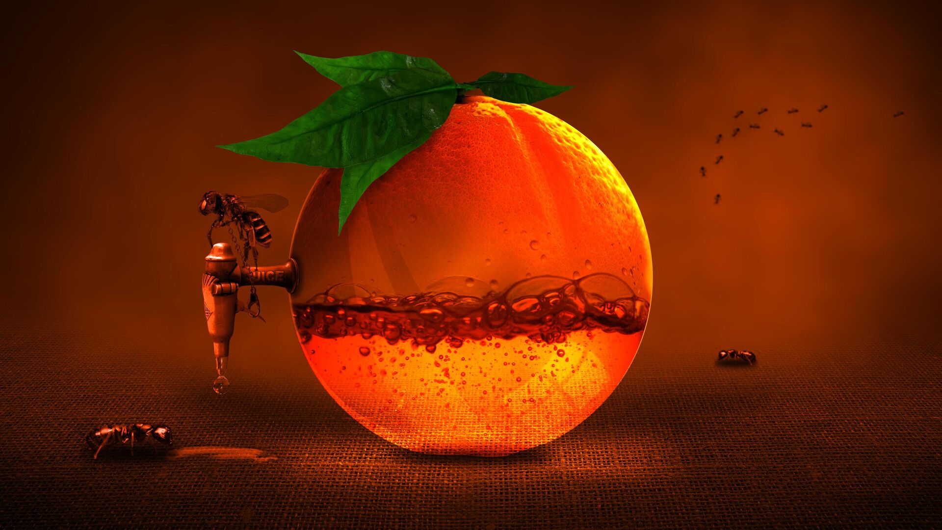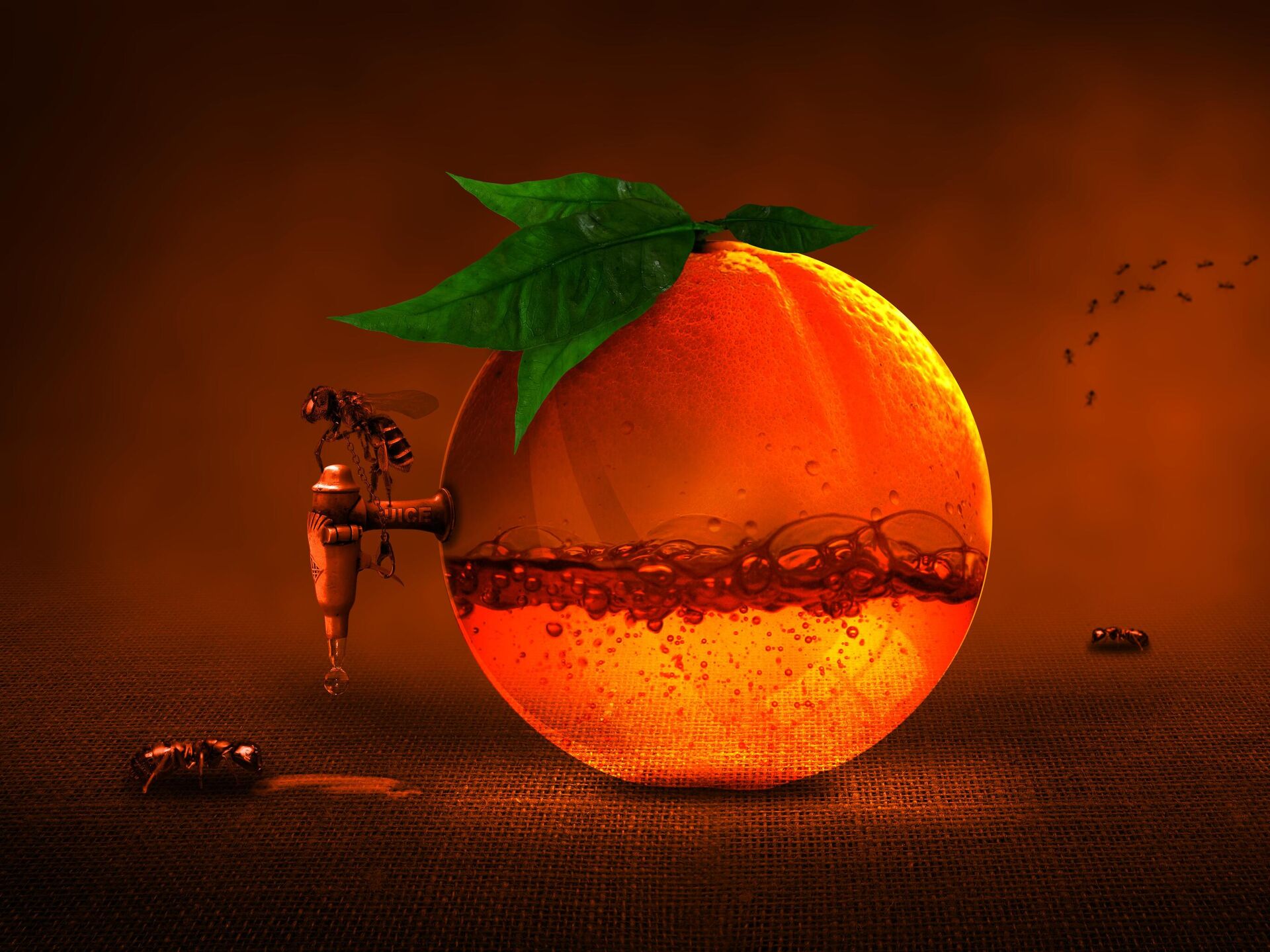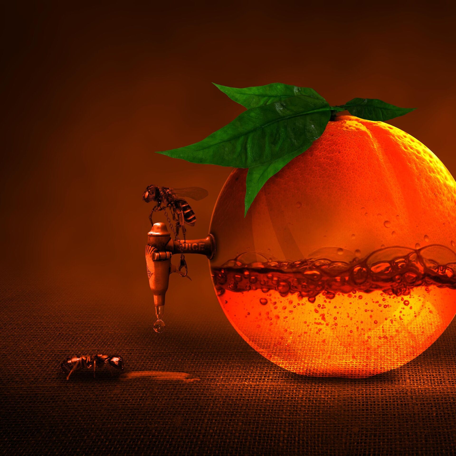 مشهد خيالي لنملتين تسربان من عصير برتقالة  - سبوتنيك عربي, 1920, 17.12.2021