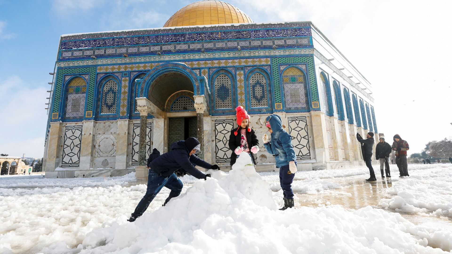 أطفال يصنعون رجل الثلج أمام قبة الصخرة، خلال صباح ثلجي في البلدة القديمة في القدس، 27 يناير  2022. - سبوتنيك عربي