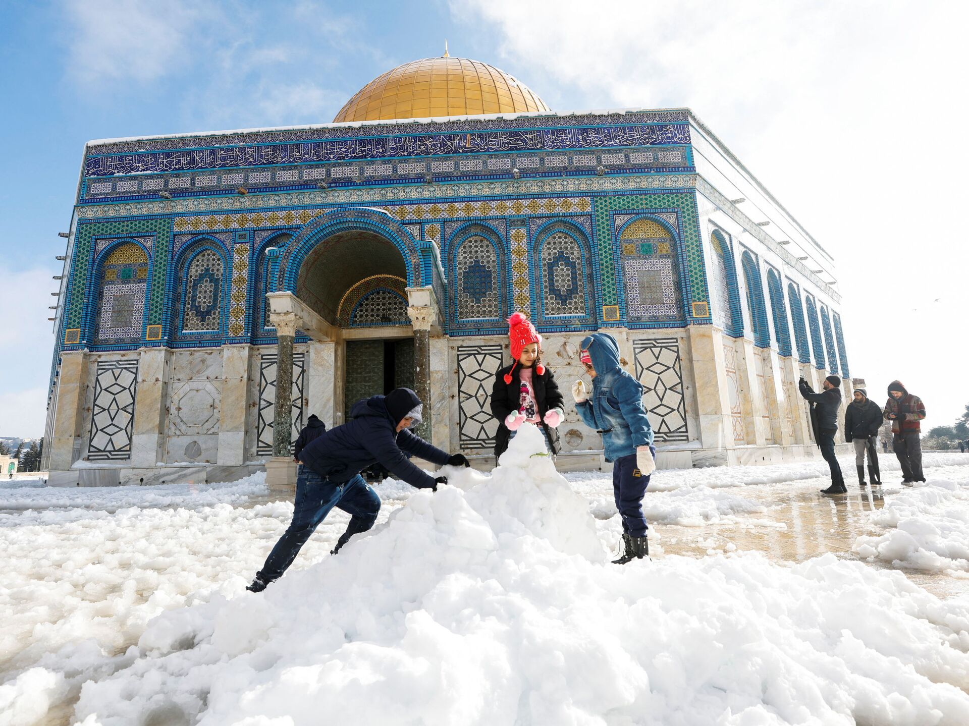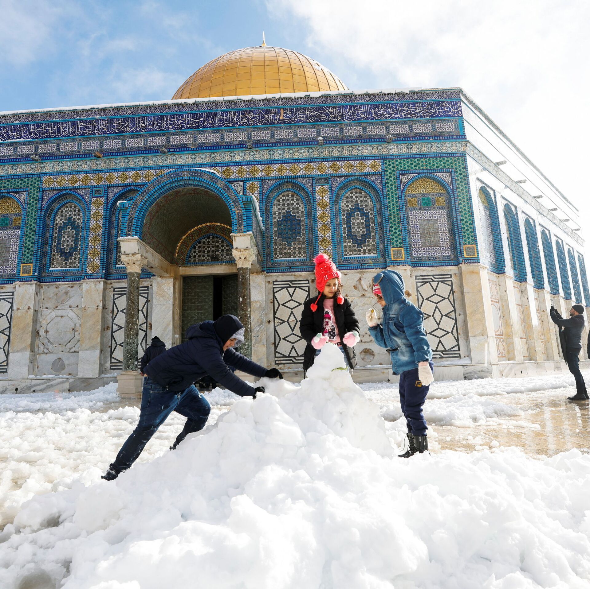 © REUTERS / Ammar Awadأطفال يصنعون رجل الثلج أمام قبة الصخرة، خلال صباح ثلجي في البلدة القديمة في القدس، 27 يناير 2022.
