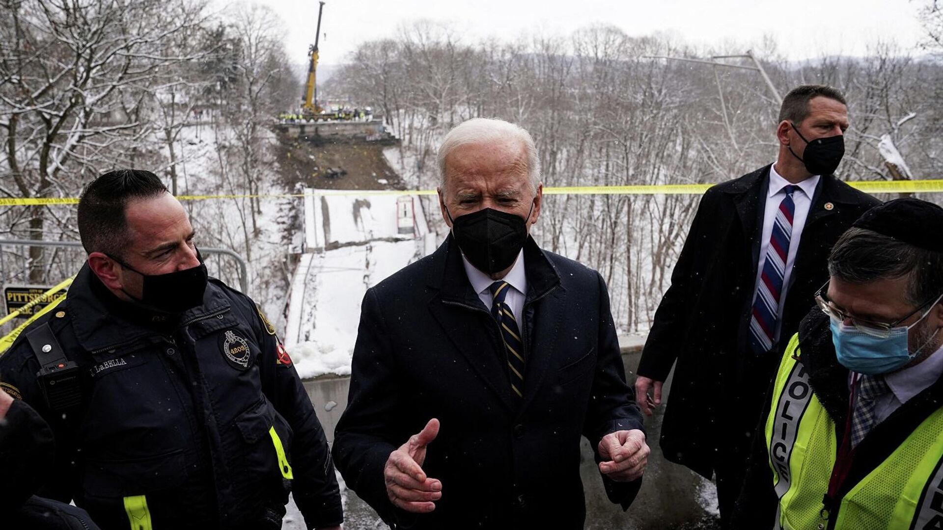 وتحدث بايدن مع المستجيبين الأوائل في مكان الحادث وعمدة بيتسبرغ إد جيني، بينما غطى الثلج الخفيف الحطام.