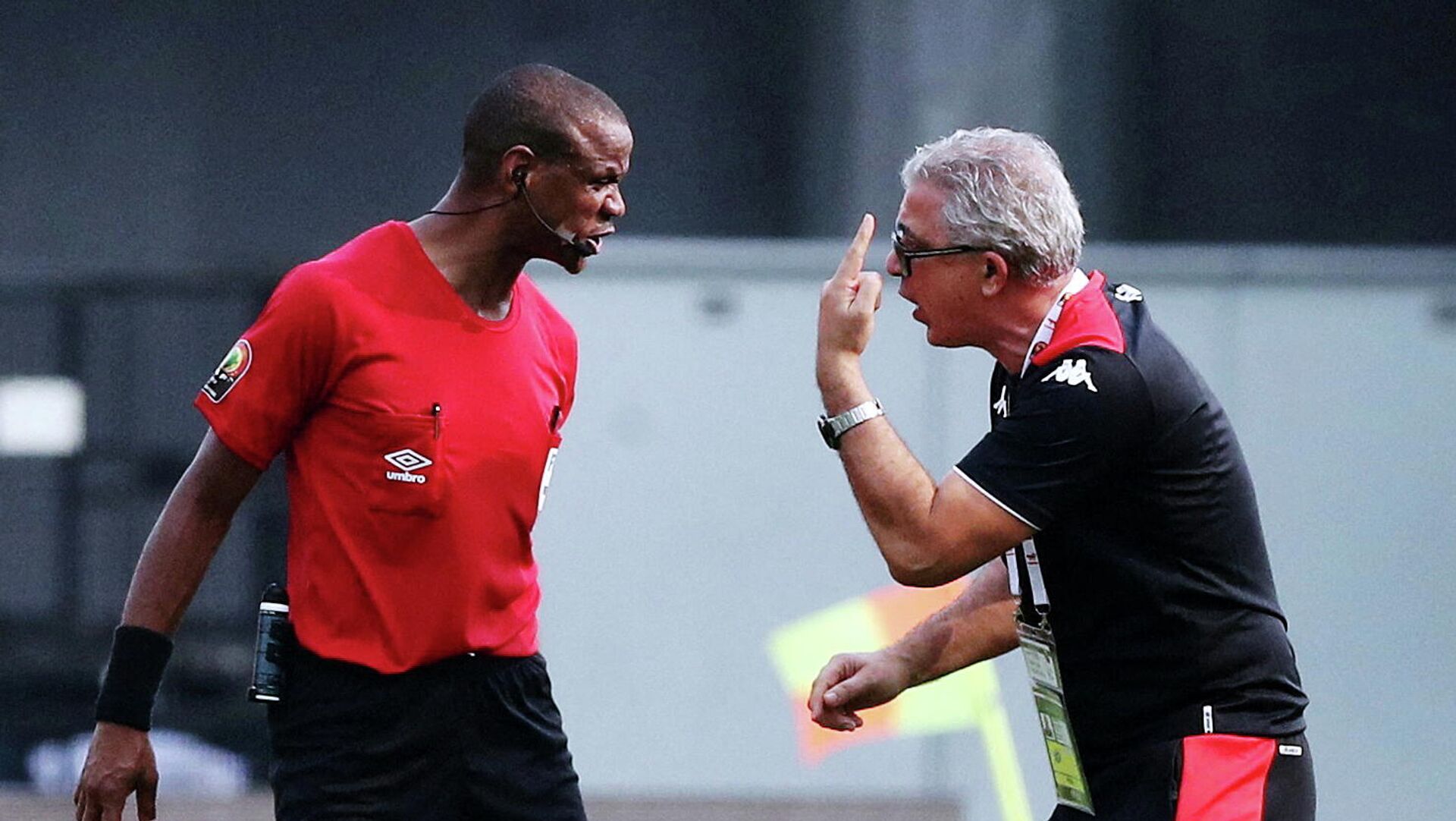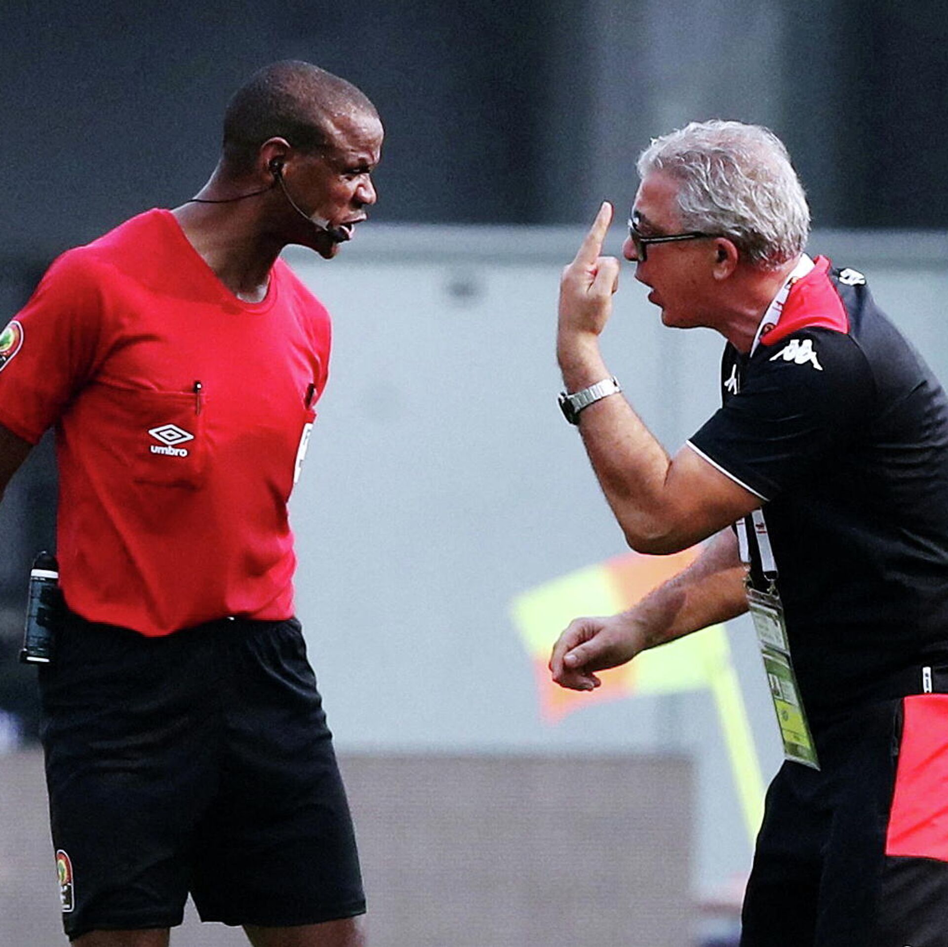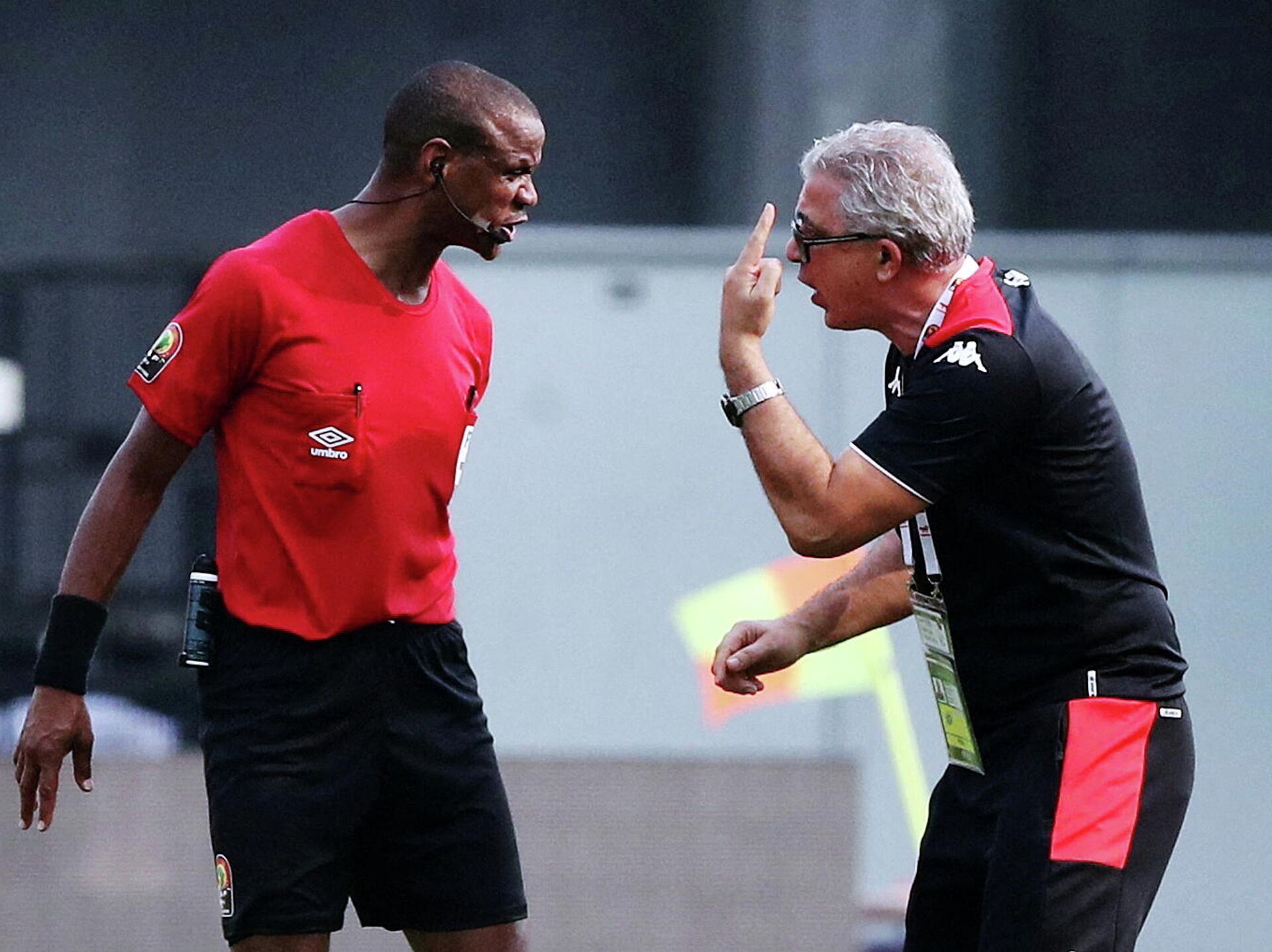 © REUTERS / MOHAMED ABD EL GHANYالحكم الزامبي جاني سيكازوي، مع مدرب منتخب تونس منذر الكبير أثناء مباراة تونس ومالي بالجولة الأولى من بطولة كأس أمم أفريقيا التي تستضيفها الكاميرون