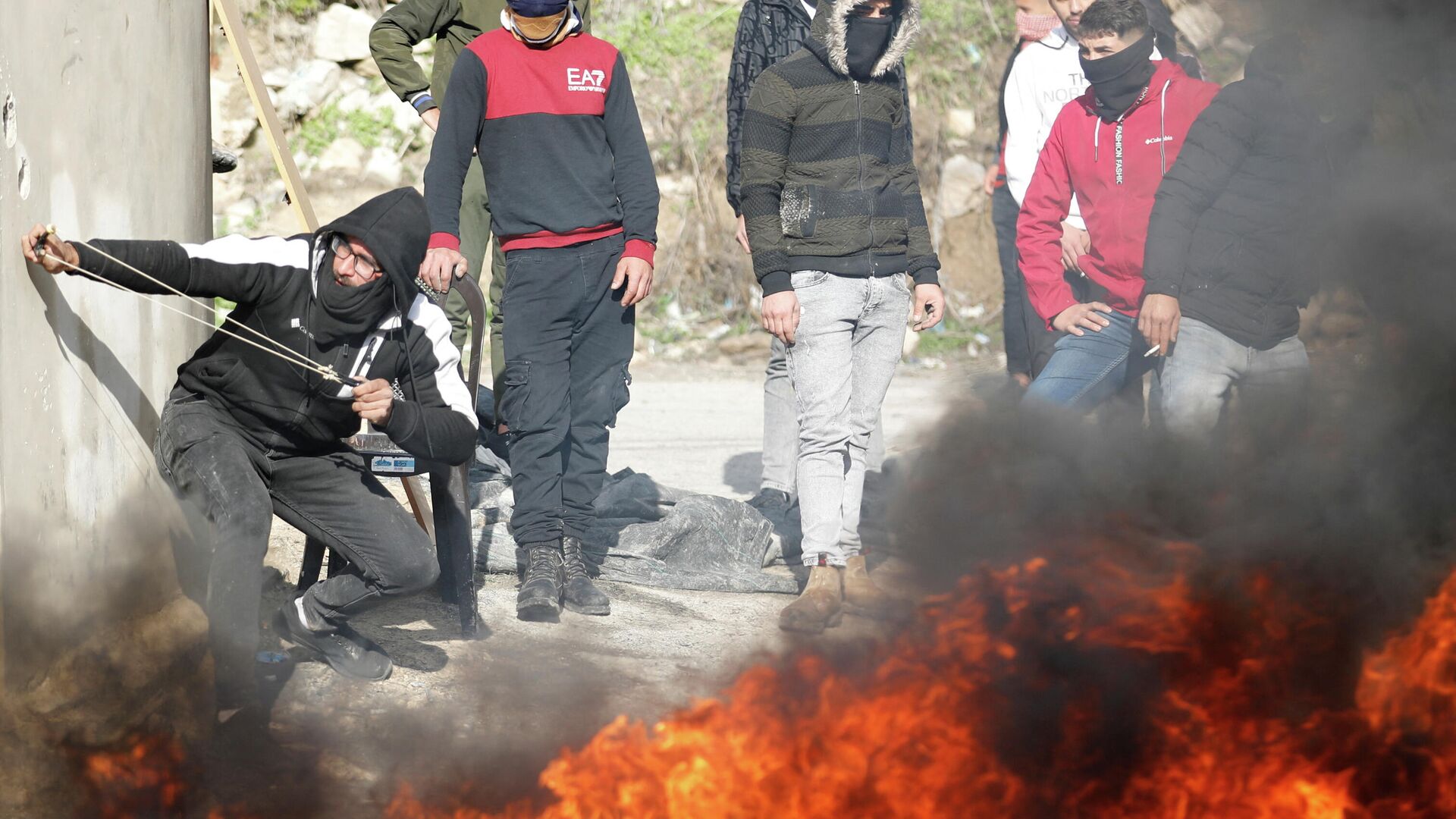 متظاهرون فلسطينيون أمام حاجز من الإطارات المشتعلة احتجاجاً على تشييد مستوطنة في قرية البرقة، الضفة الغربية المحتلة، 24 ديسمبر 2021 - سبوتنيك عربي, 1920, 12.02.2022